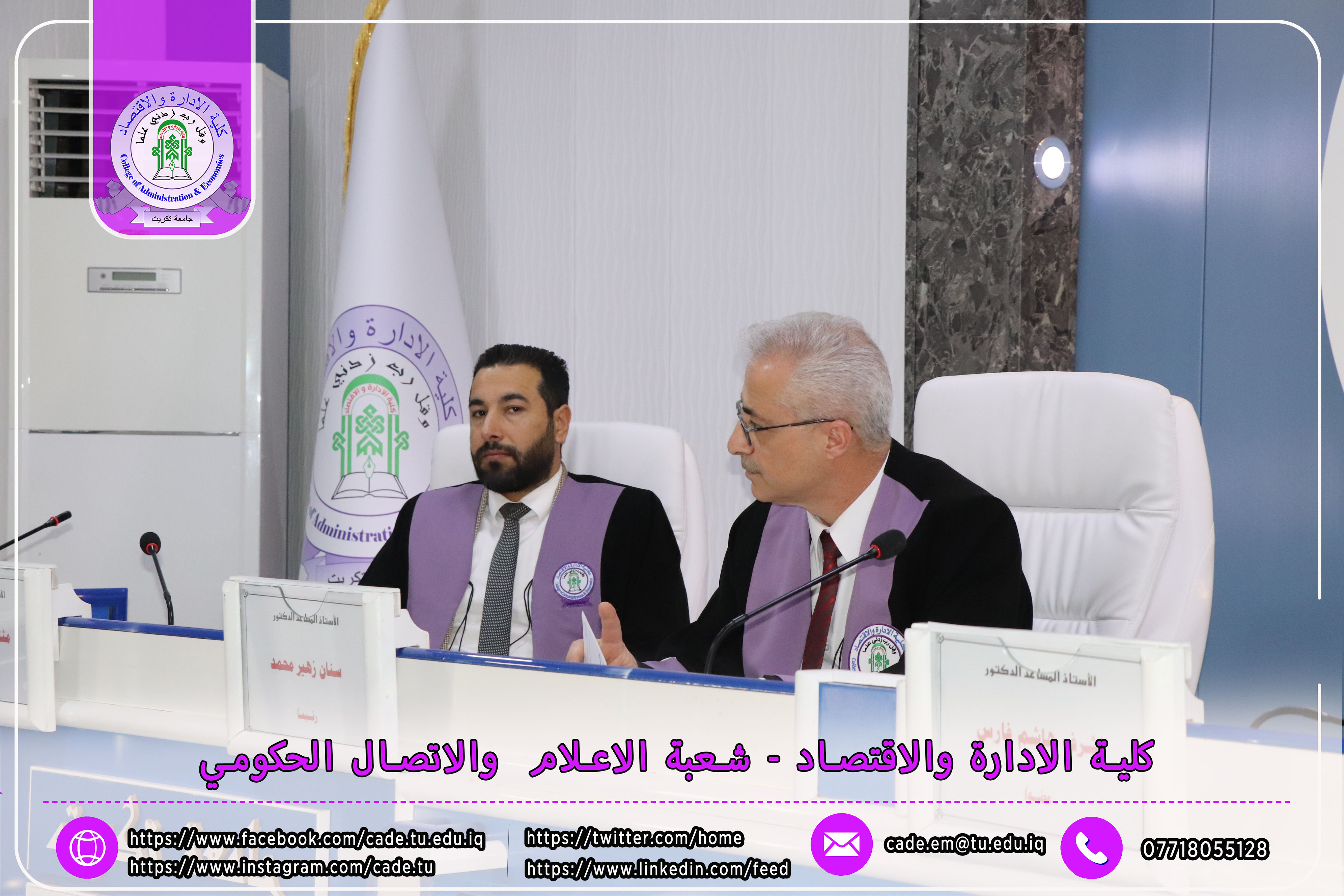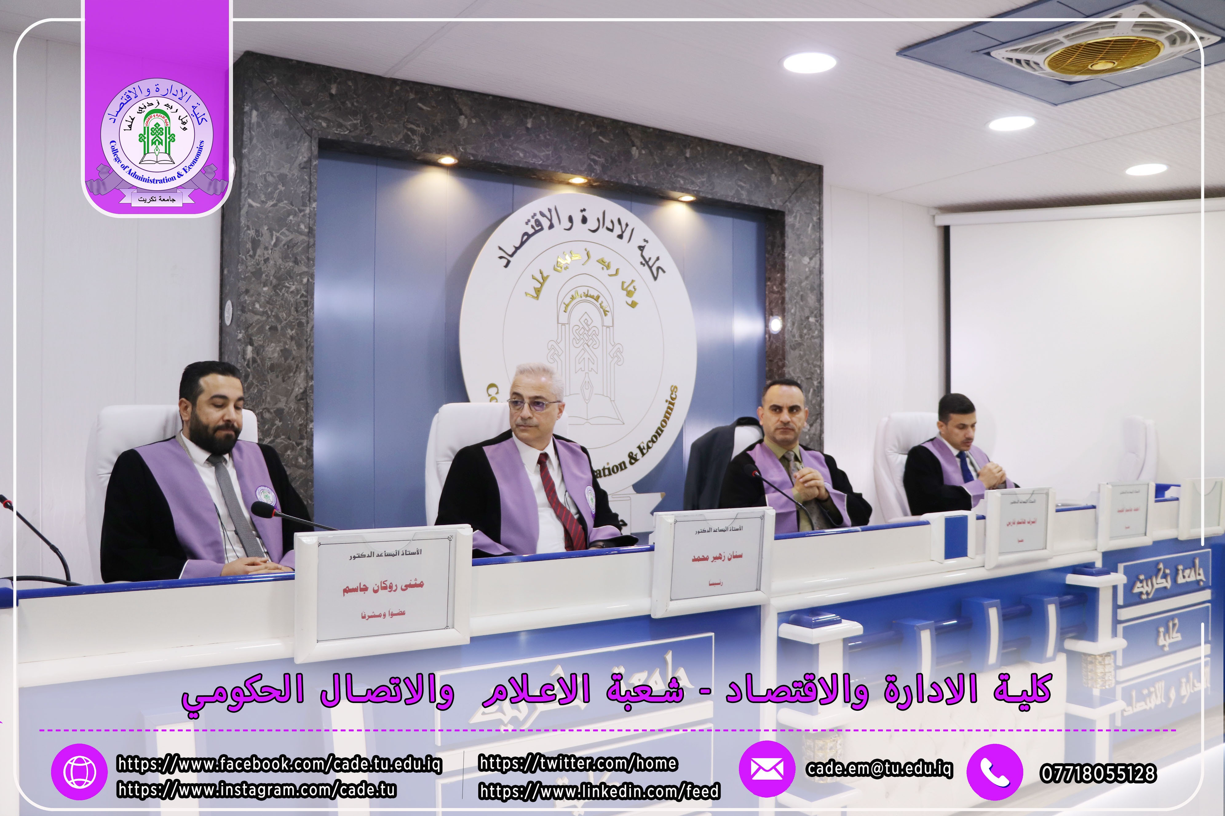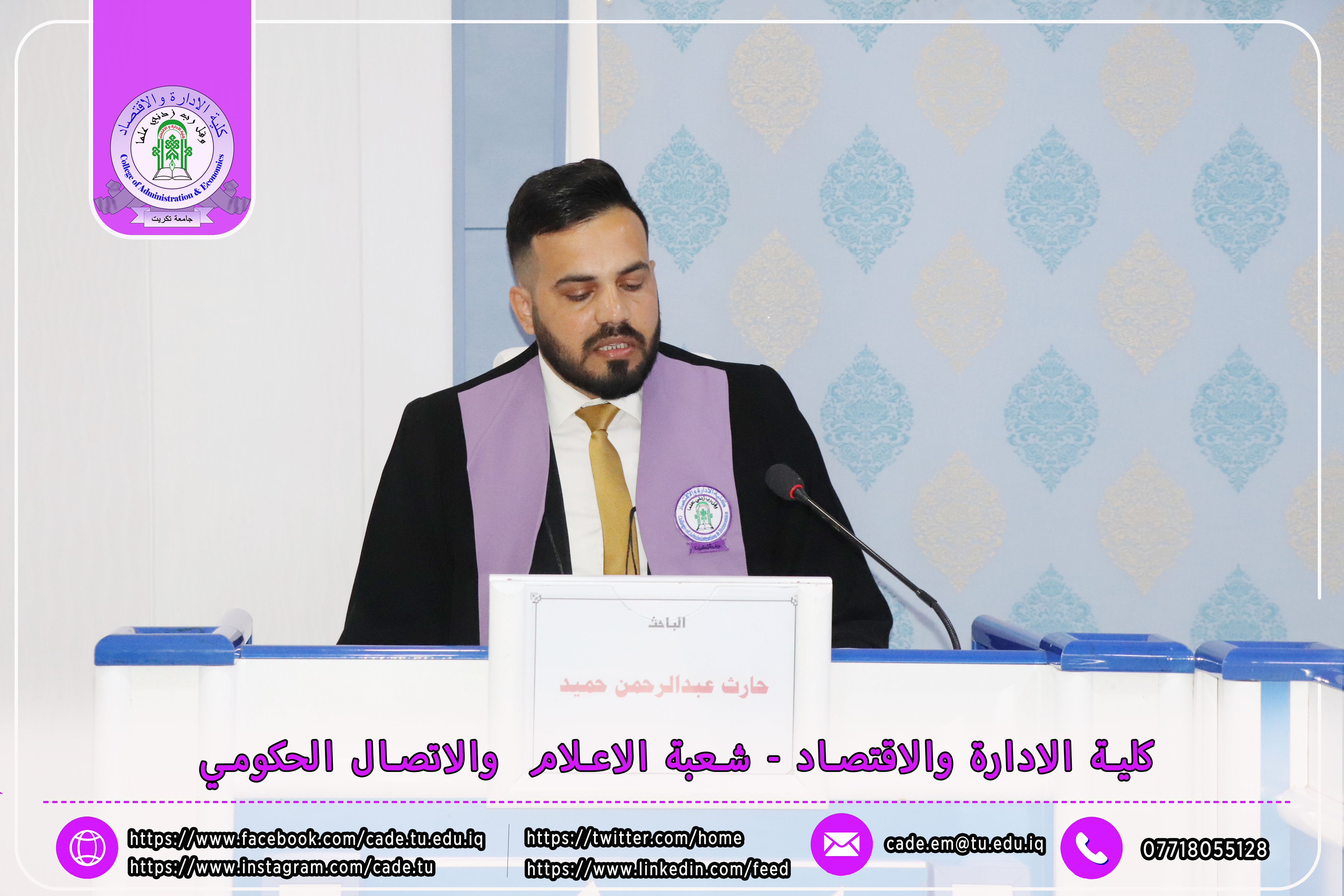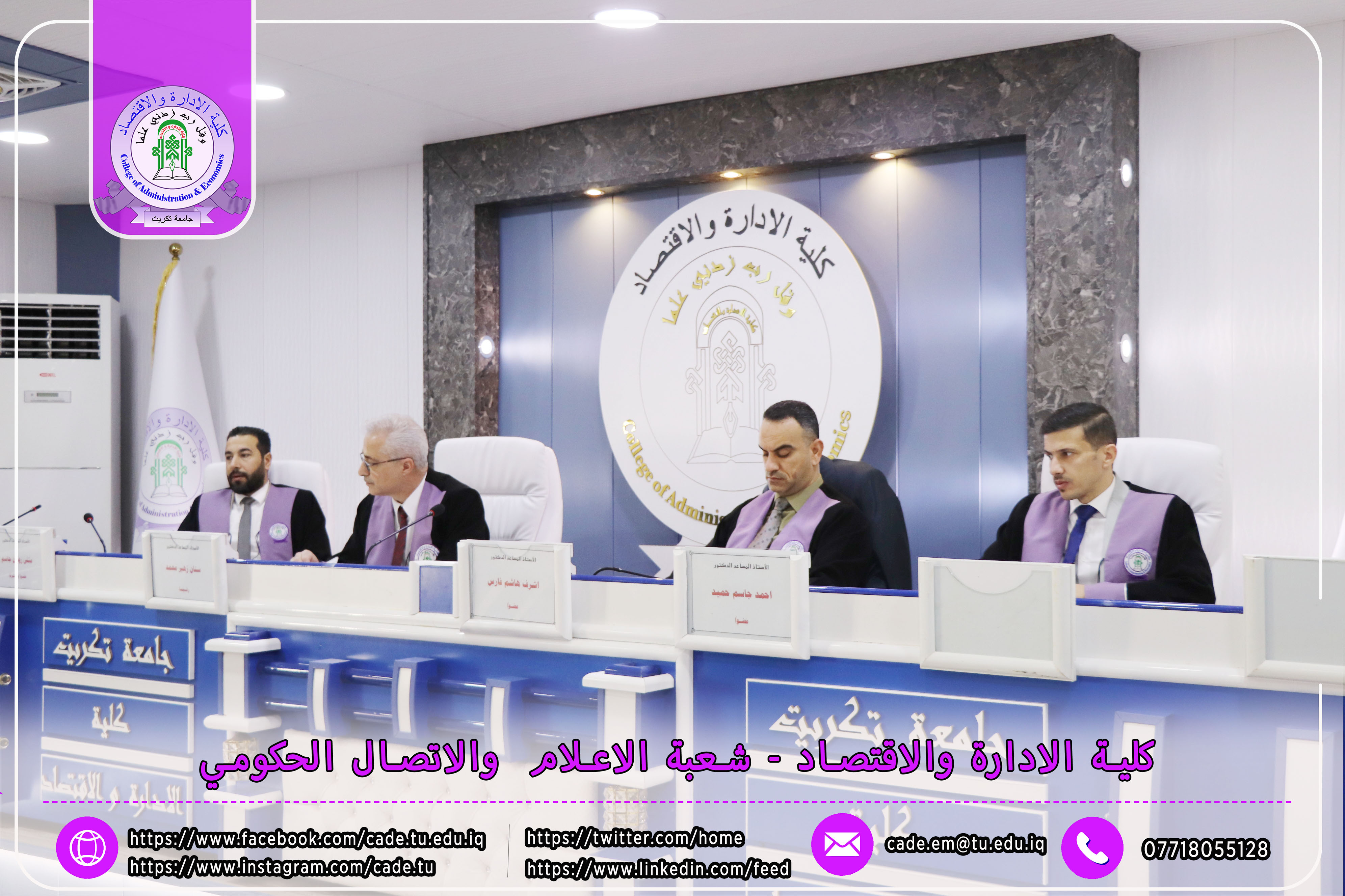 نوقشت في كلية الإدارة والاقتصاد / قسم المحاسبة / رسالة الماجستير في العلوم المحاسبية للطالــب حارث عبدالرحمن حميد الموسومة ((تأثير الثقة الادارية المفرطة في معامل استجابة الارباح في ظل خصائص مجلس الإدارة : دراسة تطبيقية في عينة من الشركات العراقية )) بأشراف ا.م.د. مثنى روكان جاسم