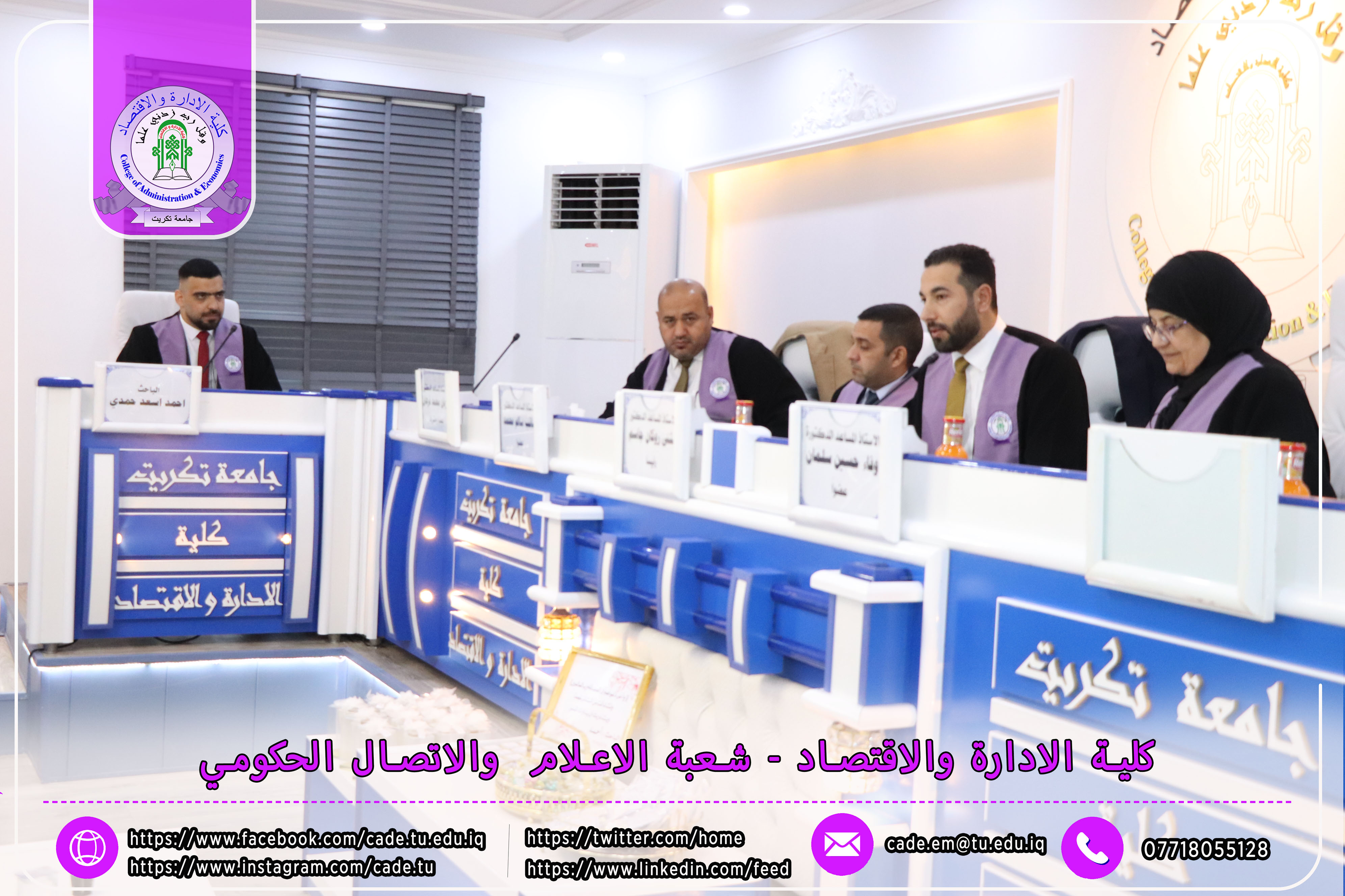 هذا وقد حضر المناقشة ا.م.د. فؤاد فرحان حسين عميد كلية الإدارة والاقتصاد و ا.م.د. اشرف هاشم فارس وعدد من طلبة الدراسات العليا.