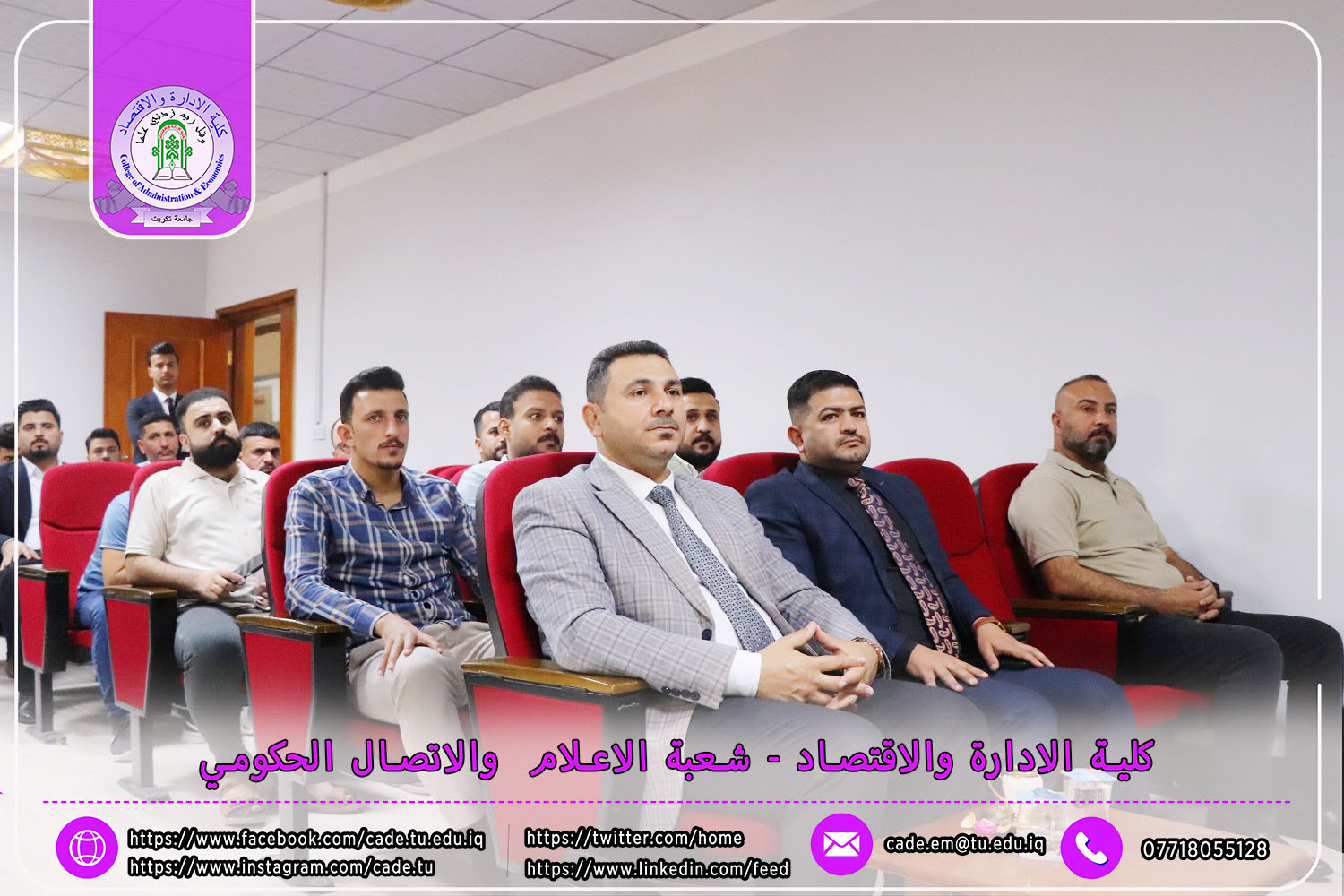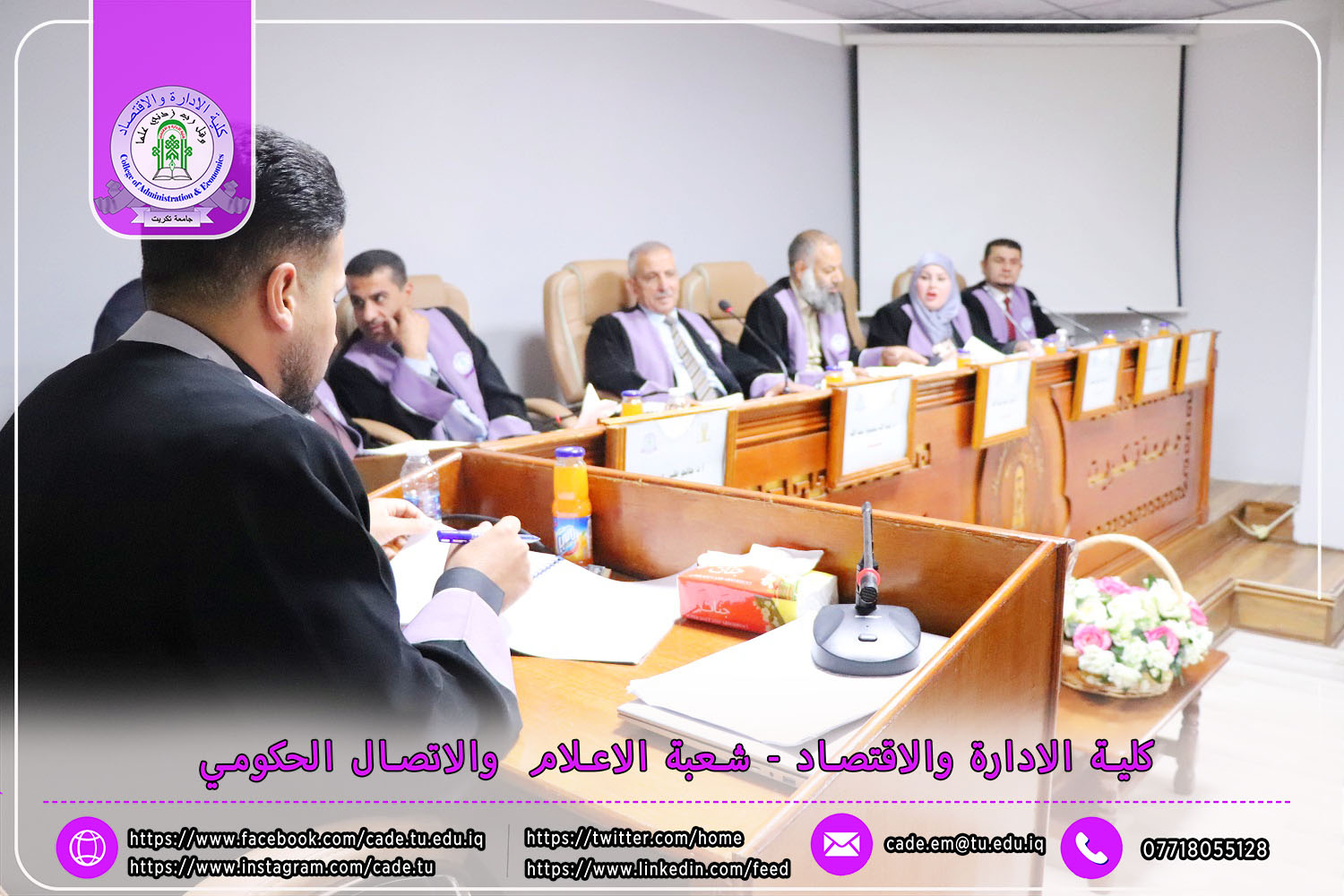 وقد شهدت المناقشة حضور الأستاذ المساعد الدكتور فؤاد فرحان حسين، عميد كلية الإدارة والاقتصاد، والدكتور قتيبة إبراهيم حمادة معاون العميد لشؤون الطلبة، إلى جانب نخبة من السادة التدريسيين وعدد من طلبة الدراسات العليا.