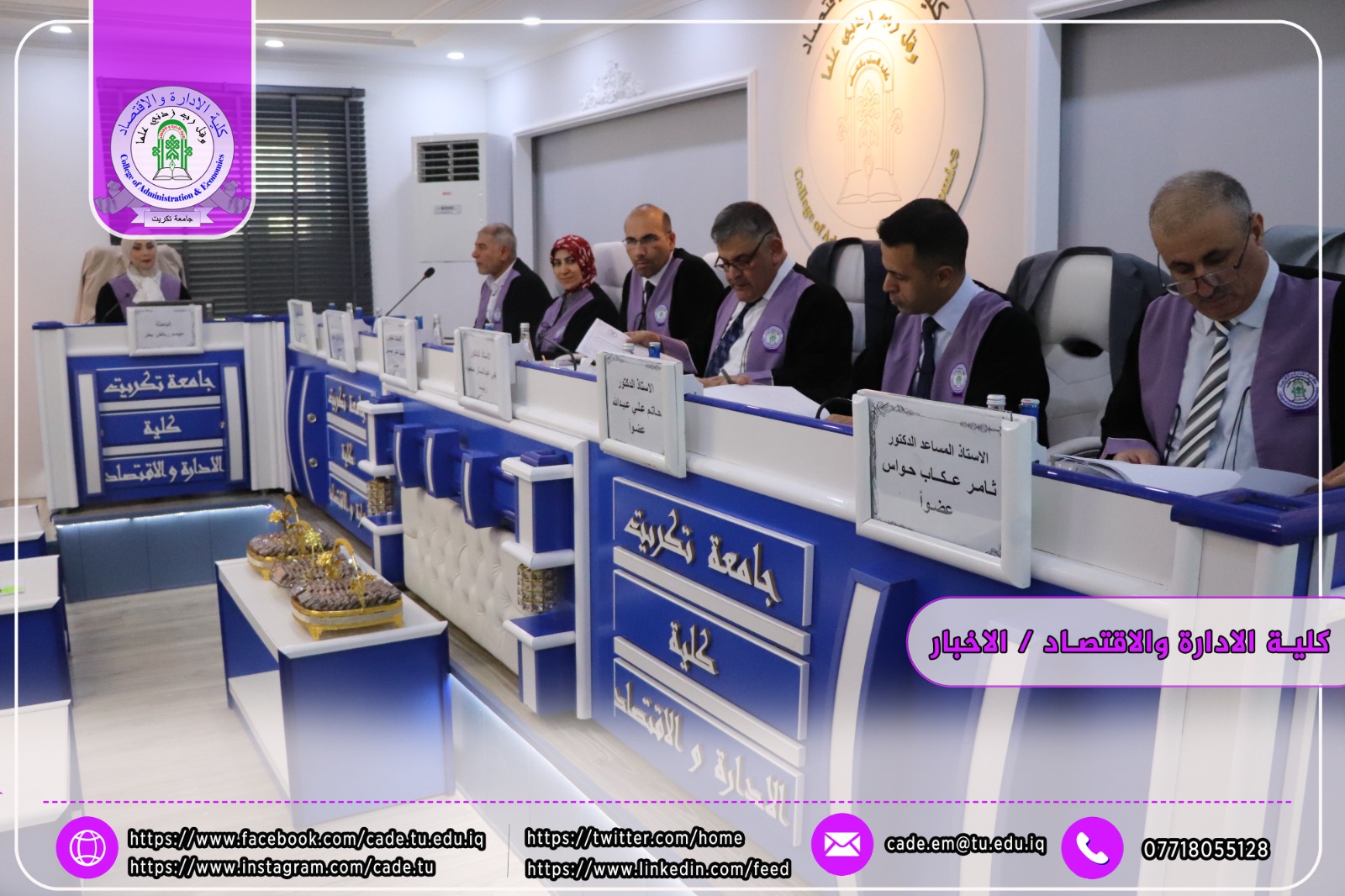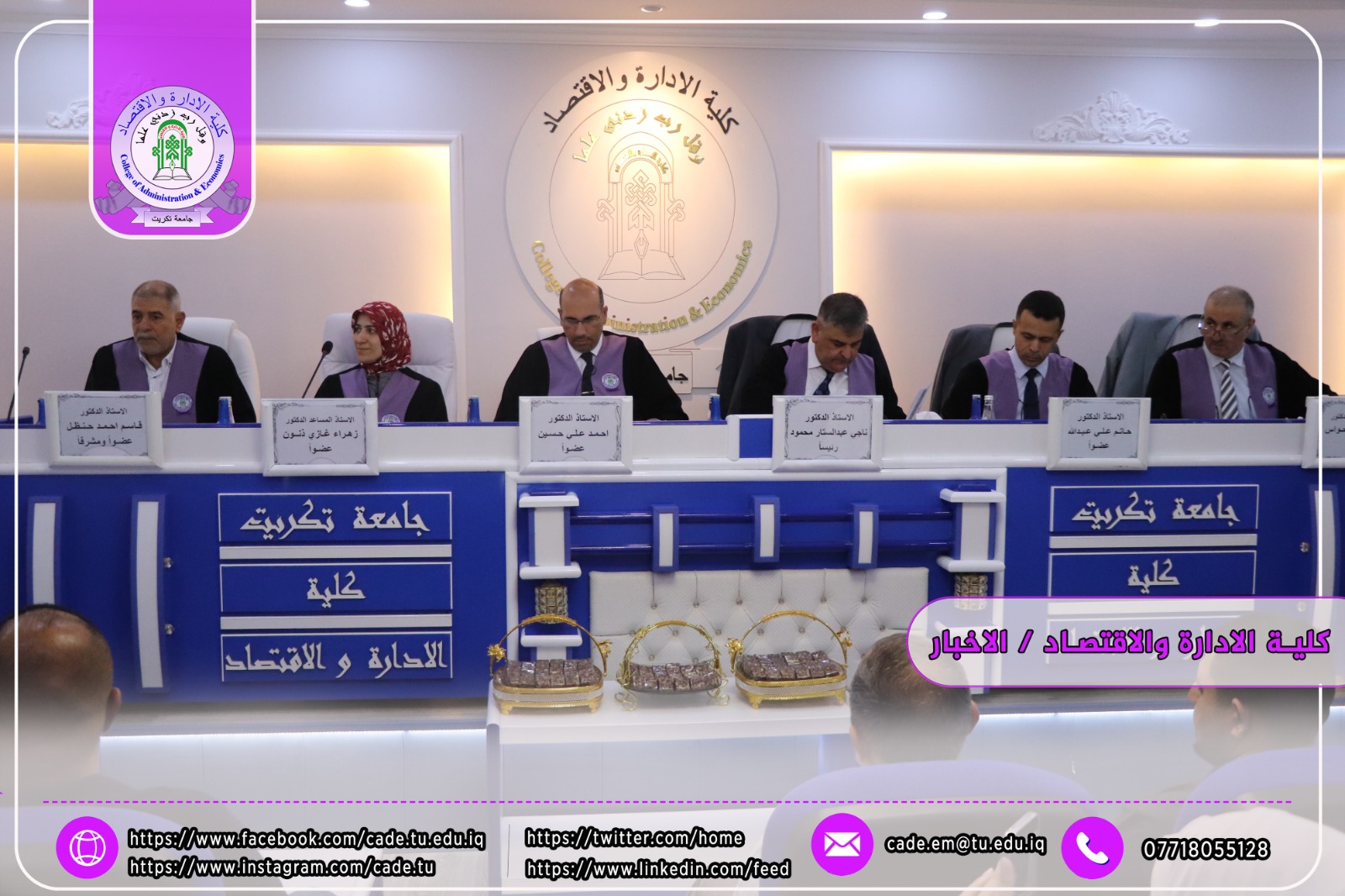هذا وقد شهدت المناقشة حضور الأستاذ المساعد الدكتور فؤاد فرحان حسين، عميد كلية الإدارة والاقتصاد، والأستاذ المساعد الدكتور خطاب عمران صالح معاون العميد للشؤون العلمية والمدرس احمد عايد مخلف معاون العميد للشؤون الادارية، إلى جانب نخبة من السادة التدريسيين وعدد من طلبة الدراسات العليا.