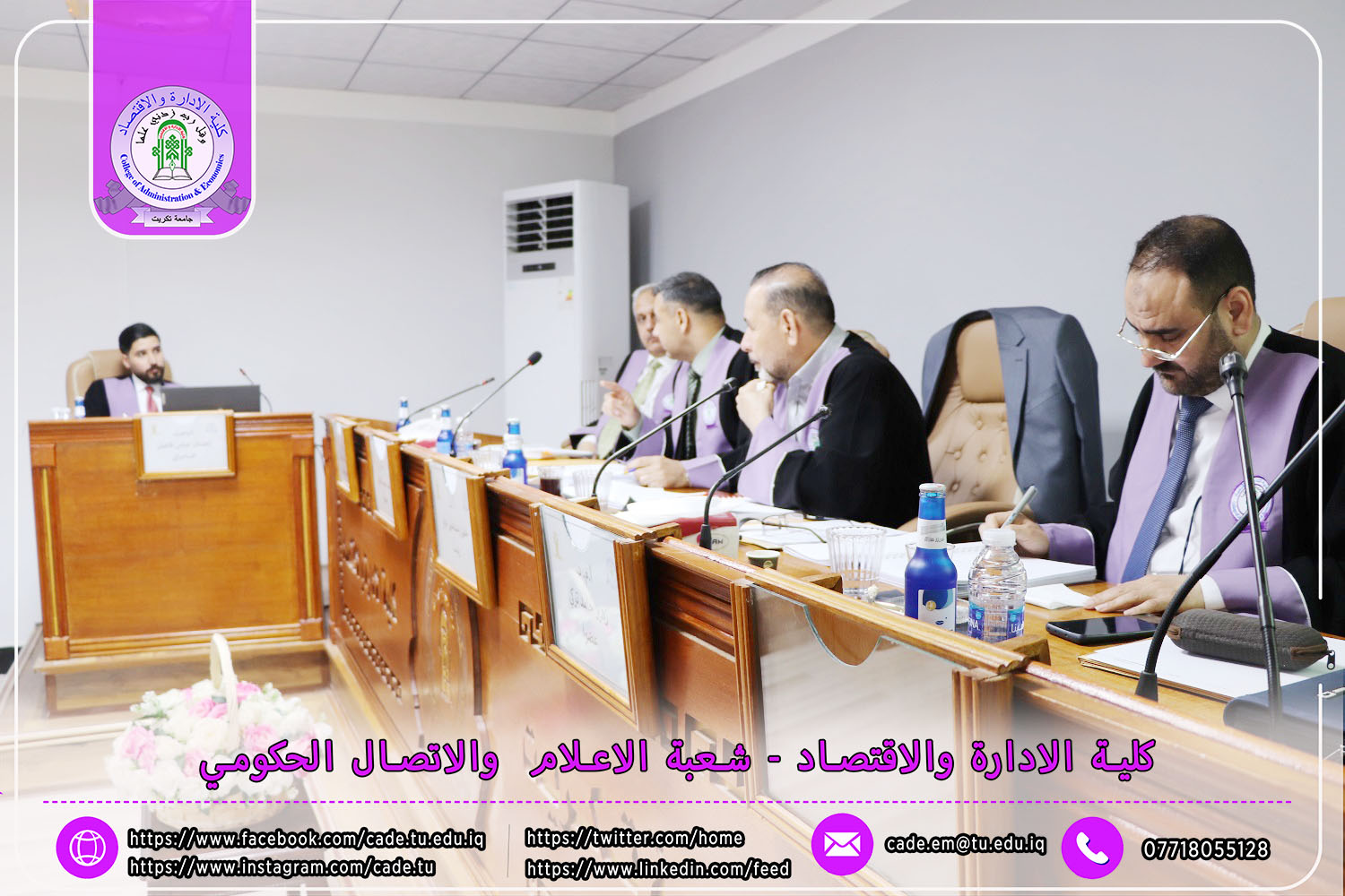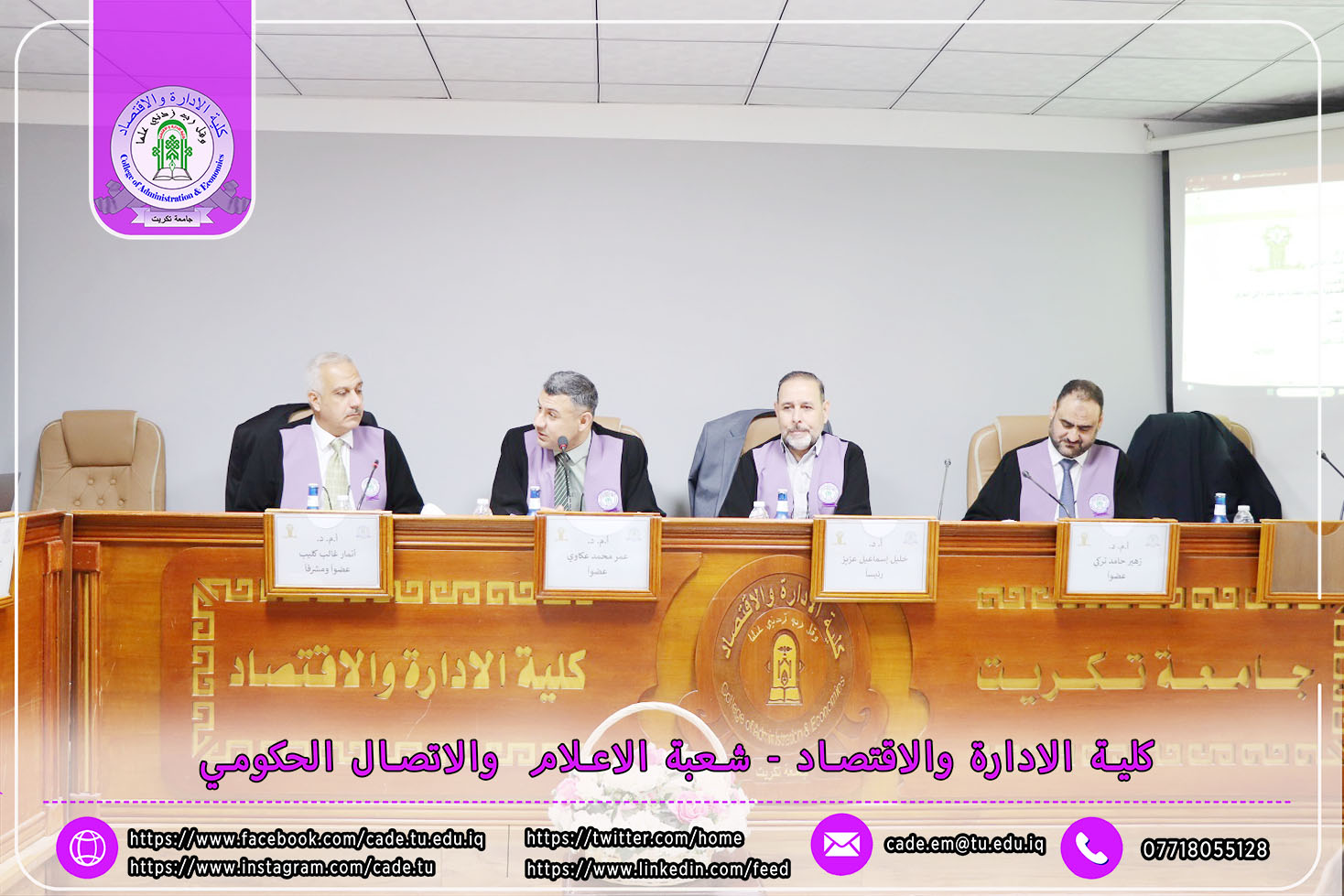 شهدت جلسة المناقشة حضور أ.م.د. فؤاد فرحان حسين، عميد كلية الإدارة والاقتصاد، و ا.د. إبراهيم عبدالله جاسم رئيس قسم الاقتصاد و ا.م.د. فراس فرحان جدي رئيس قسم ادارة التسويق وم. احمد عايد مخلف معاون العميد للشؤون الإدارية والمالية ، إلى جانب عدد من أساتذة وطلبة الدراسات العليا.