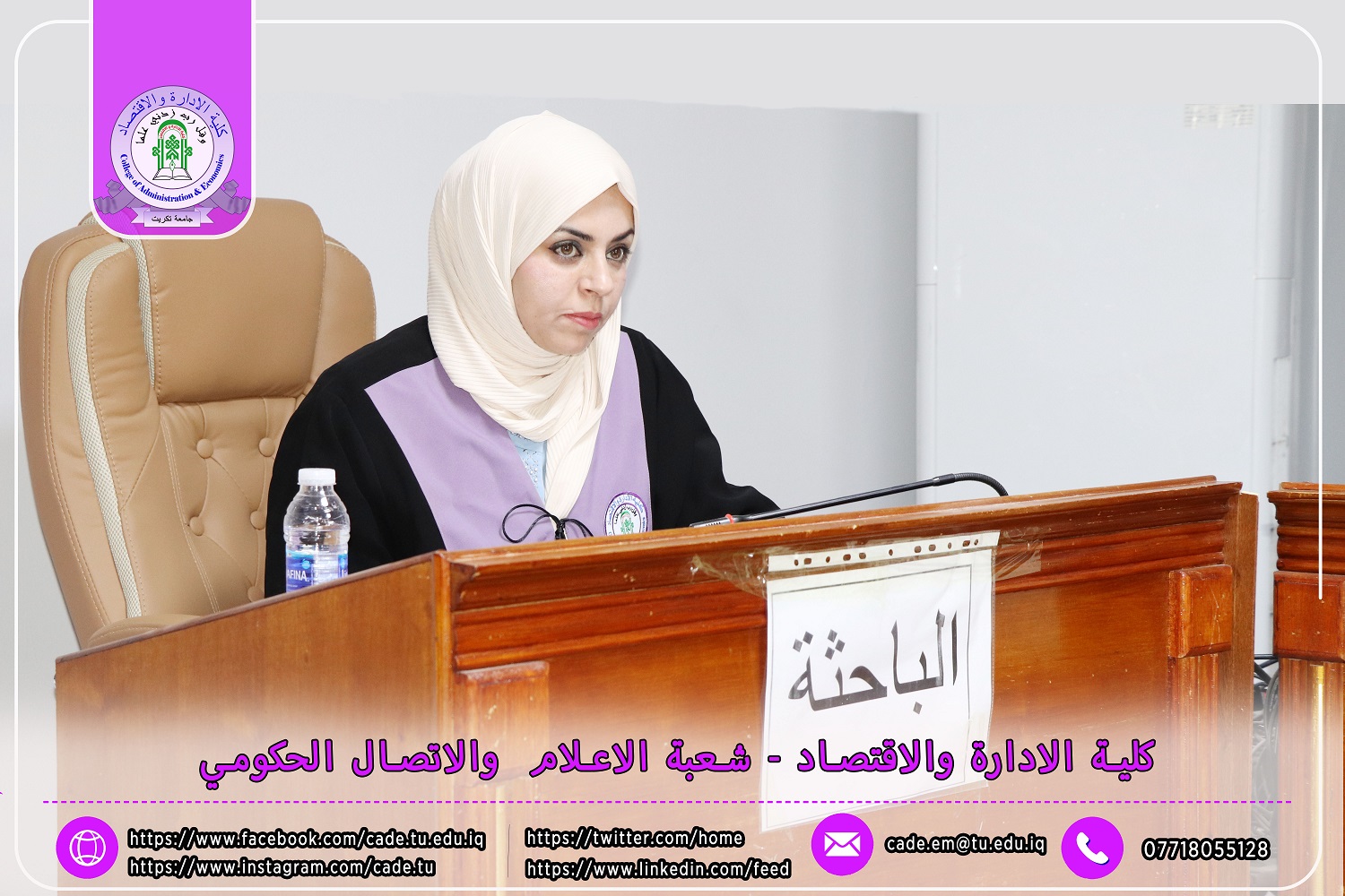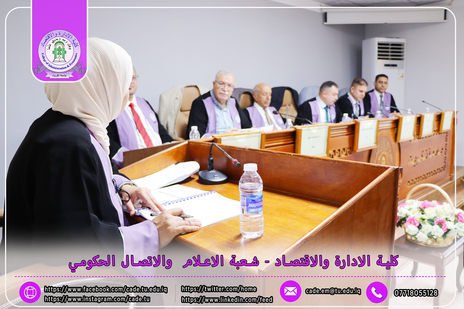 نوقشت في كلية الإدارة والاقتصاد / قسم إدارة الاعمال / أطروحة الدكتوراه فلسفة في العلوم الادارية للطالبة كوثر عبدالجبار حسين الموسومة (الذكاء المالي مدخل لتحقيق الاستدامة المالية في اطار نموذج PATROL : دراسة تطبيقية لعدد من المصارف التجارية العراقية الخاصة) وذلك بأشراف ا.د. جمال هداش محمد.