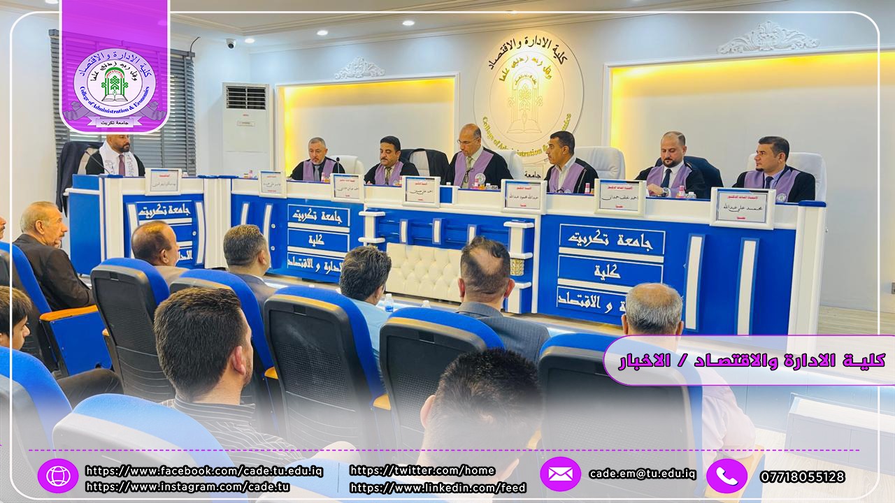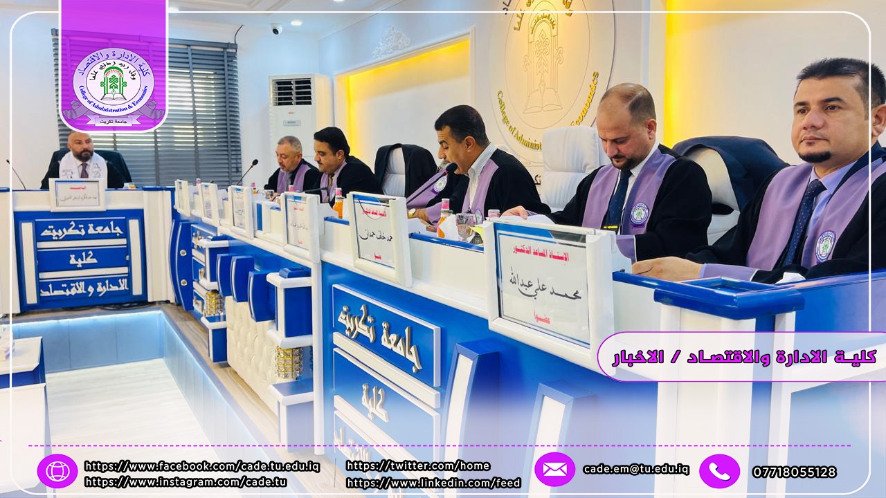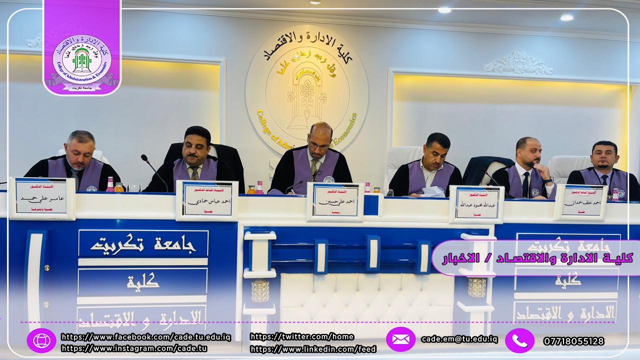 هذا وقد شهدت المناقشة حضور الأستاذ المساعد الدكتور فؤاد فرحان حسين، عميد كلية الإدارة والاقتصاد، والأستاذ المساعد الدكتور خطاب عمران صالح معاون العميد للشؤون العلمية ، إلى جانب نخبة من السادة التدريسيين وعدد من طلبة الدراسات العليا.