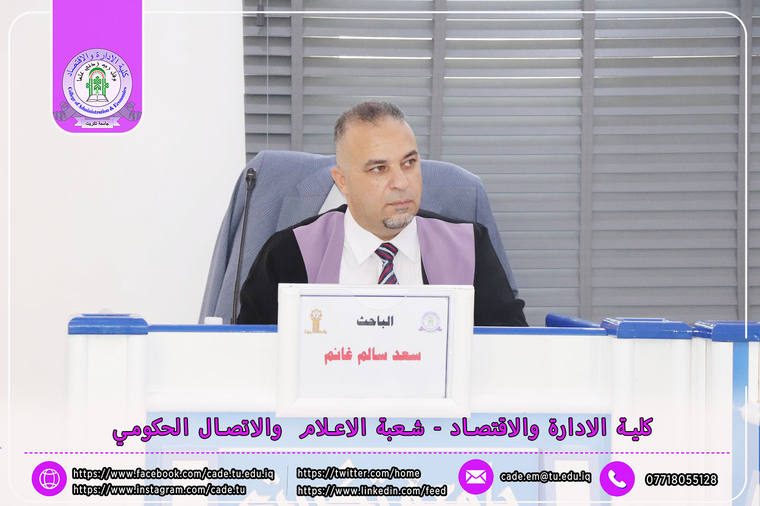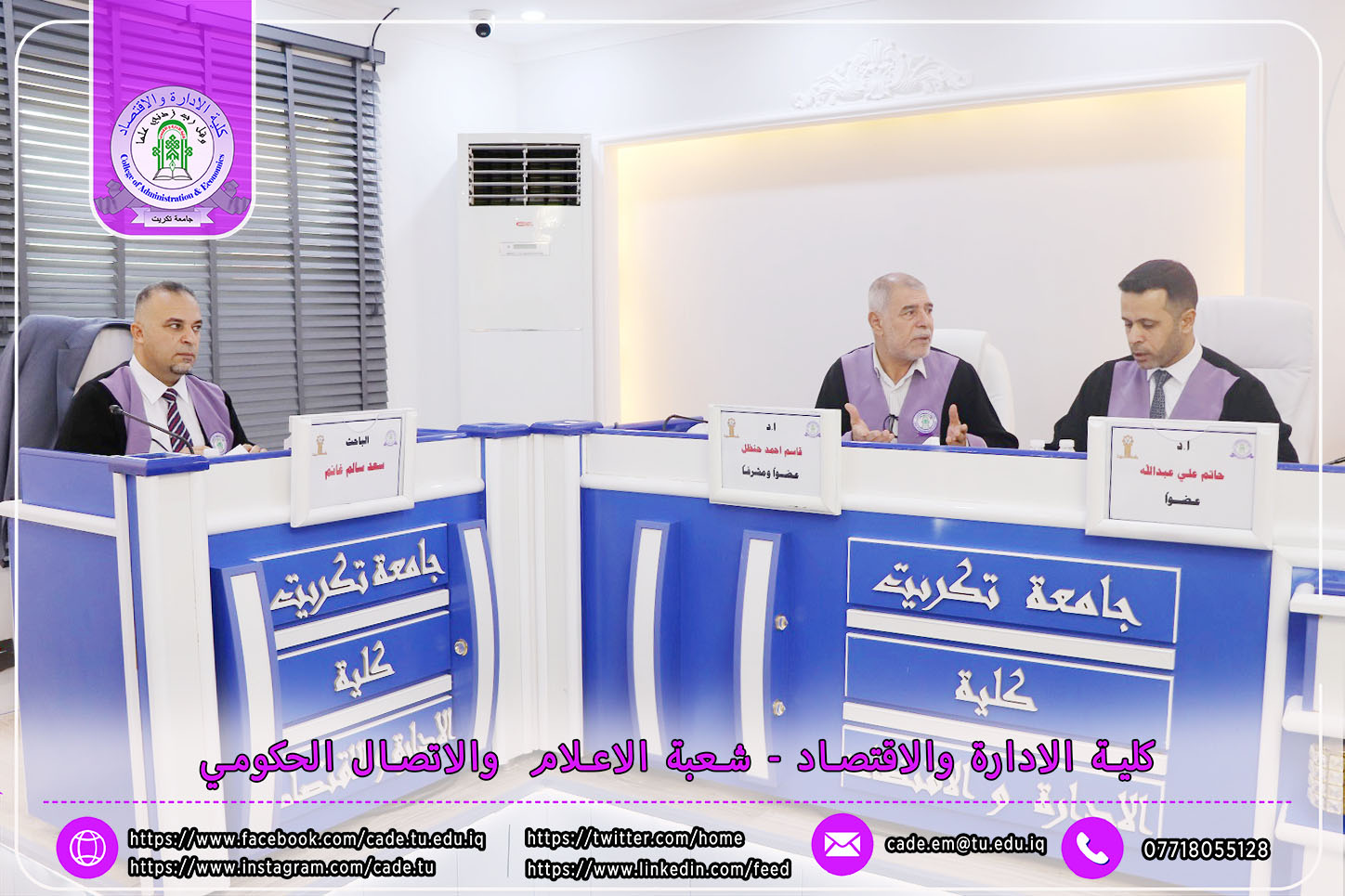 هذا وقد حضر المناقشة ا.م.د. خطاب صالح عمران معاون العميد للشؤون العلمية، ا.م.د. قتيبة إبراهيم حمادة معاون العميد لشؤون الطلبة، م.د. احمد عايد مخلف معاون العميد للشؤون الإدارية والمالية إلى جانب نخبة من السادة التدريسيين وعدد من طلبة الدراسات العليا.