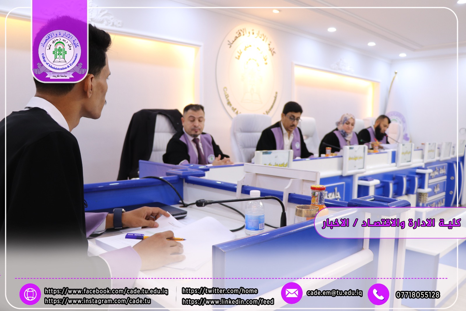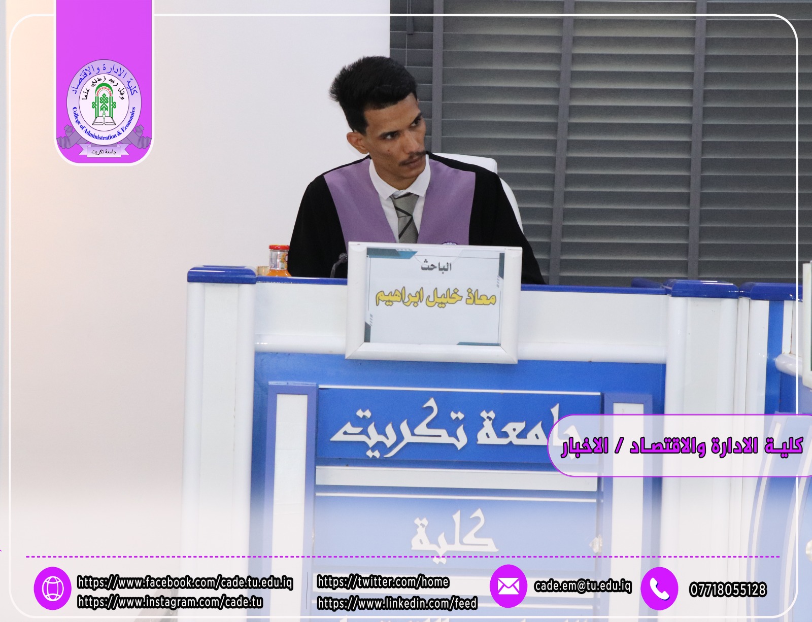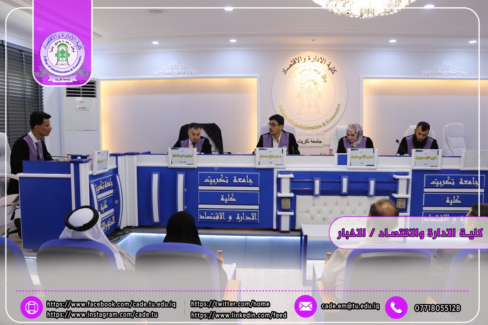 نوقشت في كلية الإدارة والاقتصاد / قسم العلوم المالية والمصرفية / رسالة الماجستير في العلوم المالية والمصرفية للطالب معاذ خليل ابراهيم الموسومة (تأثير هيكل رأس المال في السيولة المصرفية_ دراسة تطبيقية لعدد من المصارف التجارية العراقية الخاصة المختارة) وذلك بأشراف ا.د. إبراهيم علي كردي.