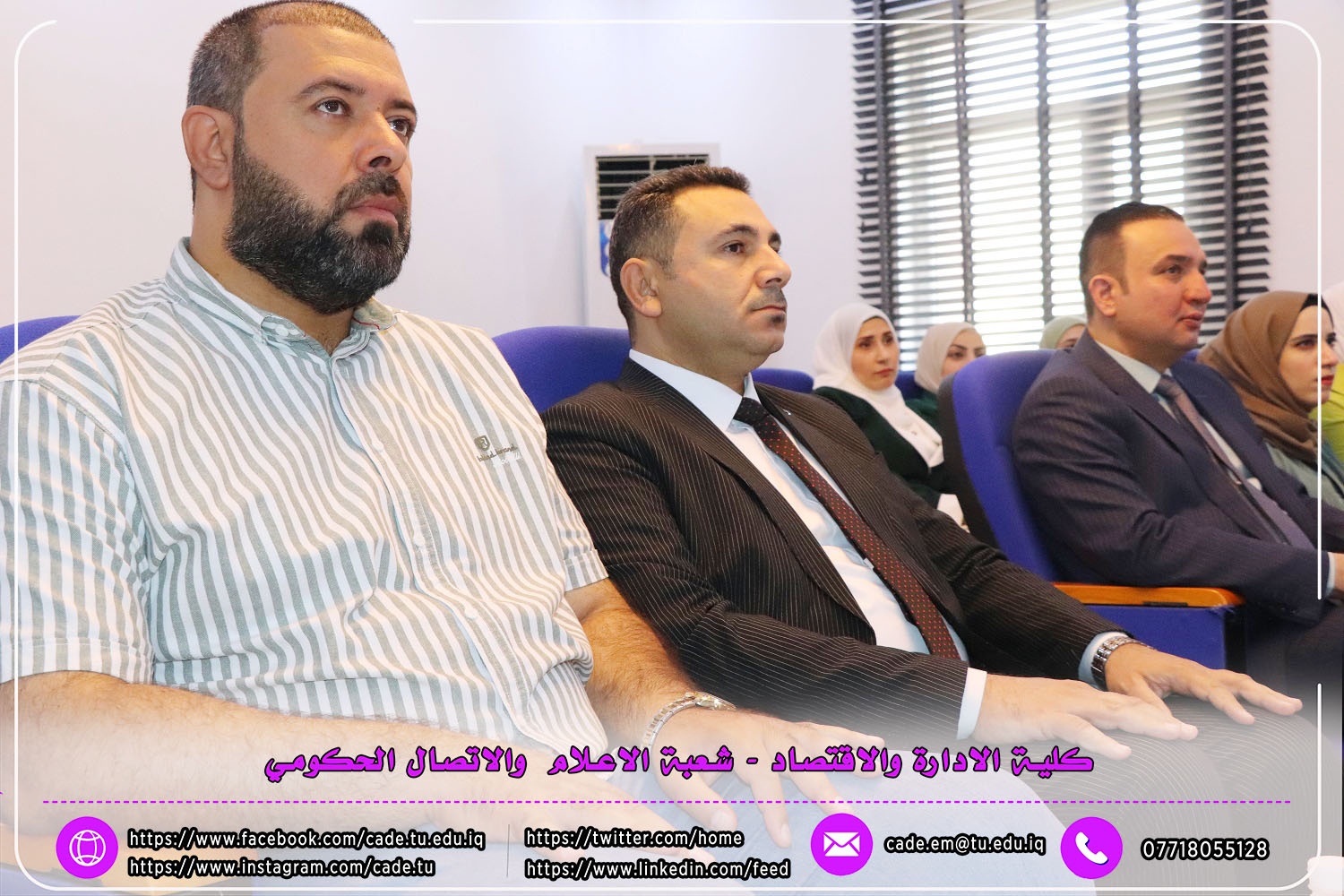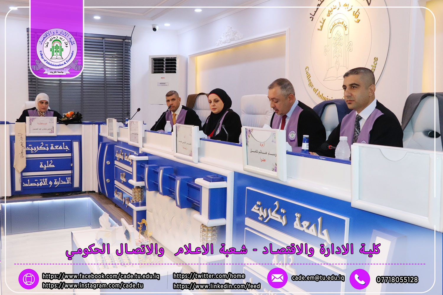 وحضر المناقشة كلٌّ من أ.م.د. فؤاد فرحان حسين عميد كلية الإدارة والاقتصاد، وأ.م.د. خطاب عمران صالح معاون العميد للشؤون العلمية، وم.د. أحمد عايد مخلف معاون العميد للشؤون الإدارية، إضافةً إلى عدد من السادة التدريسيين وطلبة الدراسات العليا."