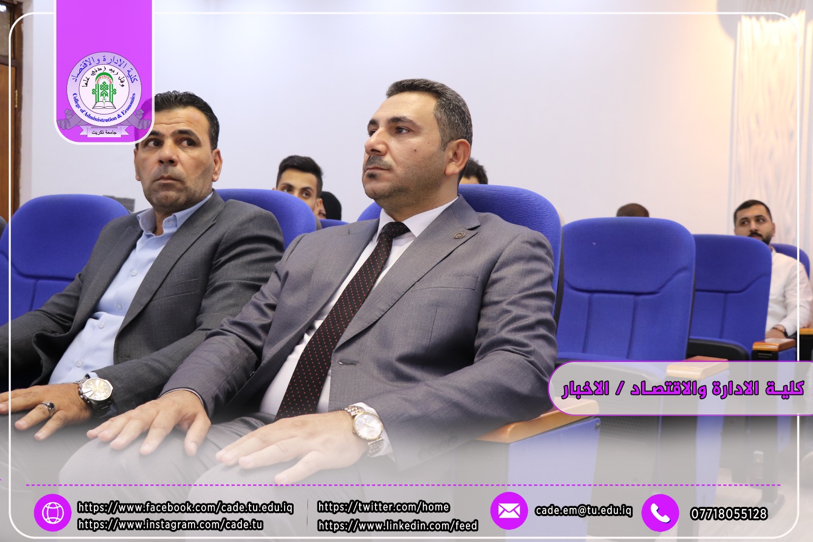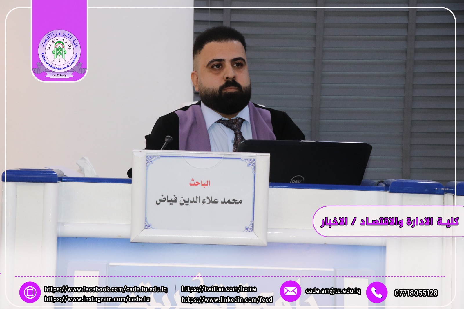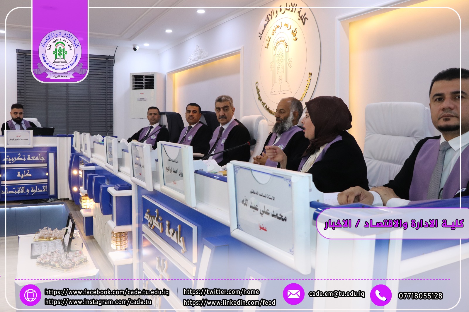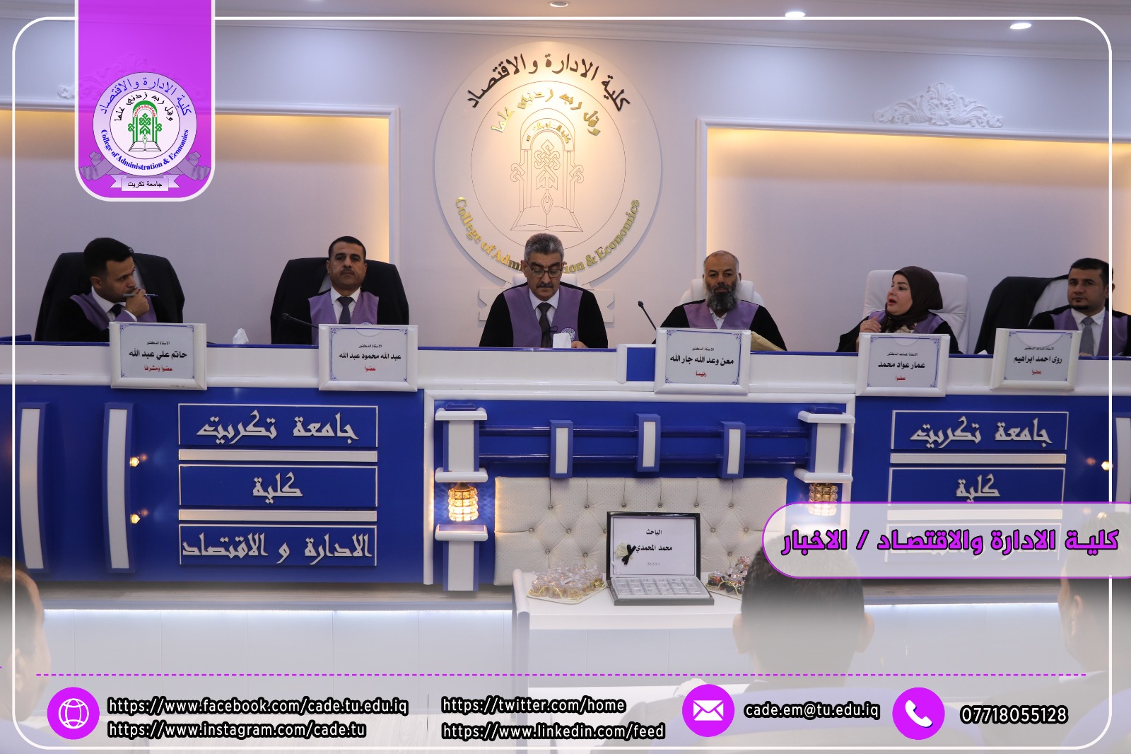 نوقشت في كلية الإدارة والاقتصاد / قسم ادارة الاعمال / أطروحة الدكتوراه في العلوم الإدارية للطالــب محمد علاءالدين فياض الموسومة (تأثير المقصد الاستراتيجي في معمارية التعاون التنافسي عبر التسويق الجامعي/ دراسة استطلاعية في عدد من الجامعات العراقية( بأشراف ا.د. حاتم علي عبدالله