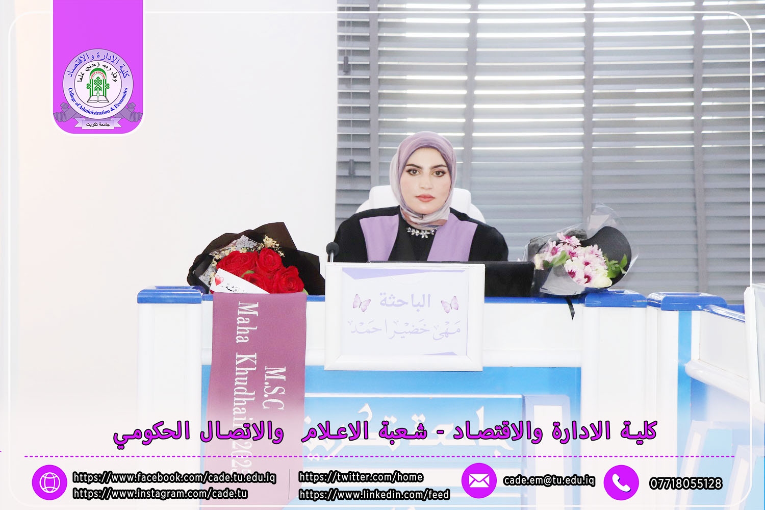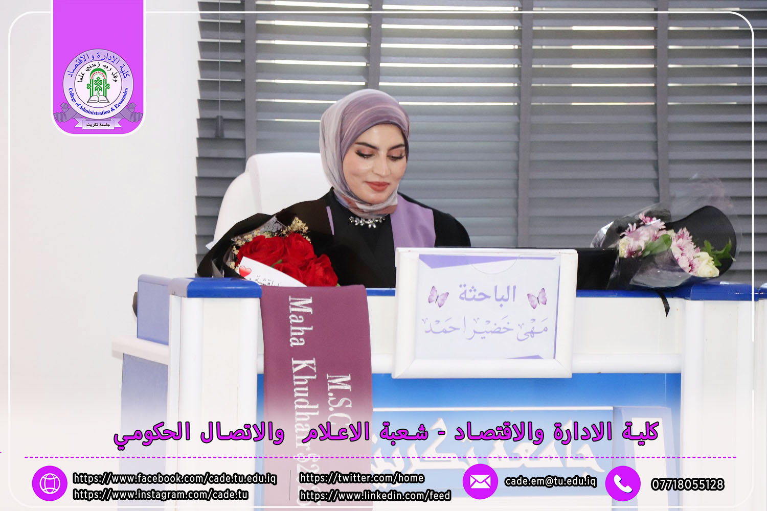 نوقشت في كلية الإدارة والاقتصاد / قسم العلوم المالية والمصرفية/ رسالة الماجستير في العلوم المالية والمصرفية للطالبة مهى خضير احمد الموسومة (تأثير ادارة المخاطر المالية في تقييم الاداء المالي للمصارف: دراسة تطبيقية لعدد من المصارف التجارية العراقية) وذلك بأشراف ا.د. جمال هداش محمد.