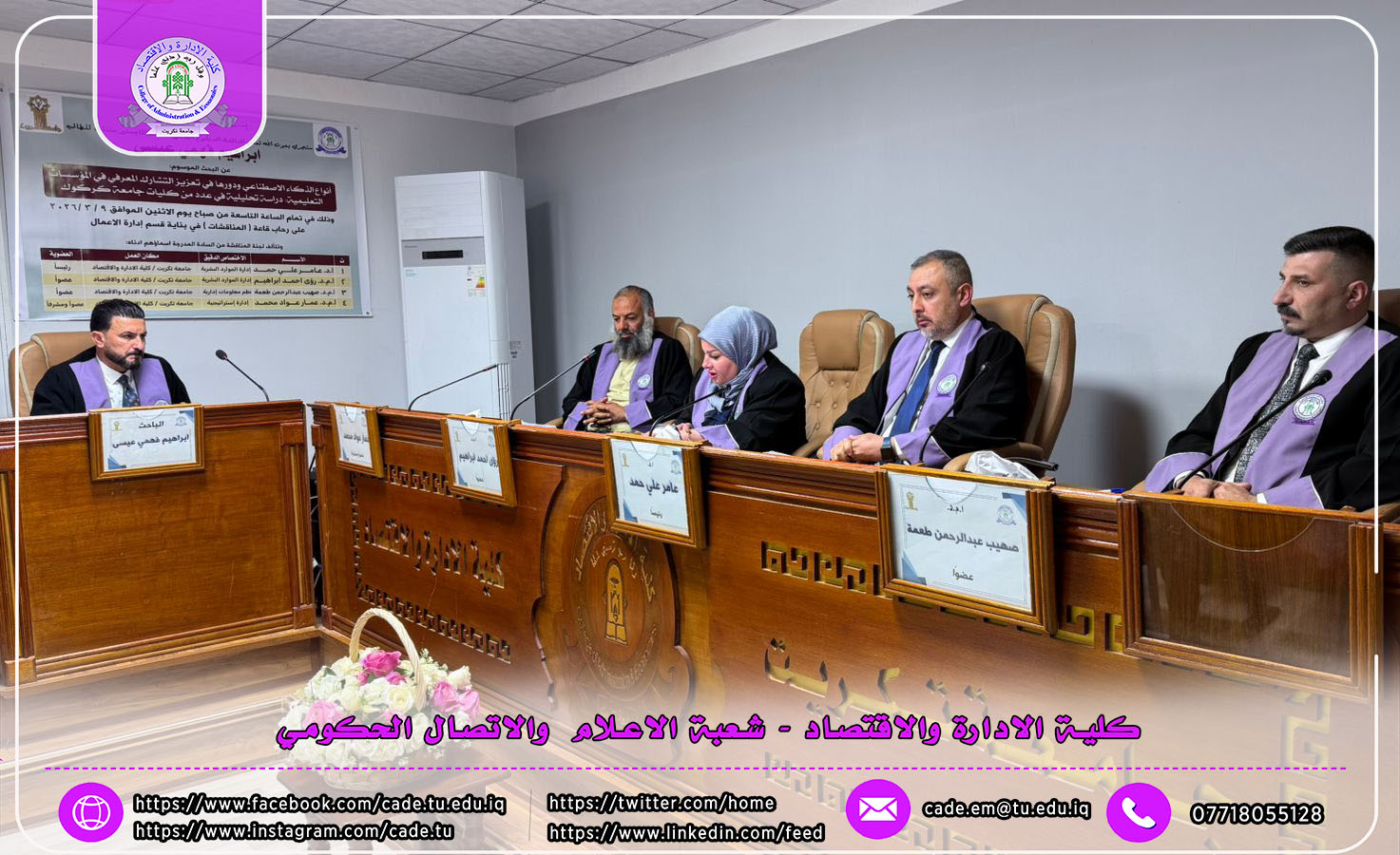 وتألفت لجنة المناقشة من أ.د. عامر علي حمد رئيساً وعضوية كل من أ.م.د رؤى أحمد إبراهيم، أ.م.د صهيب عبد الرحمن طعمة الى جانب المشرف على الرسالة