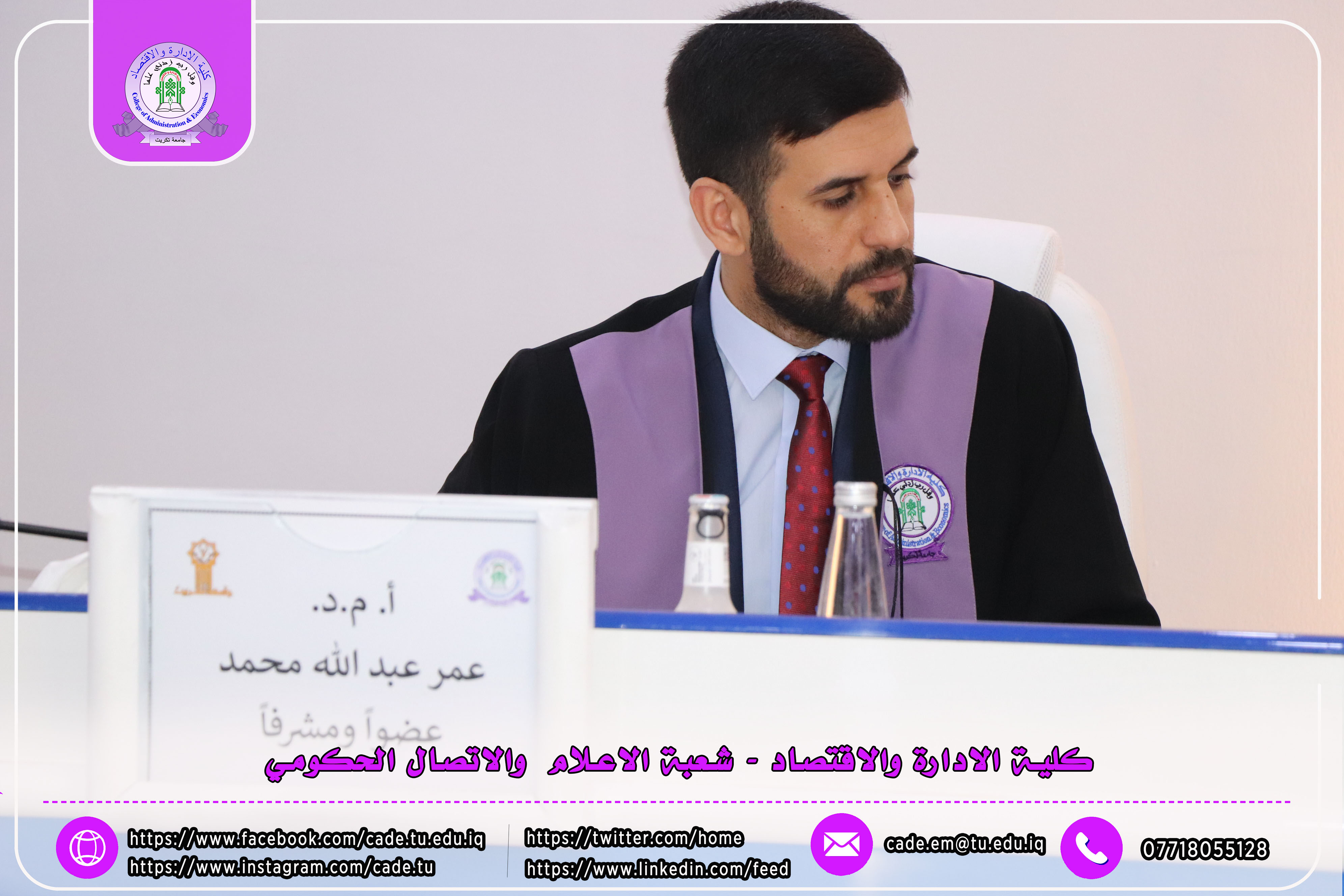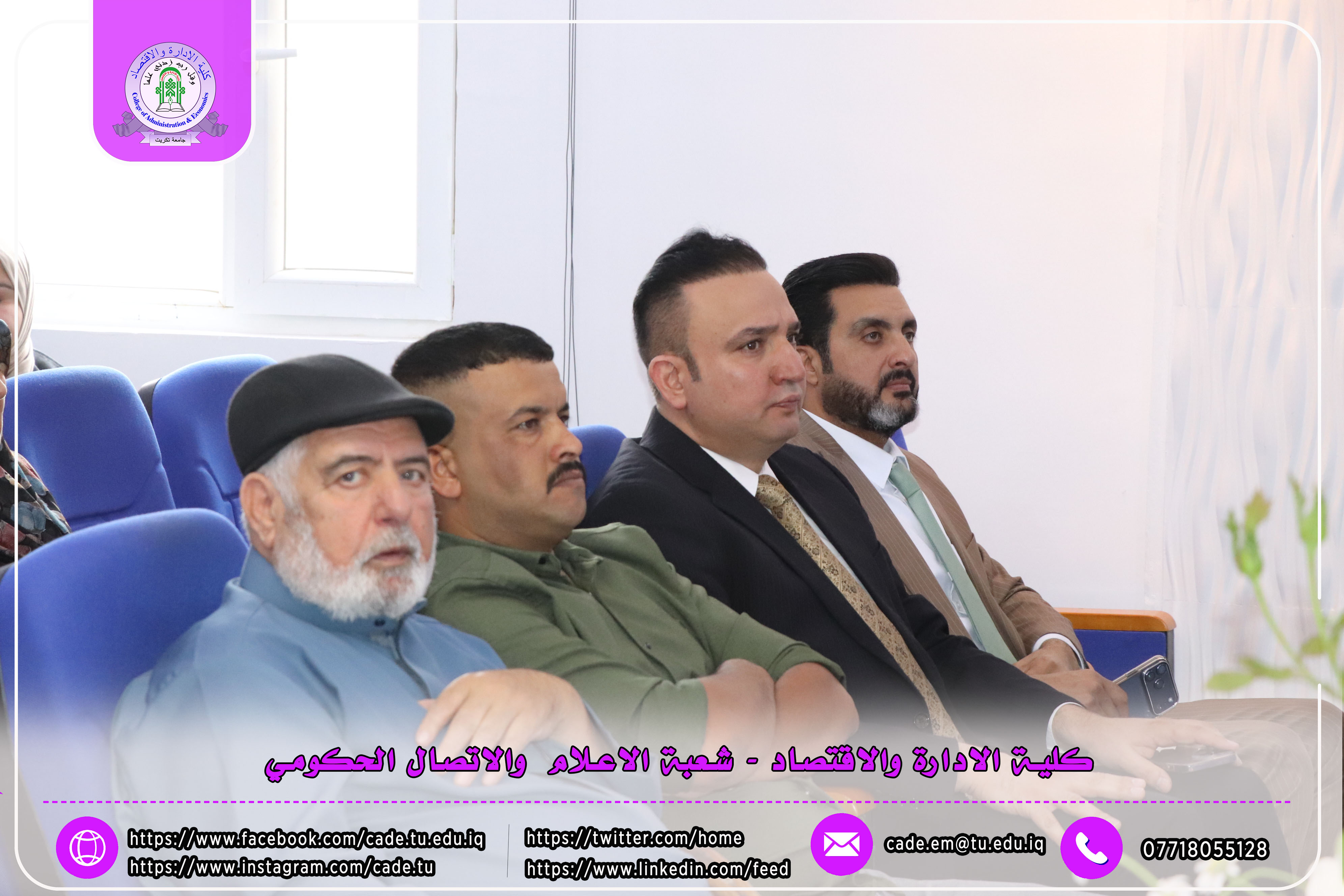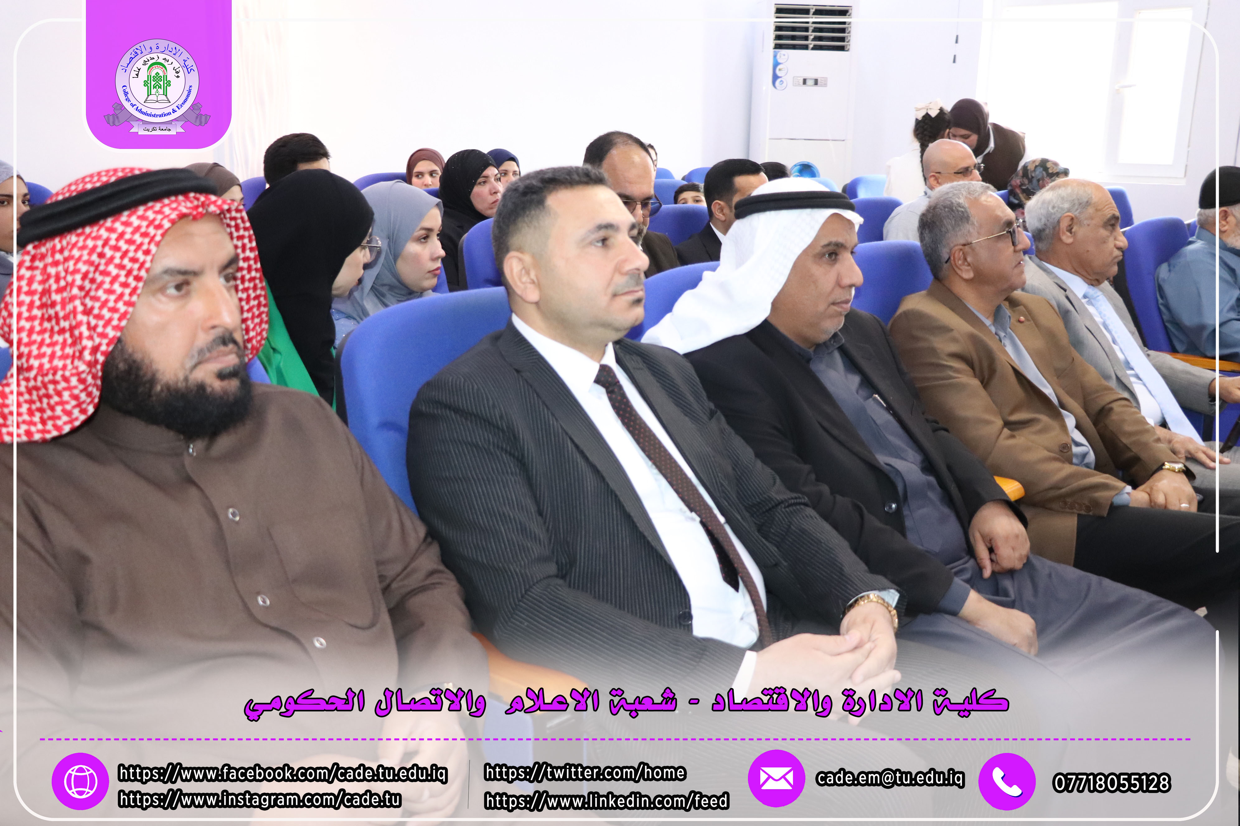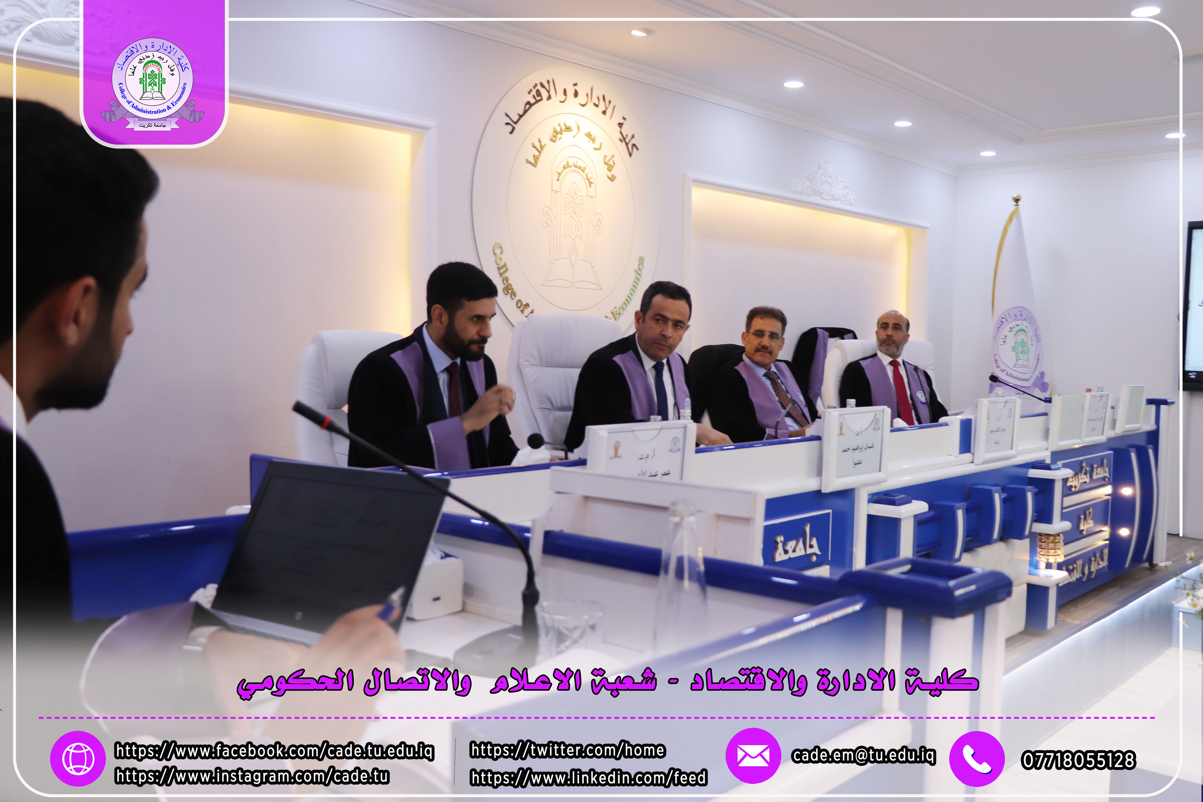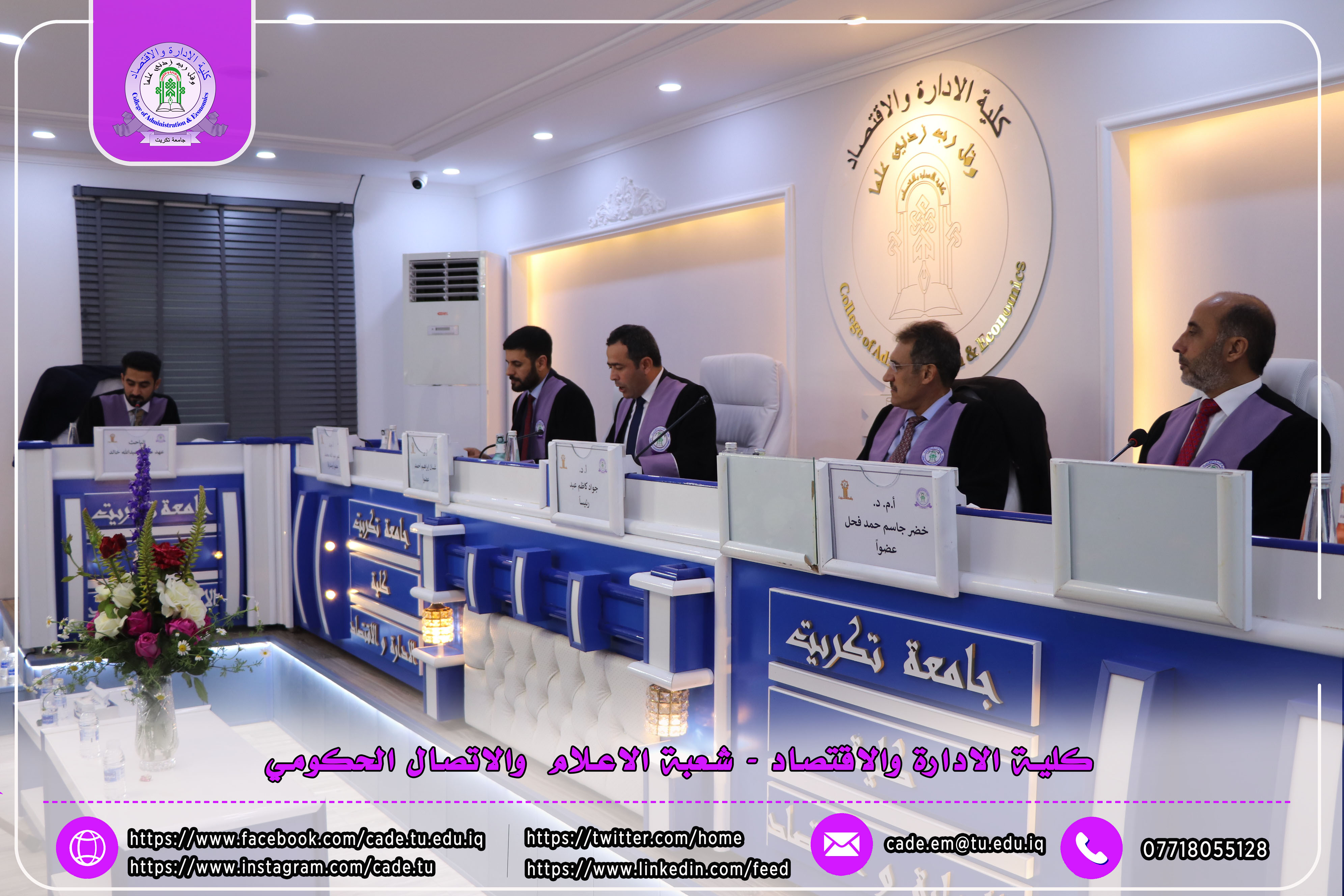 شهدت المناقشة حضور السيد عميد كلية الإدارة والاقتصاد الأستاذ المساعد الدكتور فؤاد فرحان حسين، معاون العميد للشؤون العلمية أ.م.د. خطاب عمران صالح إلى جانب عدد من السادة التدريسيين وعدد من طلبة الدراسات العليا.