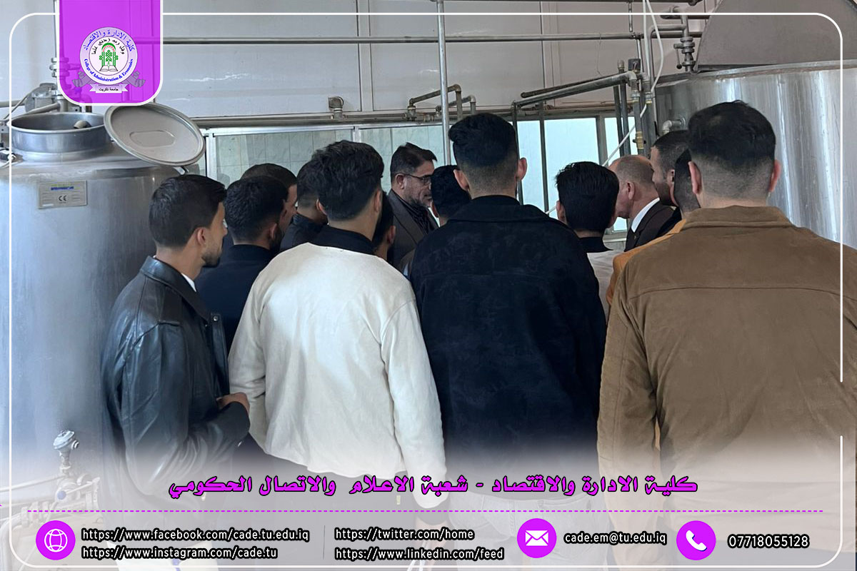 في إطار تعزيز الجانب العملي وربط المعرفة النظرية بالتطبيق الميداني، نظّم قسم إدارة التسويق في كلية الإدارة والاقتصاد زيارة علمية إلى كلية الزراعة، بمشاركة طلبة المرحلة الثانية، وبإشراف نخبة من تدريسيّي القسم.
