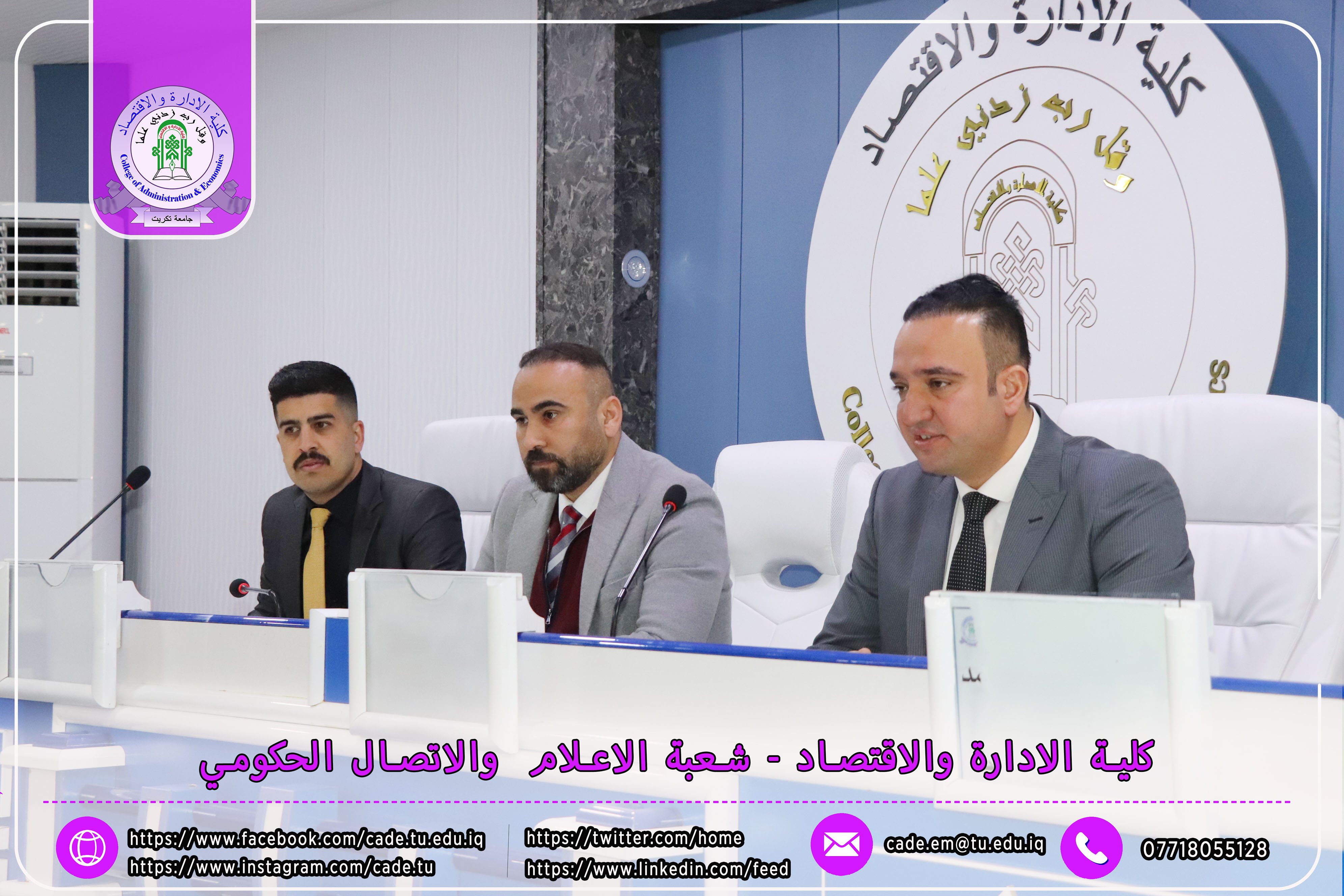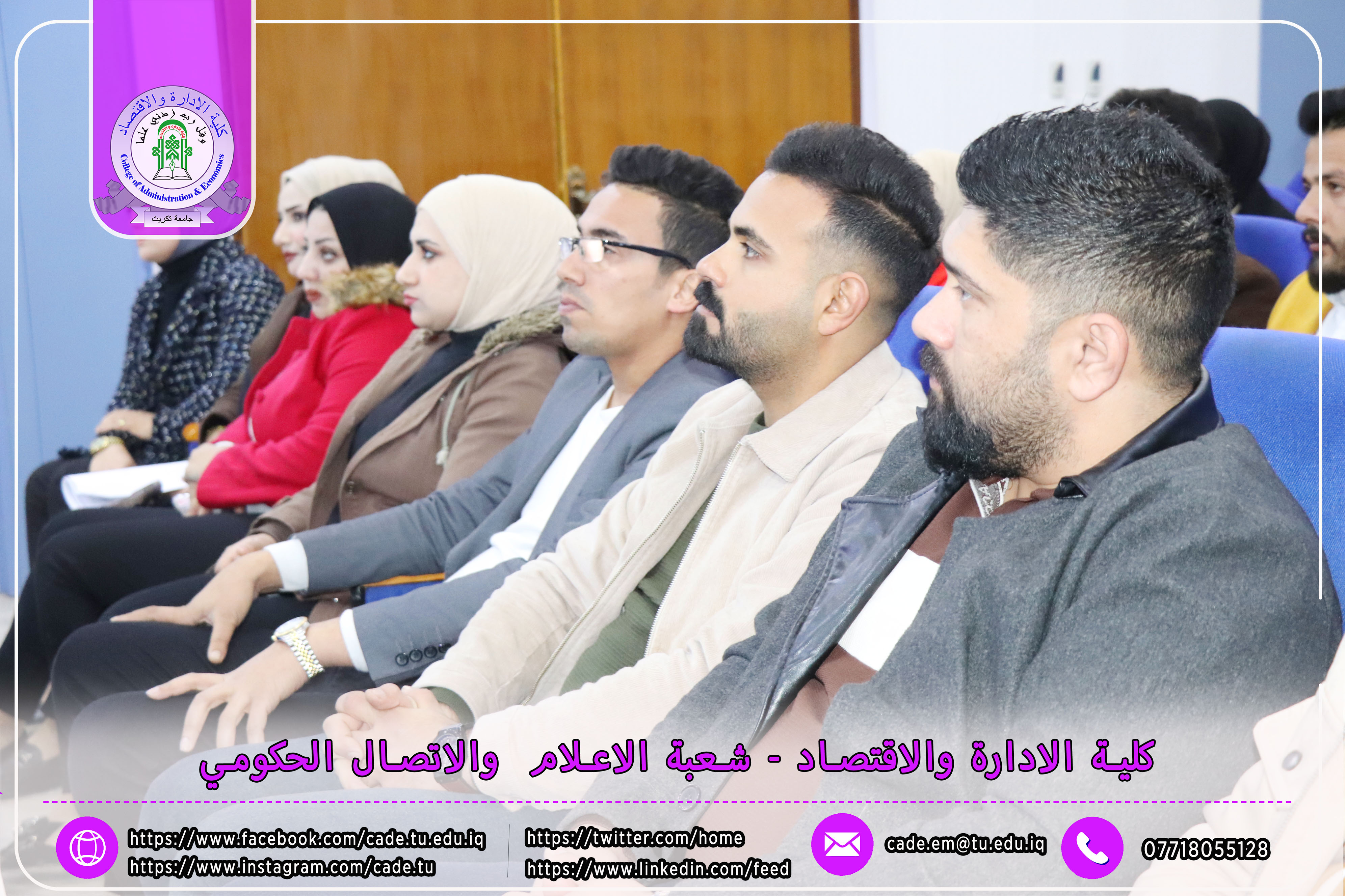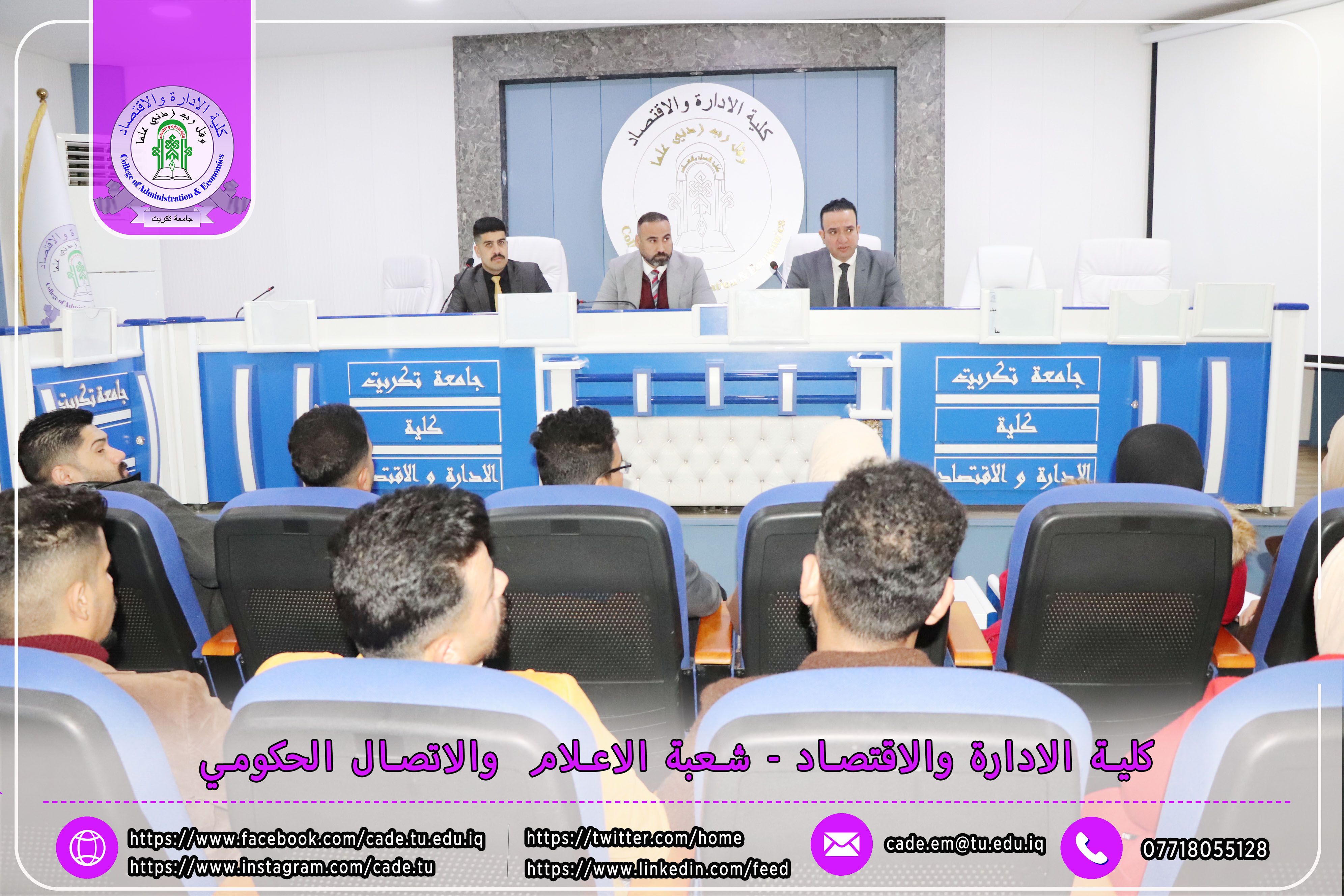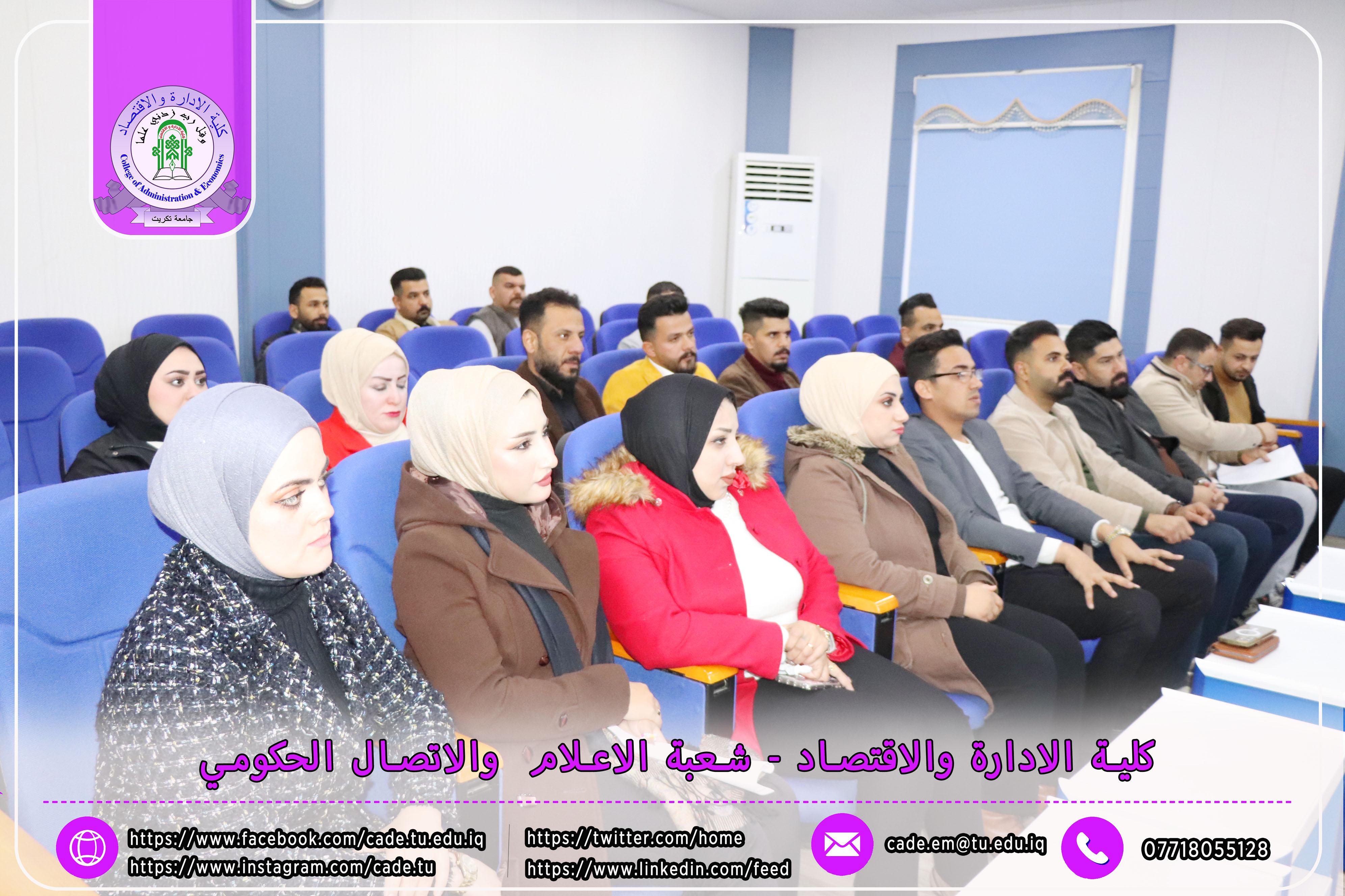 برعاية الأستاذ الدكتور وعد محمود رؤوف، رئيس جامعة تكريت، وإشراف الأستاذ الدكتور عبد الرزاق حمد حسين، عميد كلية الإدارة والاقتصاد، نظمت شعبة الشؤون العلمية بالتعاون مع قسم الشؤون العلمية ومركز التعليم المستمر، وذلك يوم الاثنين الموافق 2025/2/24، ندوة علمية حضورية بعنوان "إرشادات ومعلومات حول قانون انضباط موظفي الدولة رقم 14 لسنة 1991 المعدل"، على قاعة د. محمد بدع.
