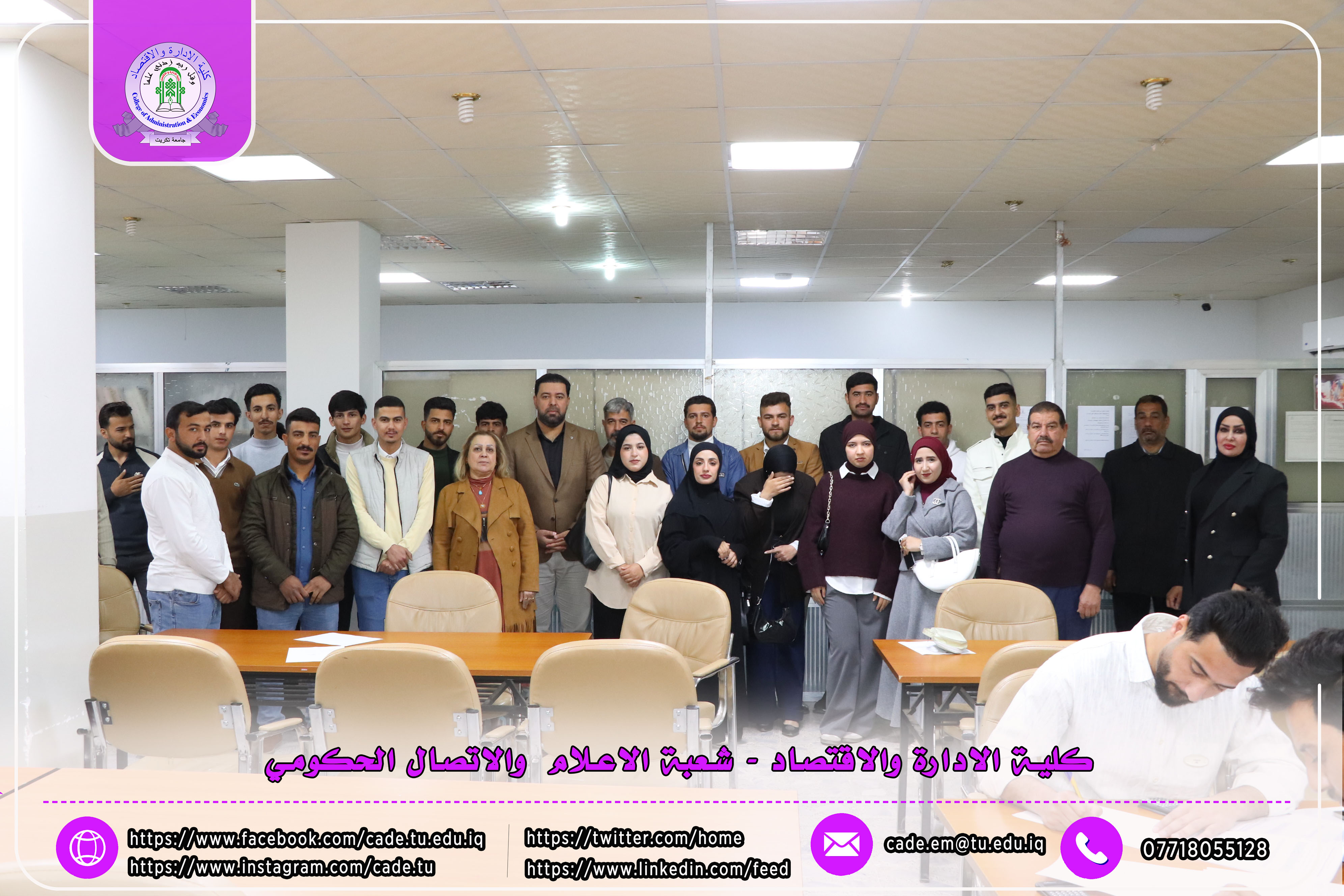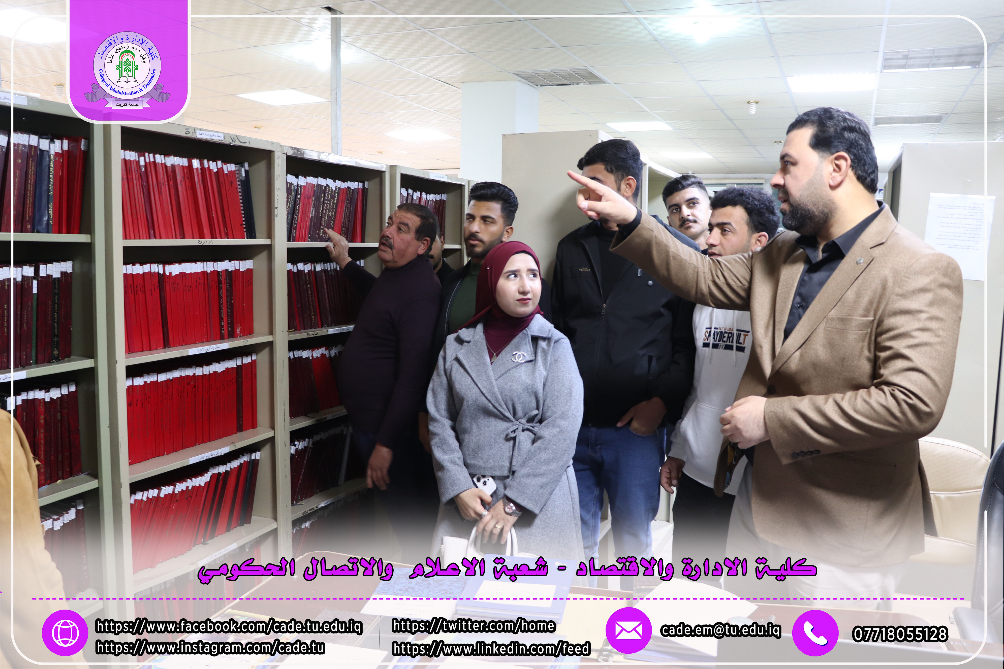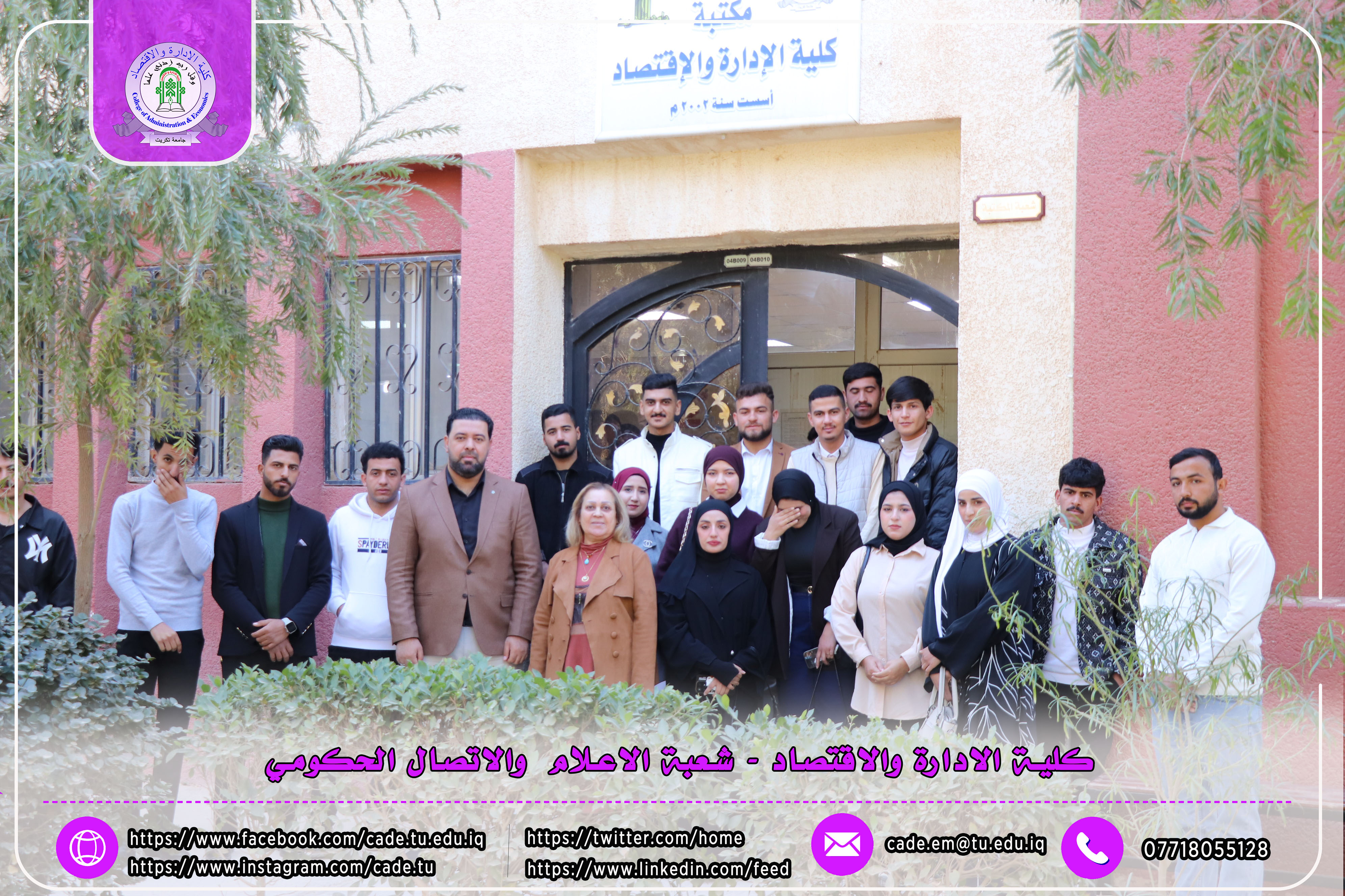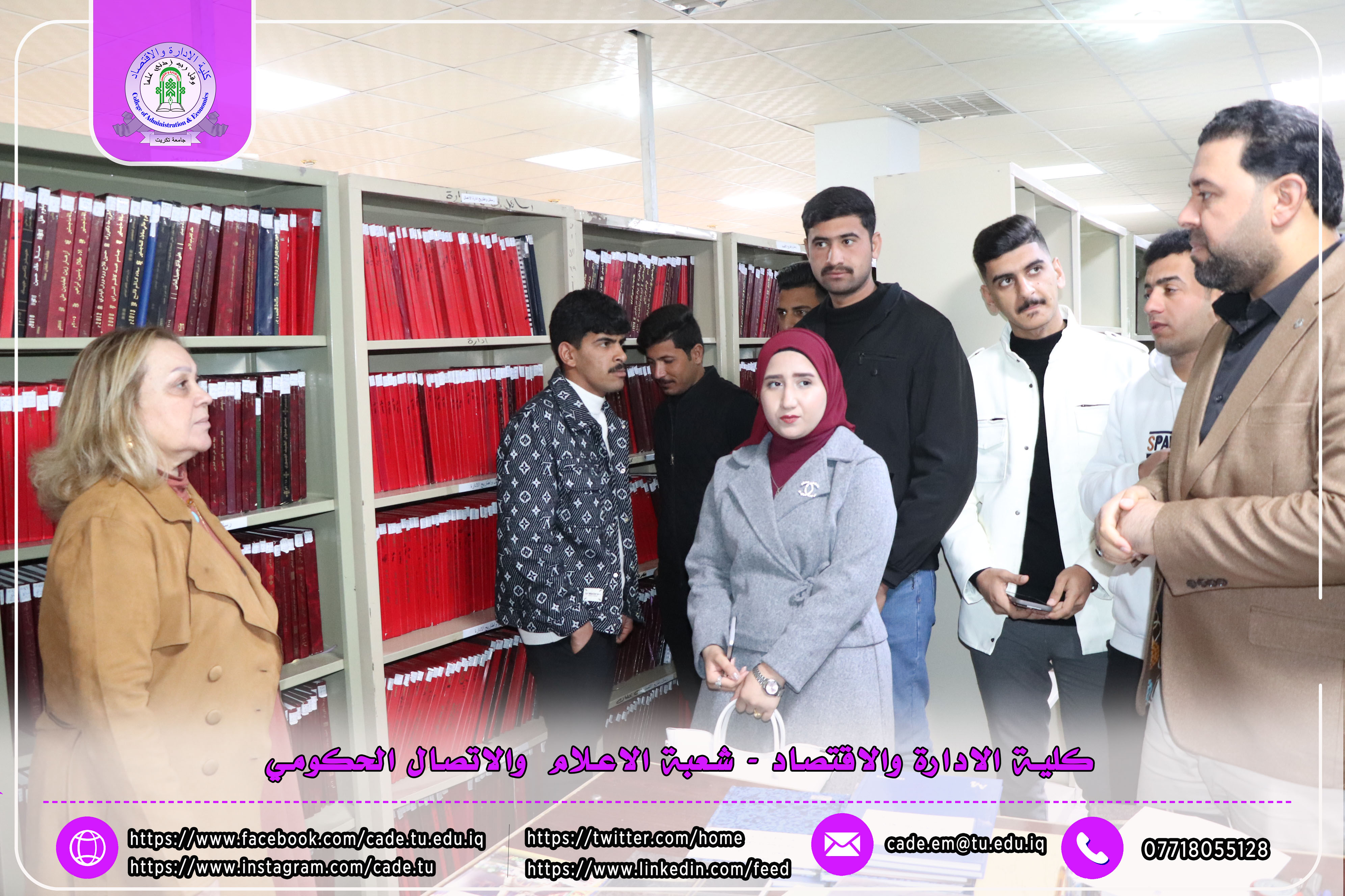 ضمن المفردات الدراسية لمادة إدارة المنظمات التسويقية في قسم إدارة التسويق، نظّم طلبة القسم زيارة علمية إلى مكتبة كلية الإدارة والاقتصاد يوم الاثنين الموافق 2-3-2026، بإشراف م.د. أحمد عايد مخلف رئيس قسم التسويق، و أ. مي حمودي عبدالله، وذلك في إطار تعزيز الجانب التطبيقي للمادة وربط المفاهيم النظرية بالواقع العملي.