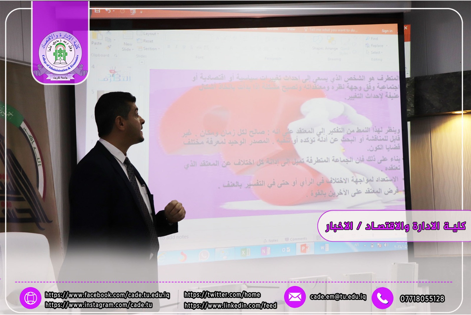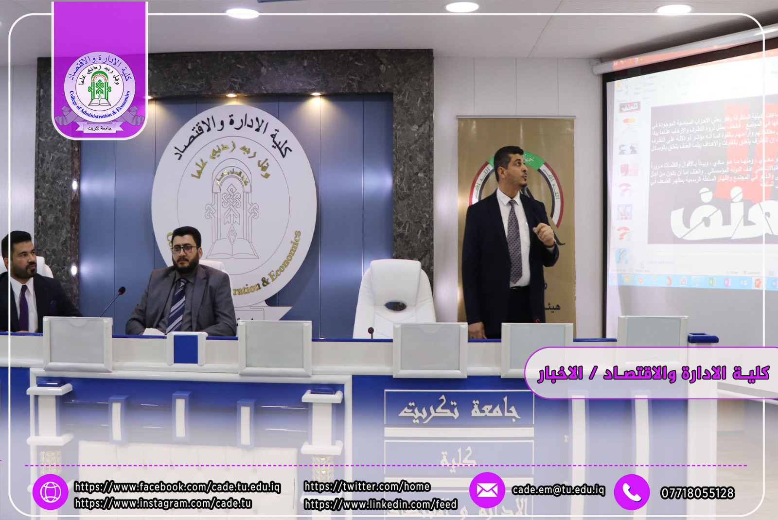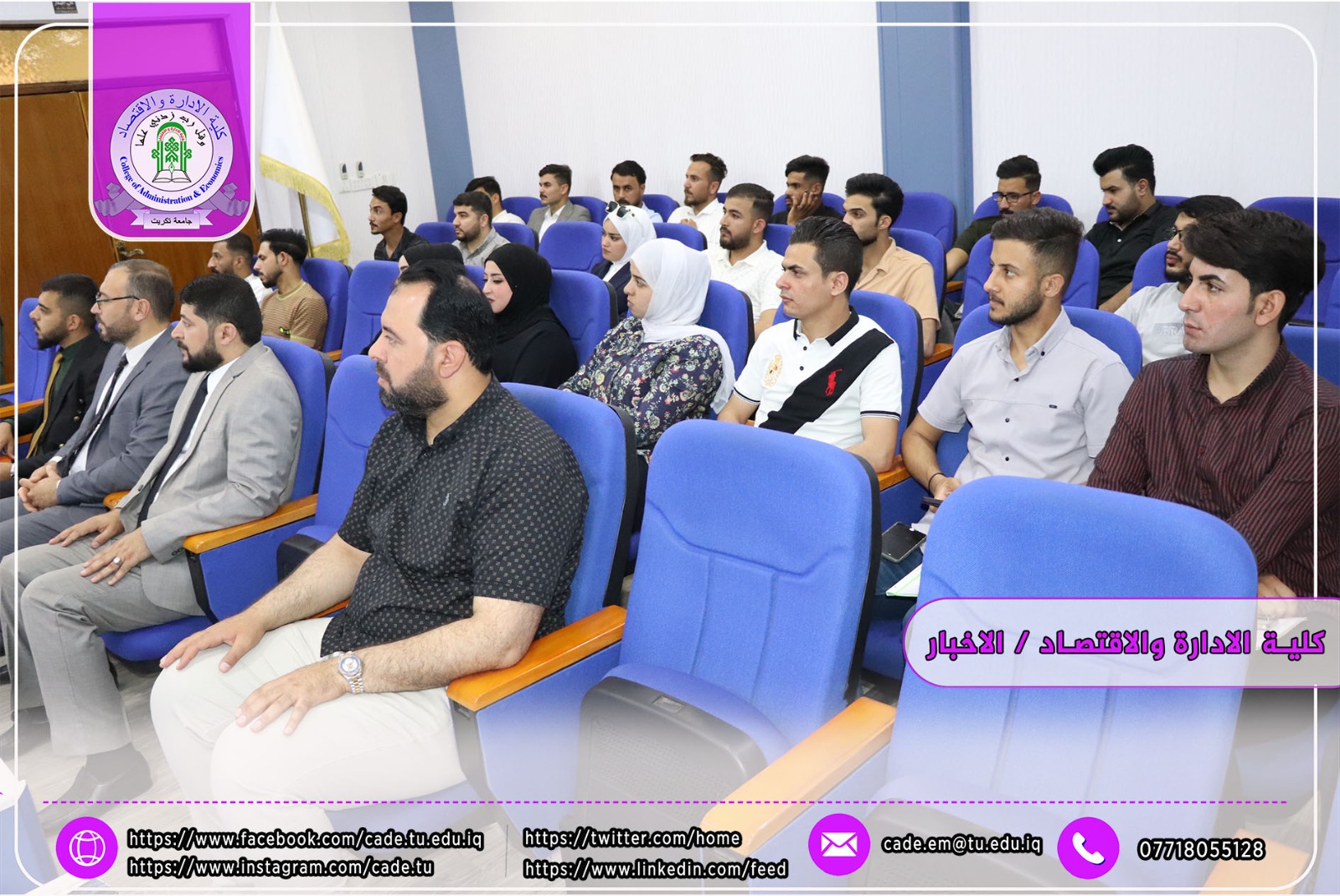 برعاية الاستاذ الدكتور وعد محمود رؤوف رئيس جامعة تكريت وبأشراف العميد الأستاذ الدكتور عبد الرزاق حمد حسين اقامت كلية الإدارة والاقتصاد وبالتعاون مع المديرية العامة لمكافحة الإرهاب الفكري/ مكتب صلاح الدين ندوة علمية بعنوان (ندوة علمية بعنوان العوامل الاجتماعية ودورها في تغذية الفكر المتطرف لدى الشباب) من قبل أ.م. د. قصي جاسم محمد م.م. علي محمد حويد العكيدي السيد علي جادالله علي وذلك يوم الاحد الموافق 2024/4/28 في تمام الساعة العاشرة صباحا على قاعة ا.د. محمد بدع.
