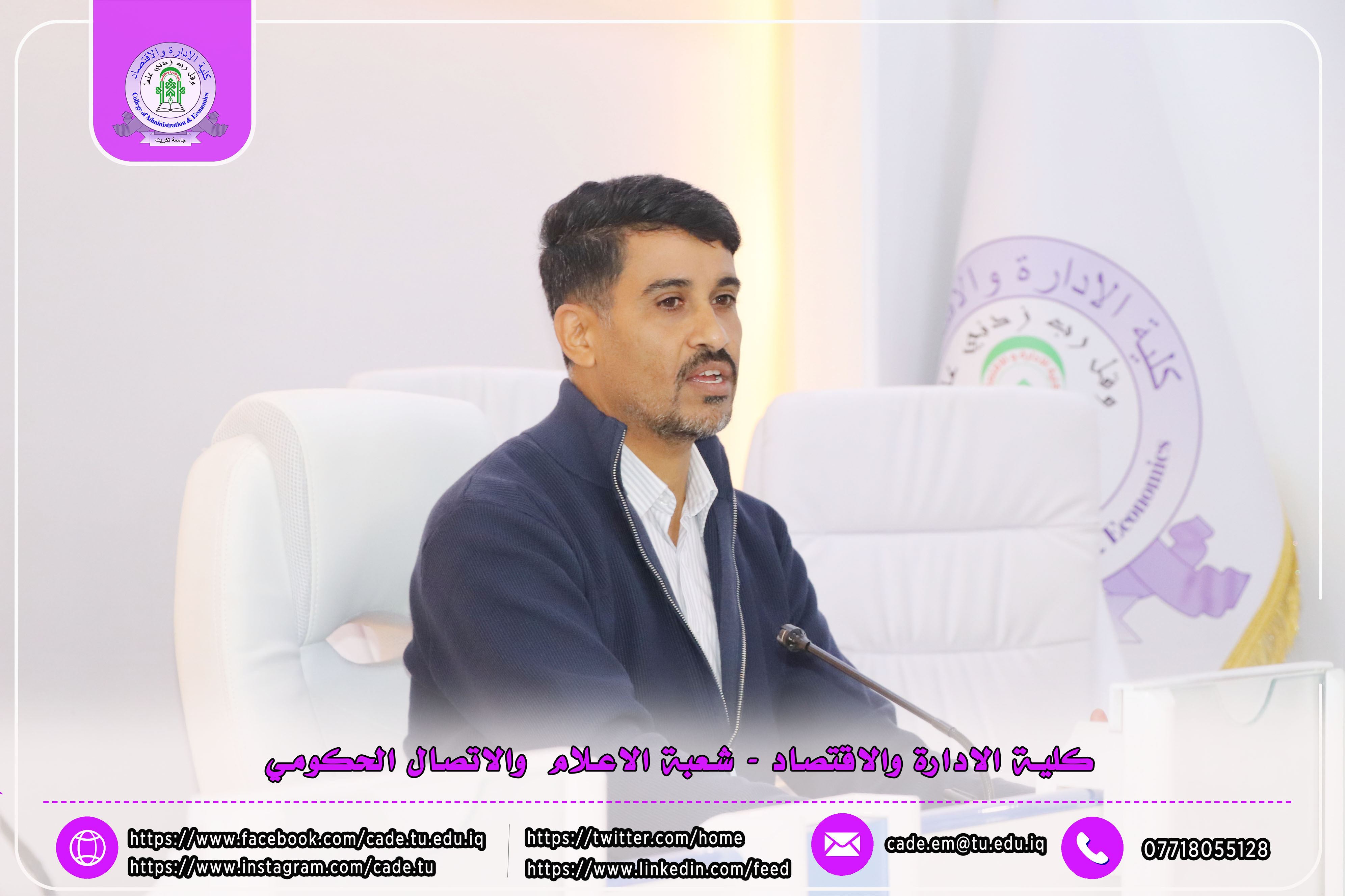 برعاية الأستاذ الدكتور وعد محمود رؤوف رئيس جامعة تكريت، وبإشراف كلٍّ من الأستاذ المساعد الدكتور فؤاد فرحان حسين عميد كلية الإدارة والاقتصاد، والأستاذ المساعد الدكتور سياف عبد حسين مدير مركز التعليم المستمر، نظّمت عمادة الكلية وبالتعاون مع مركز التعليم المستمر أعمال دورة علمية حضورية بعنوان ( الاقتصاد السلوكي وصناعة السياسات العامة في العصر الرقمي )، وذلك يوم الأربعاء الموافق 4/12/2025، في تمام الساعة العاشرة صباحاً، على قاعة الدكتور محمد بدع.
