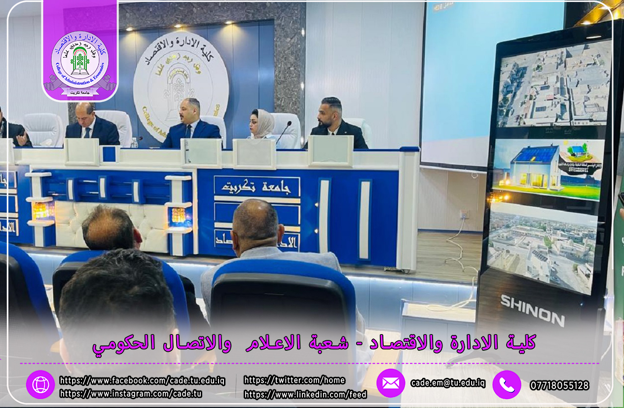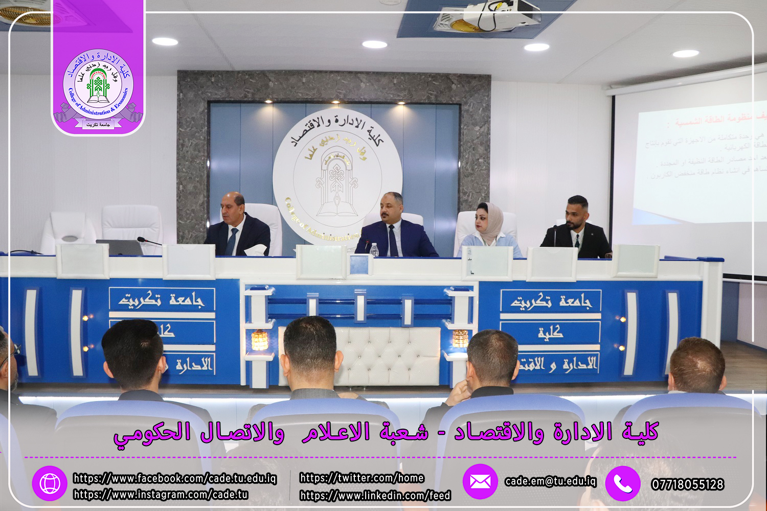 برعاية الأستاذ الدكتور وعد محمود رؤوف، رئيس جامعة تكريت، وإشراف الأستاذ الدكتور عبد الرزاق حمد حسين، عميد كلية الإدارة والاقتصاد، نظمت وحدة التأهيل والتوظيف والمتابعة بالتعاون مع المصرف العراقي الإسلامي للاستثمار والتنمية، يوم الثلاثاء الموافق 3/12/2024، ندوة علمية حضورية بعنوان "أهمية تمويل مشاريع الطاقة الشمسية"، وذلك في قاعة د. محمد بدع.