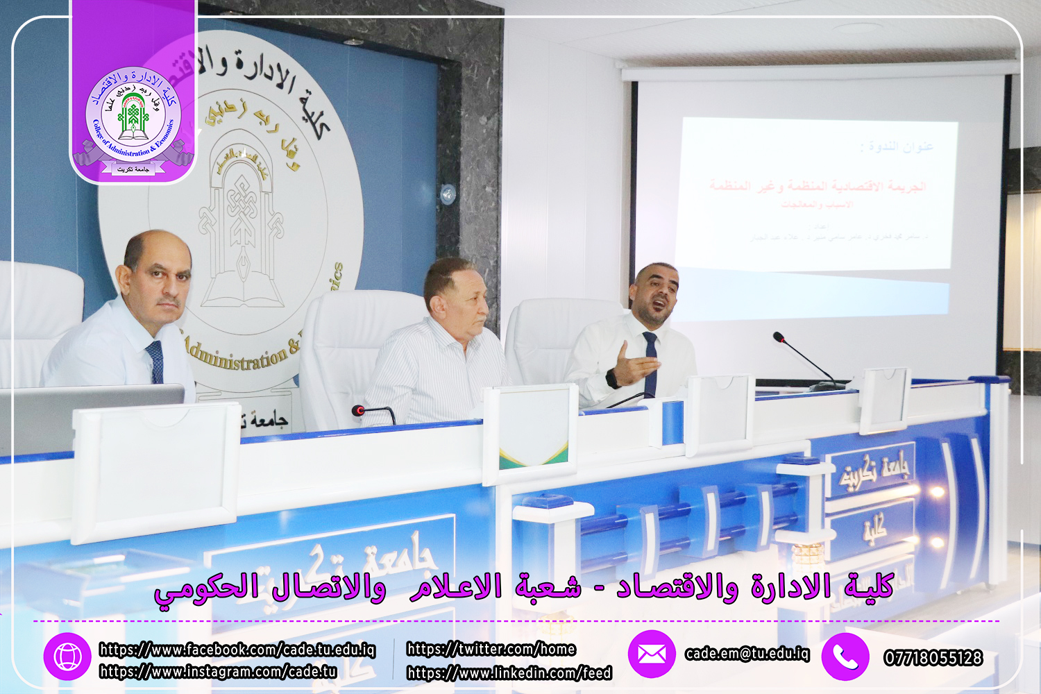 برعاية الأستاذ الدكتور وعد محمود رؤوف، رئيس جامعة تكريت، وبإشراف الأستاذ المساعد الدكتور فؤاد فرحان حسين، عميد كلية الإدارة والاقتصاد، نظّمت وحدة التأهيل والتوظيف والمتابعة في الكلية دورة تطويرية بعنوان "متطلبات وثائق الجودة في المؤسسات التعليمية"، وذلك يوم الثلاثاء الموافق 6 / 5 / 2025، على قاعة الدكتور محمد بدع.