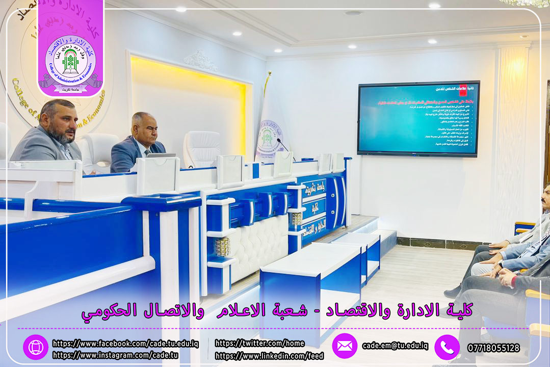 برعاية الأستاذ الدكتور وعد محمود رؤوف، رئيس جامعة تكريت، وبإشراف الأستاذ المساعد الدكتور فؤاد فرحان حسين، عميد كلية الإدارة والاقتصاد، نظّمت وحدة الإرشاد النفسي والتوجيه التربوي ندوة علمية بعنوان "ظاهرة المخدرات: الأسباب والمعالجة"، وذلك ضمن فعاليات الأسبوع العراقي لمكافحة المخدرات، وذلك يوم الأحد الموافق 16/11/2025، في تمام الساعة العاشرة صباحًا على قاعة الدكتور محمد بدع.