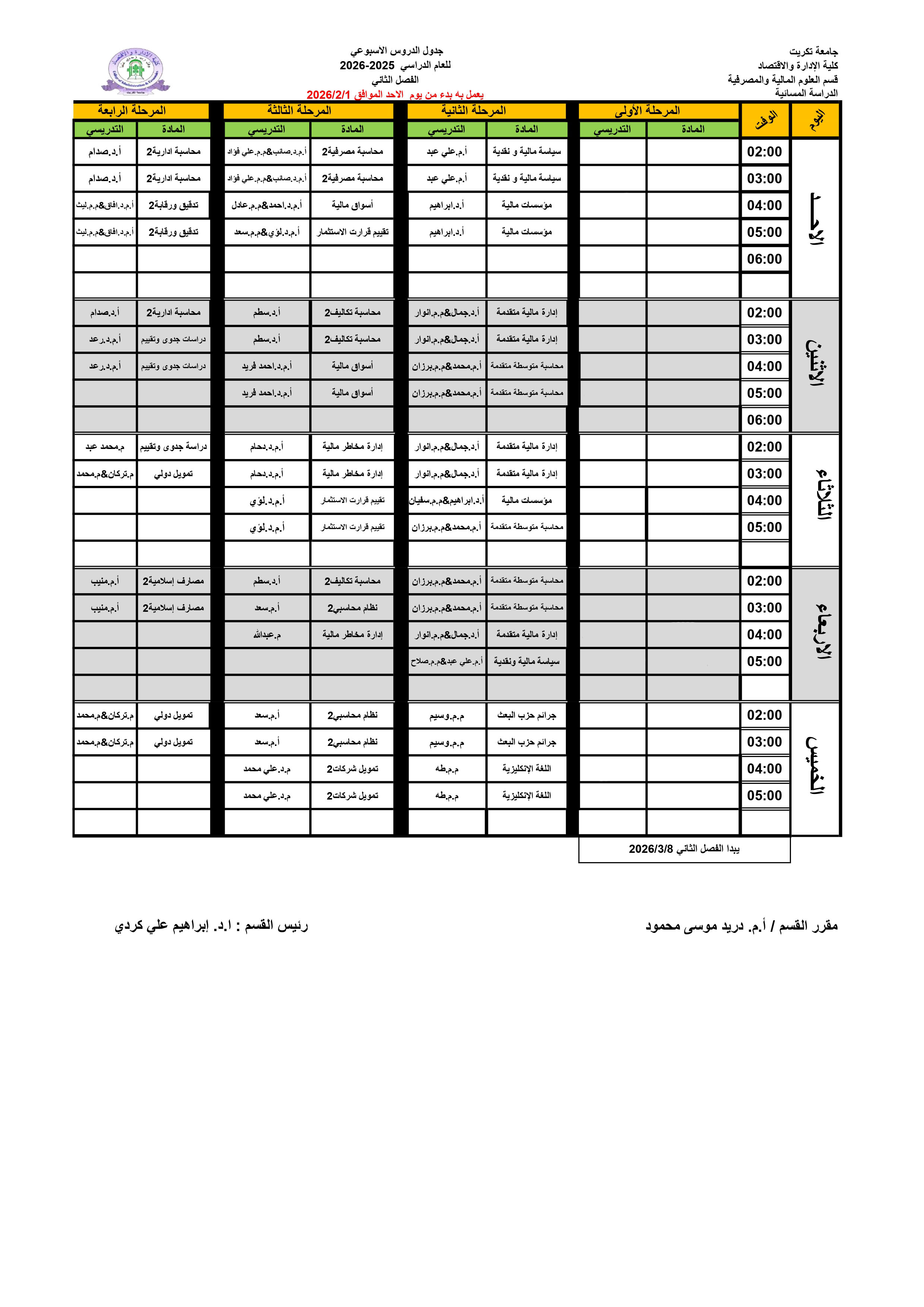 استنادًا إلى كتاب وزارة التعليم العالي والبحث العلمي / دائرة الدراسات والتخطيط والمتابعة / قسم الدراسات والتخطيط، والمتضمن التقويم الجامعي للعام الدراسي 2025–2026 للمراحل ما فوق الأولى، ووفقًا لما ورد في الفقرة رابعًا التي تنص على بدء الفصل الدراسي الثاني، تعلن عمادة كلية الإدارة والاقتصاد عن نشر جدول الدروس الأسبوعي لطلبة الدراسات الأولية للدراستين الصباحية والمسائية.