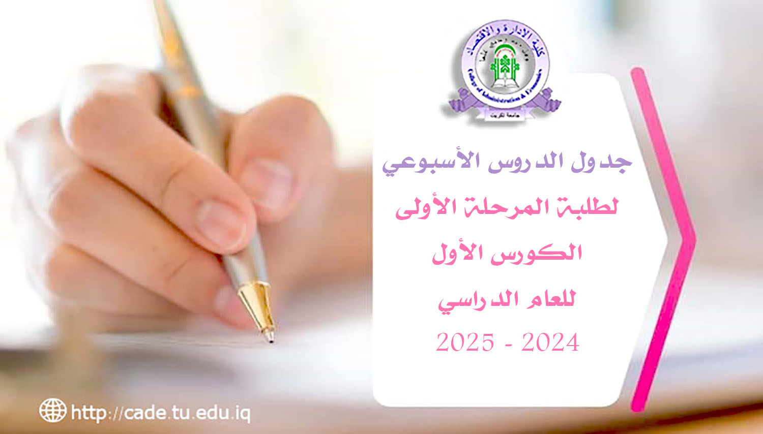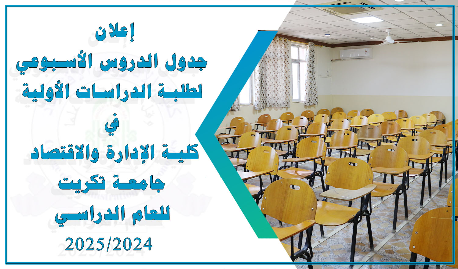 تعلن عمادة كلية الإدارة والاقتصاد / جامعة تكريت عن نشر جدول الدروس الأسبوعي لطلبة المرحلة الأولى للدراستين الصباحية والمسائية، وذلك للفصل الدراسي الأول من العام الدراسي 2024/2025. وأوضحت العمادة أن العمل بالجدول سيبدأ اعتبارًا من يوم الأحد الموافق 10 /11/ 2024.