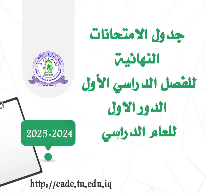 يسر عمادة كلية الإدارة والاقتصاد أن تعلن لطلبتها الأعزاء في الدراسات الأولية للدراستين (الصباحية والمسائية) عن نشر جدول الامتحانات النهائية للفصل الدراسي الأول / الدور الأول للعام الدراسي 2024-2025.