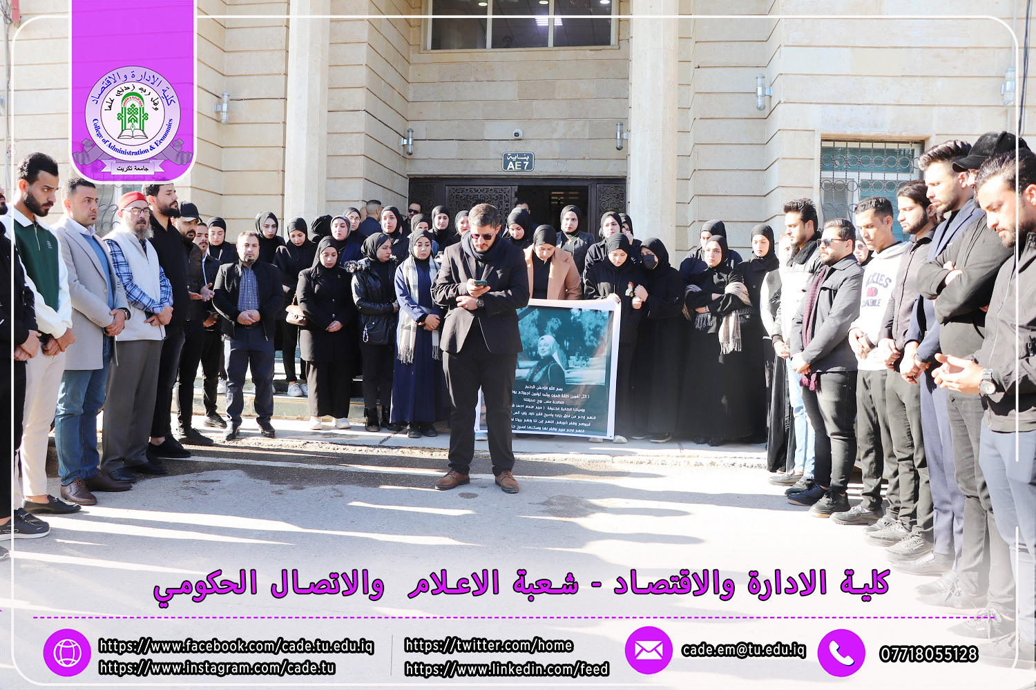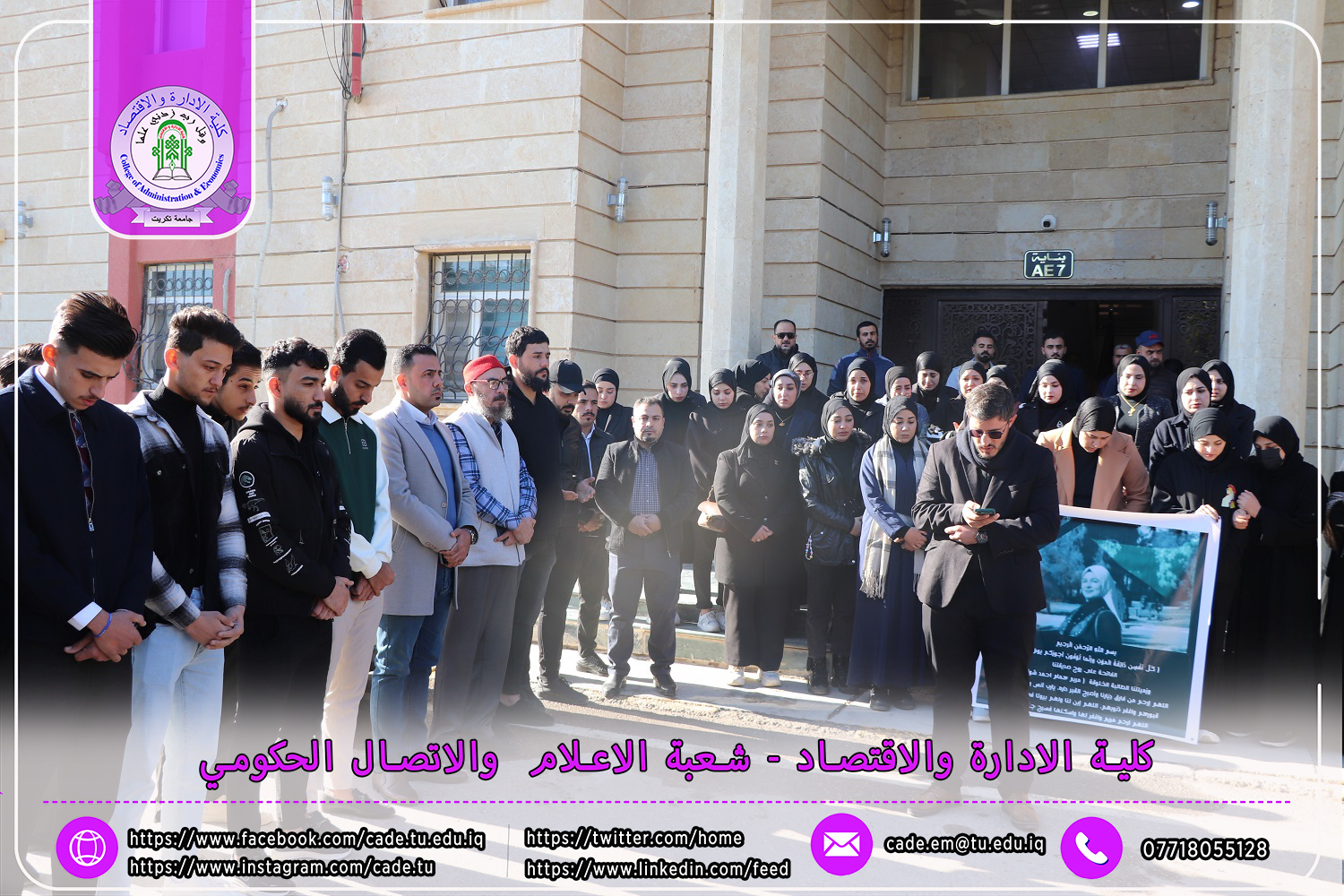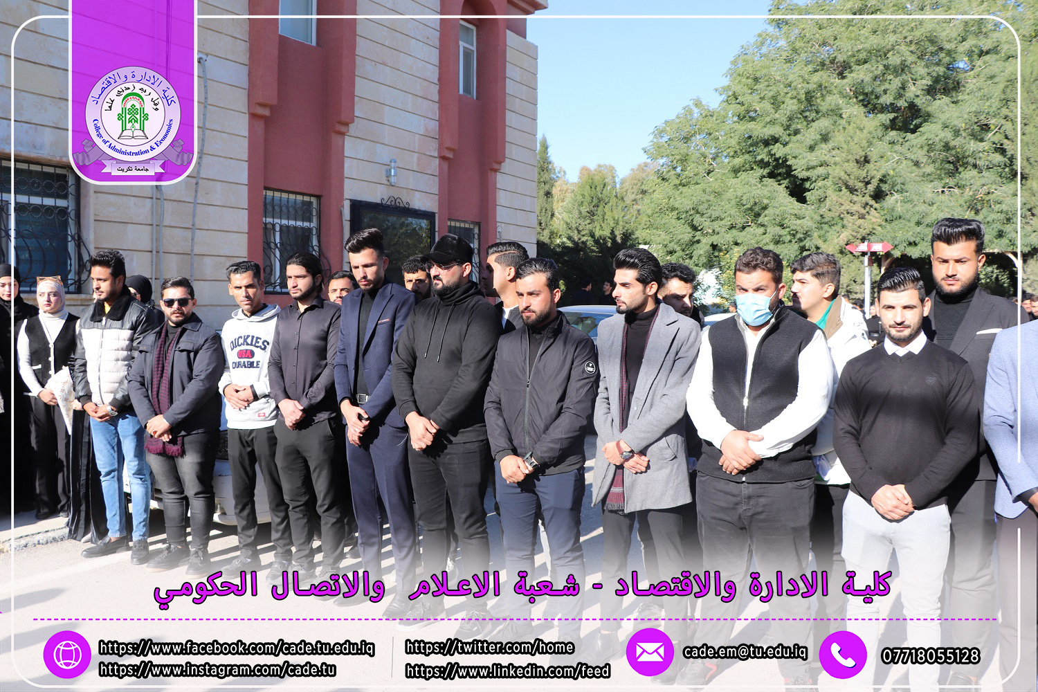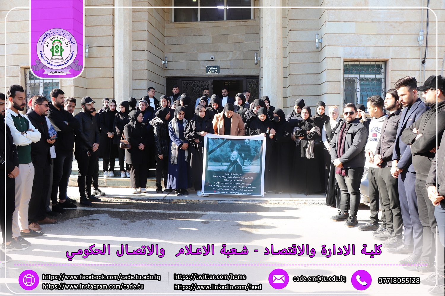 نظم طلبة قسم العلوم المالية والمصرفية في كلية الإدارة والاقتصاد / جامعة تكريت وقفة حداد استذكارًا لروح زميلتهم المرحومة الطالبة مريم همام أحمد شوقي، إحدى طالبات المرحلة الرابعة في القسم.