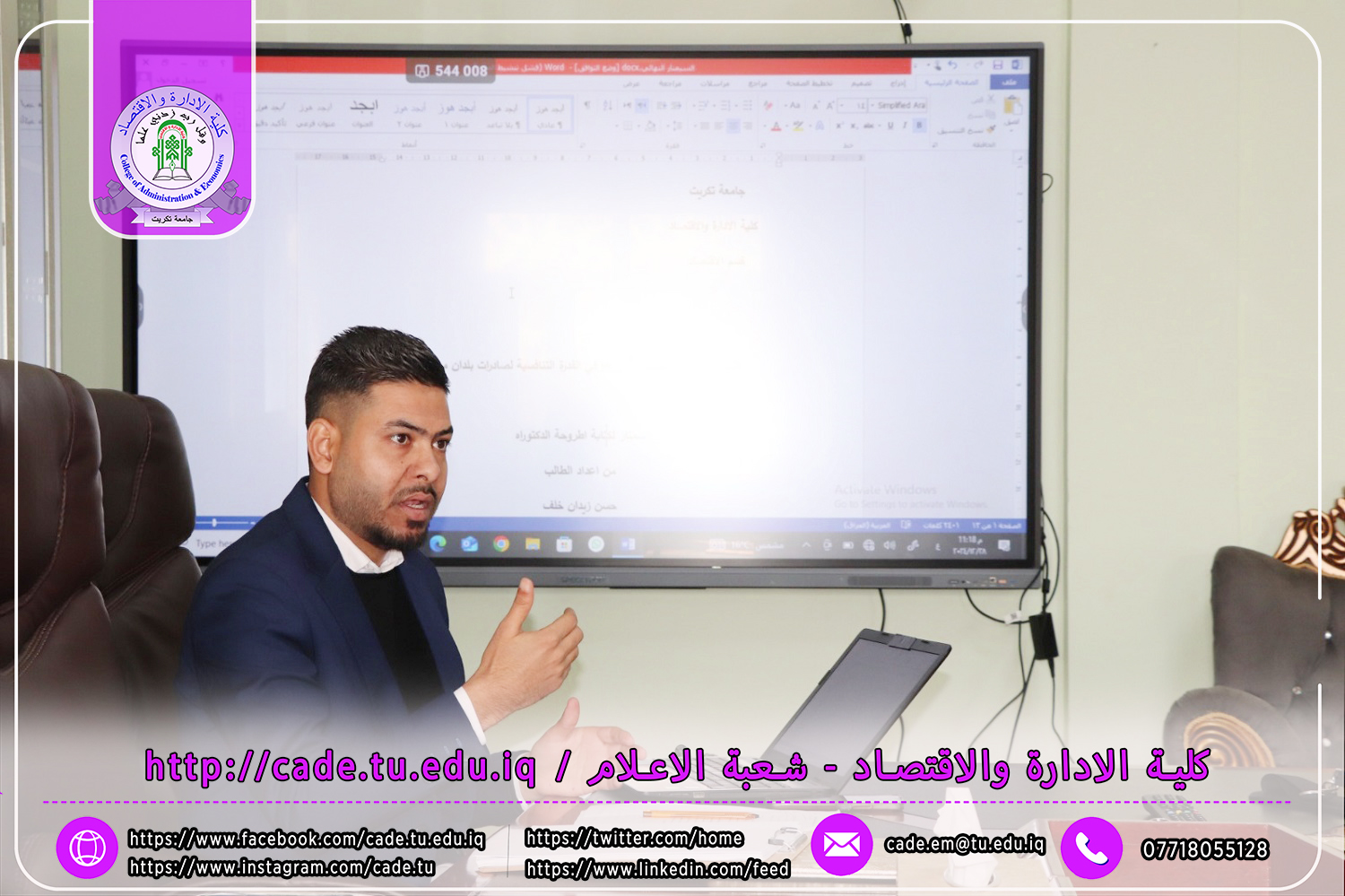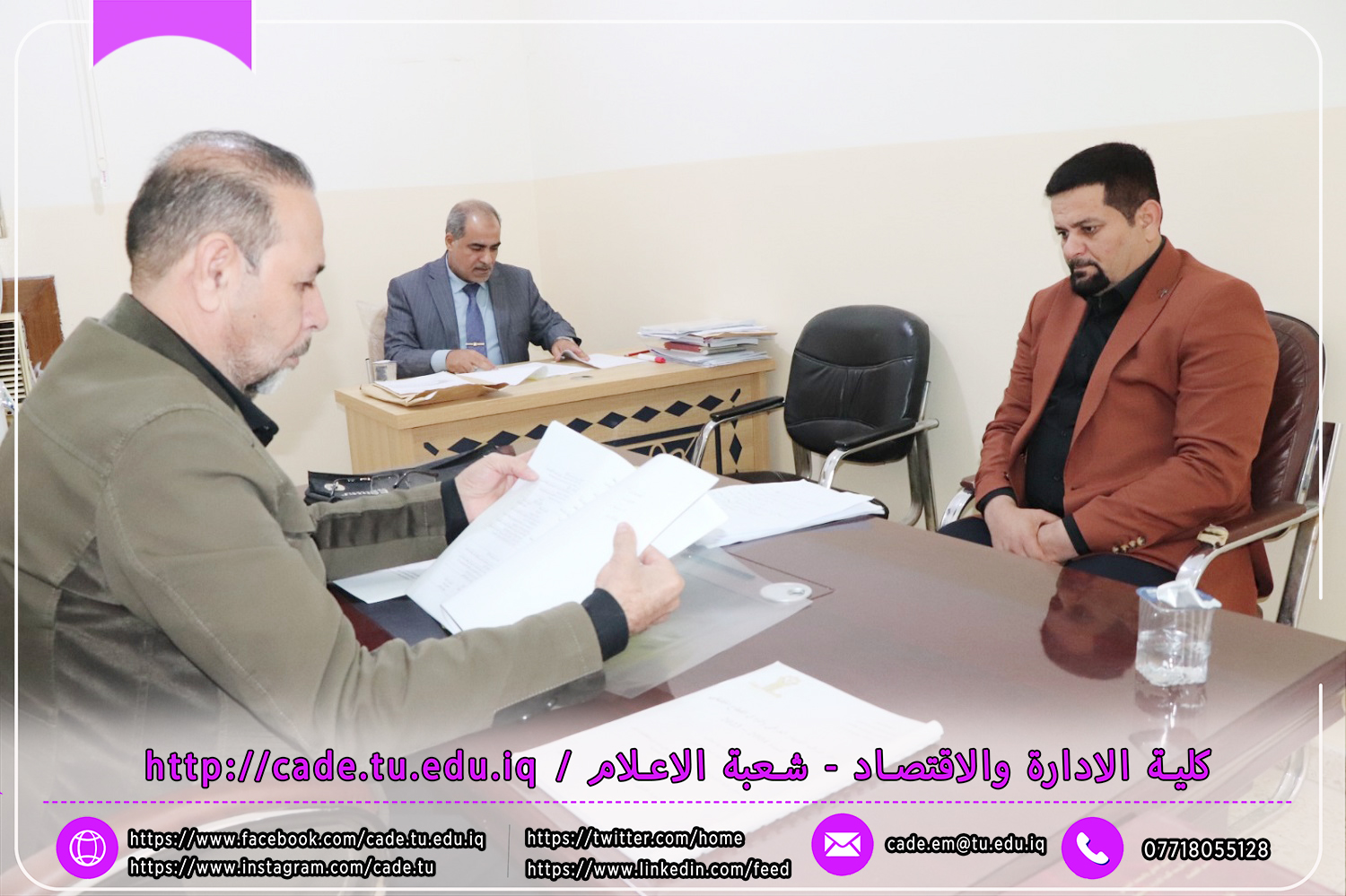 في إطار سعيه المتواصل للارتقاء بالمستوى الأكاديمي والبحثي، نظم قسم الاقتصاد في كلية الإدارة والاقتصاد يوم الأحد الموافق 2024/12/29 الامتحان الشامل الشفهي لطلبة الدكتوراه. وشارك في هذا الامتحان ثلاثة من طلبة الدكتوراه، وهم: الطالب حسن زيدان خلف، والطالب قاسم أكريم أحمد، و الطالبة عبير عباس حمادي.
