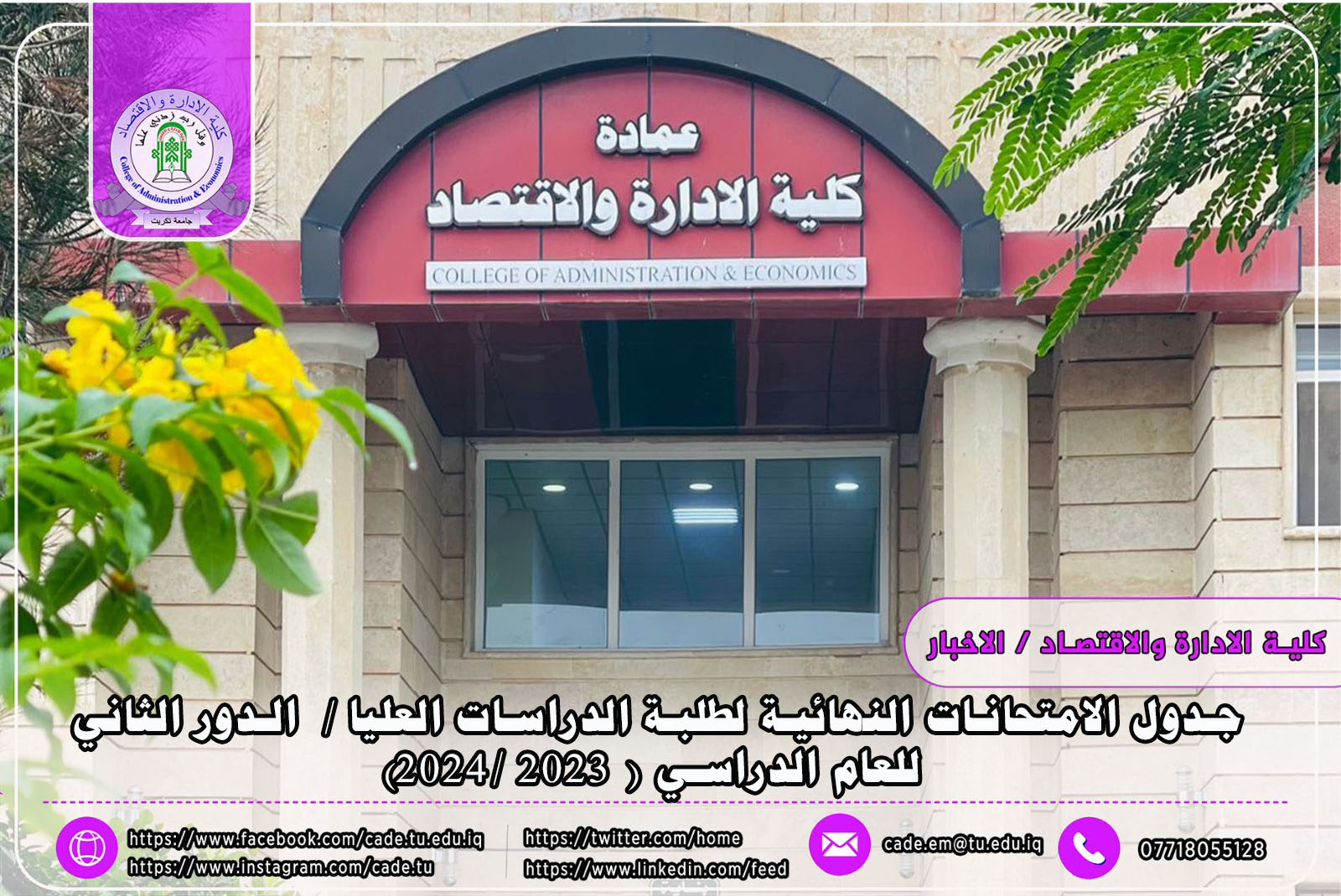 تعلن كلية الإدارة والاقتصاد – جامعة تكريت عن نشر جدول الامتحانات النهائية / الدور الثاني / الكورس الأول الثاني/ لطلبة الدراسات العليا / للعام الدراسي 2024/2023.