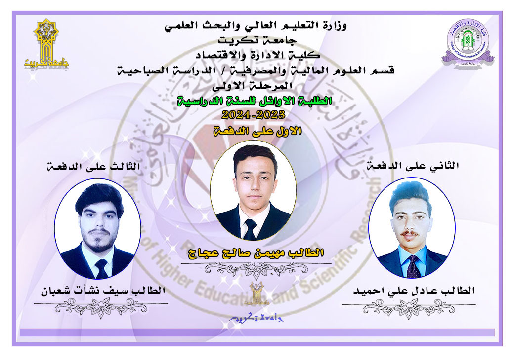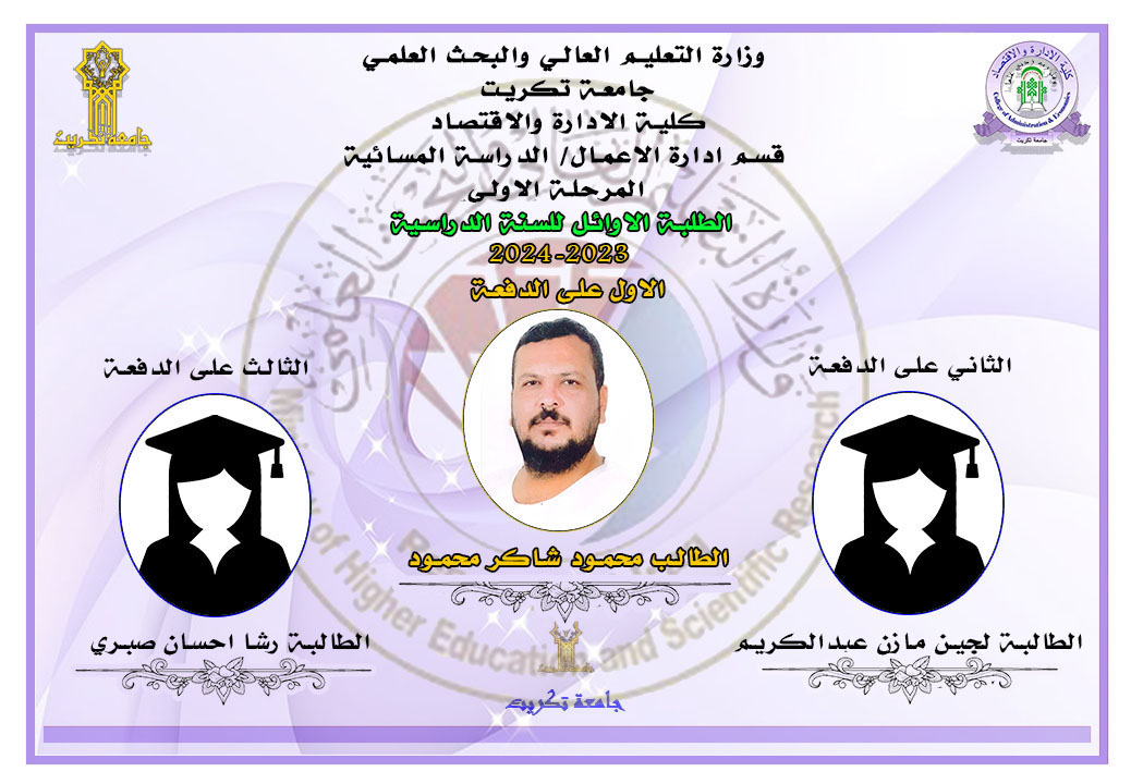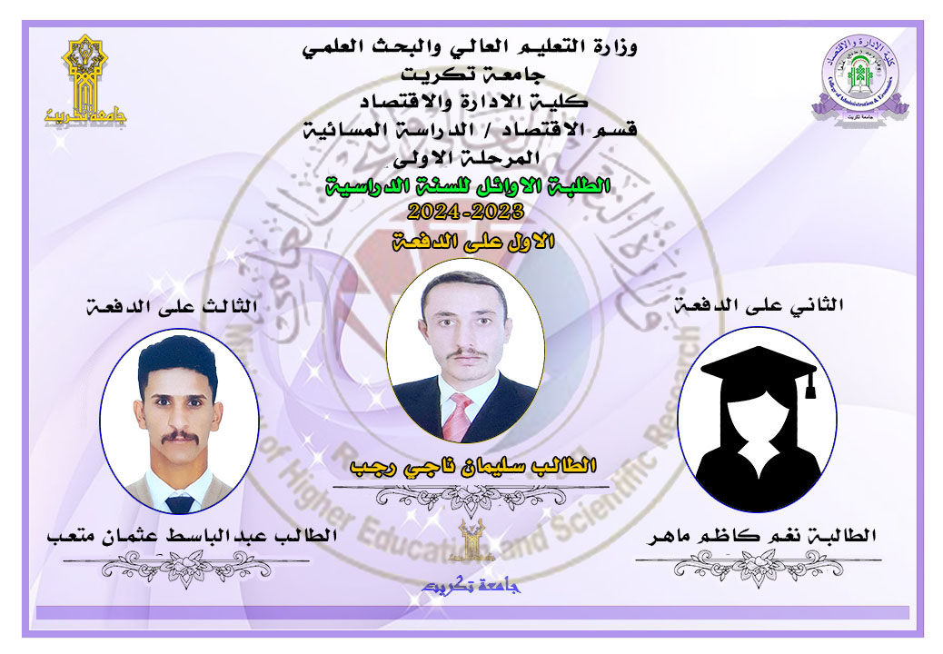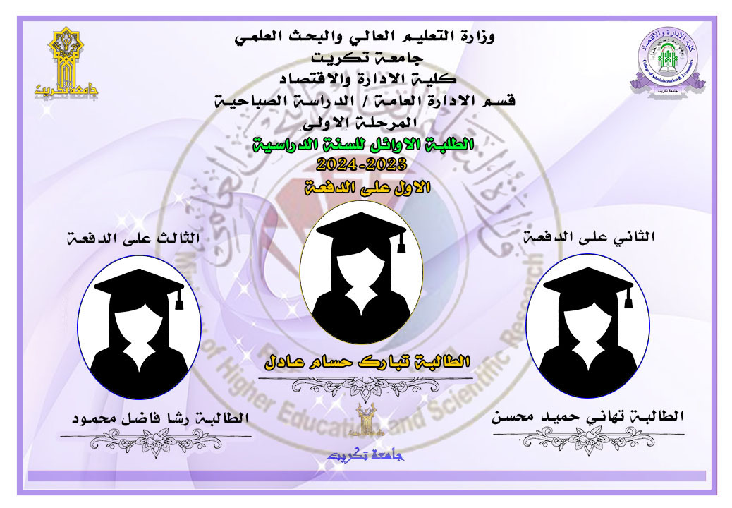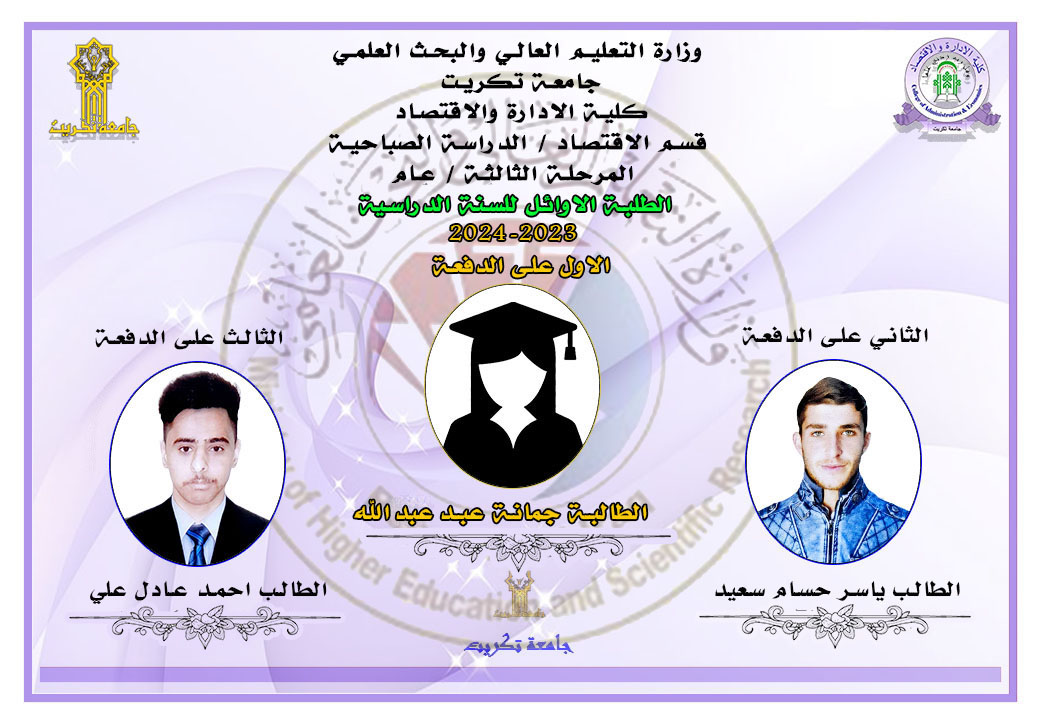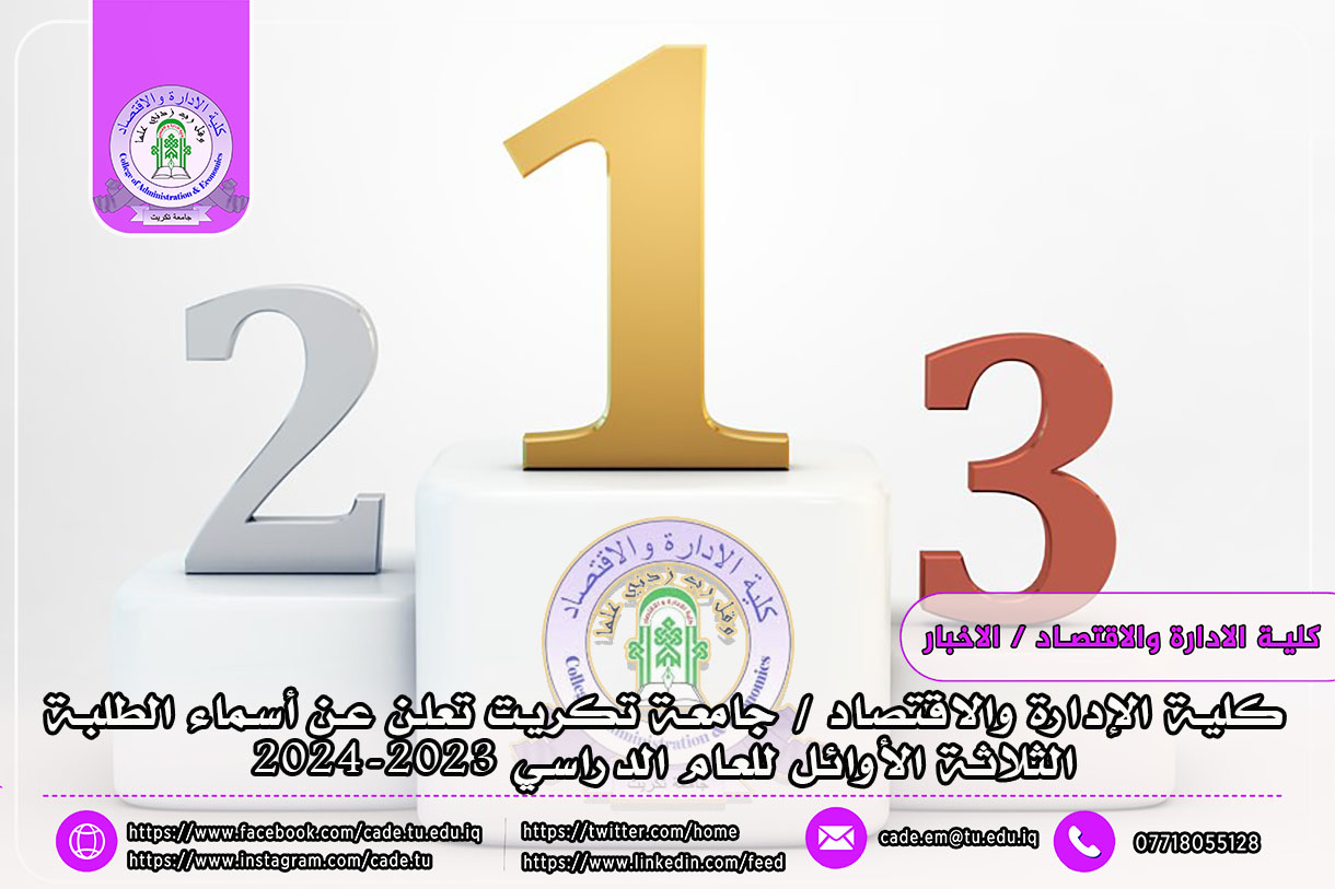 تعلن عمادة كلية الإدارة والاقتصاد / جامعة تكريت عن المباشرة بنشر أسماء الطلبة الثلاثة الأوائل على المراحل الاولى والثانية والثالثة للدراستين (الصباحية والمسائية) للعام الدراسي 2023-2024. وجاء هذا الإعلان تكريماً للجهود الكبيرة التي بذلها الطلبة طوال العام الدراسي وتقديراً لإنجازاتهم الأكاديمية المميزة.
