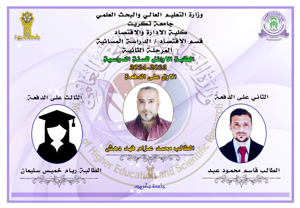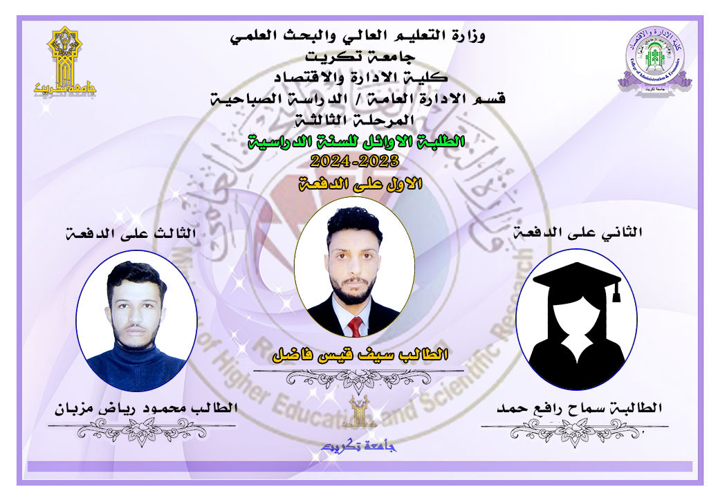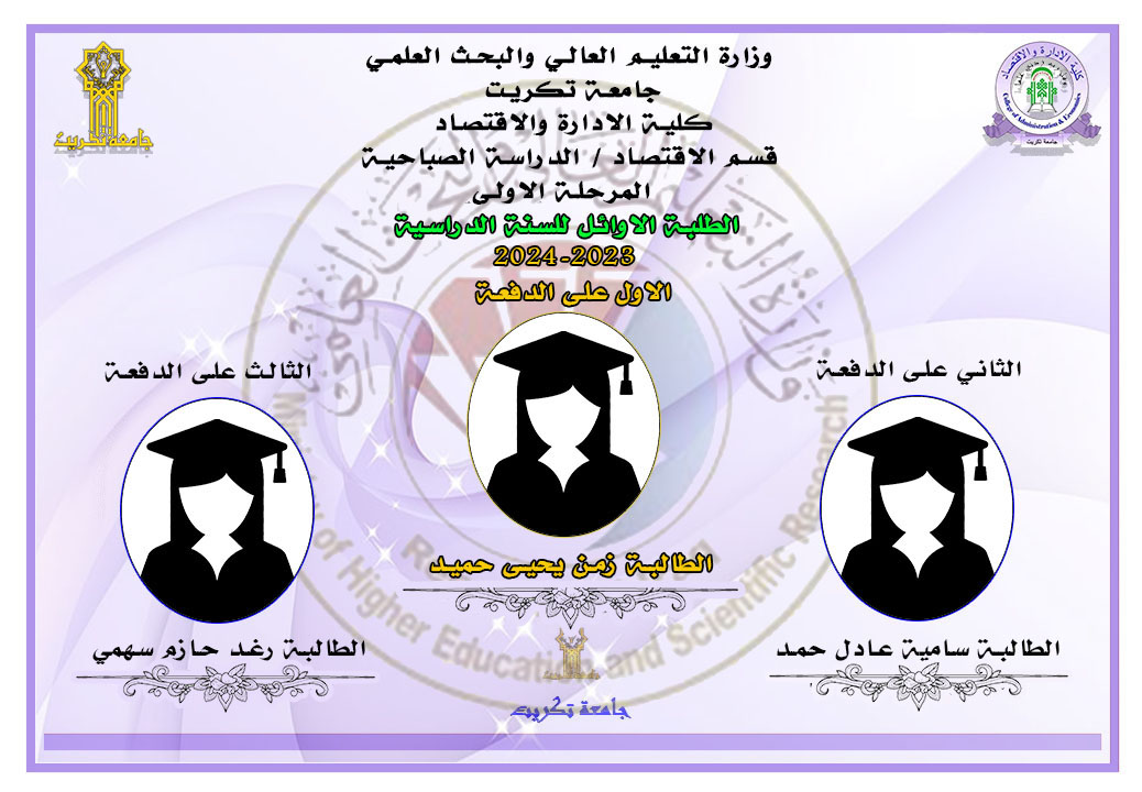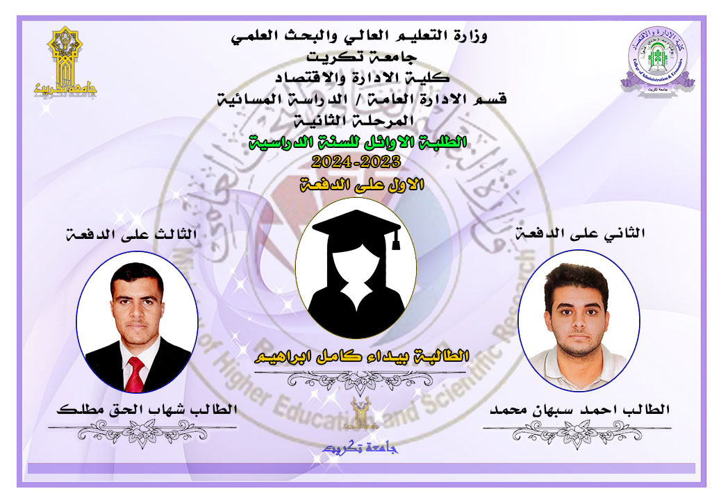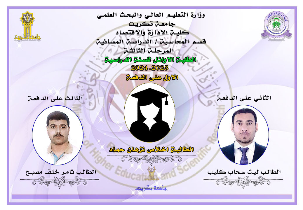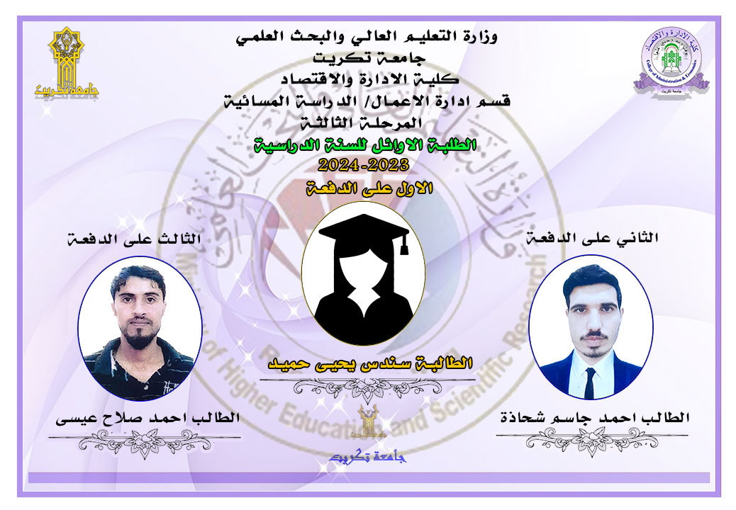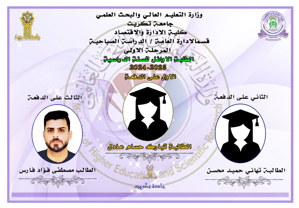 تعلن عمادة كلية الإدارة والاقتصاد / جامعة تكريت عن المباشرة بنشر أسماء الطلبة الثلاثة الأوائل على المراحل الاولى والثانية والثالثة للدراستين (الصباحية والمسائية) للعام الدراسي 2023-2024. وجاء هذا الإعلان تكريماً للجهود الكبيرة التي بذلها الطلبة طوال العام الدراسي وتقديراً لإنجازاتهم الأكاديمية المميزة.