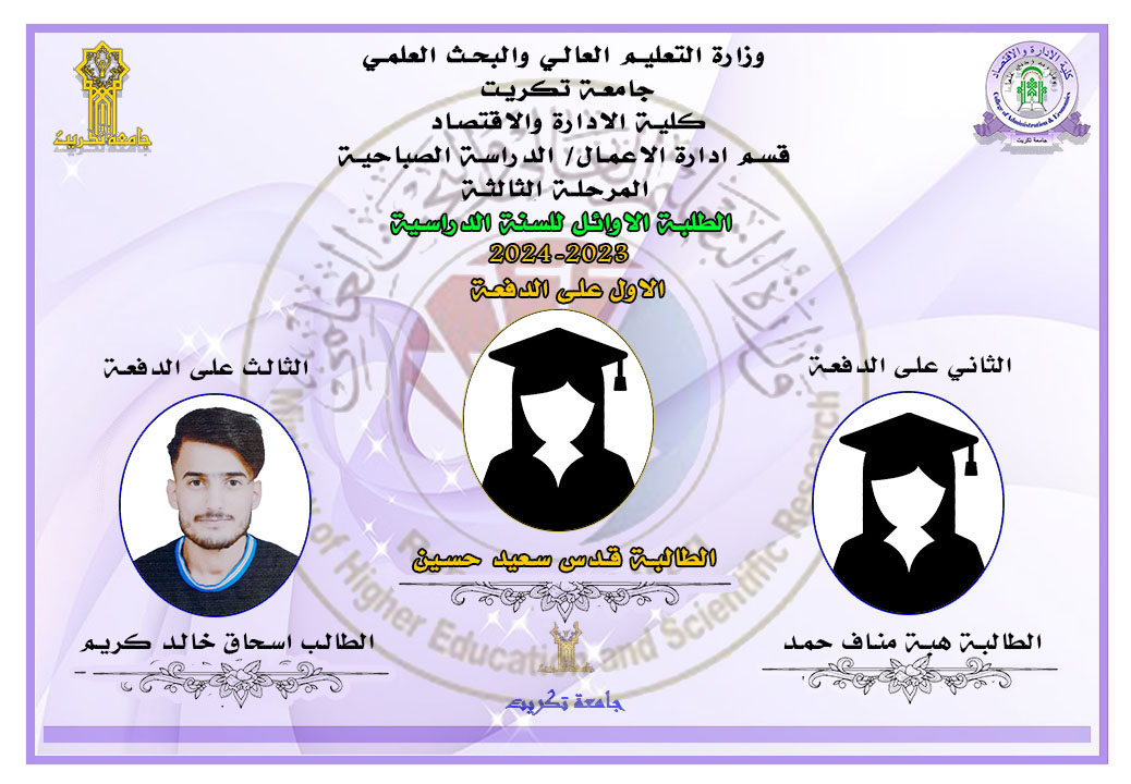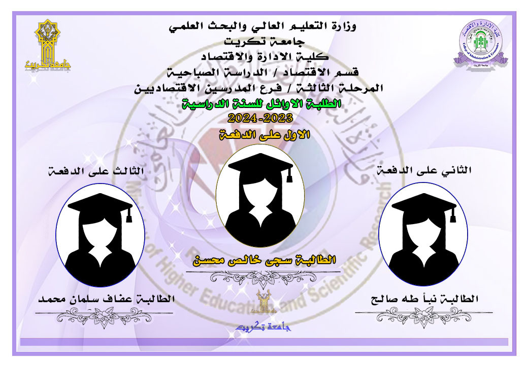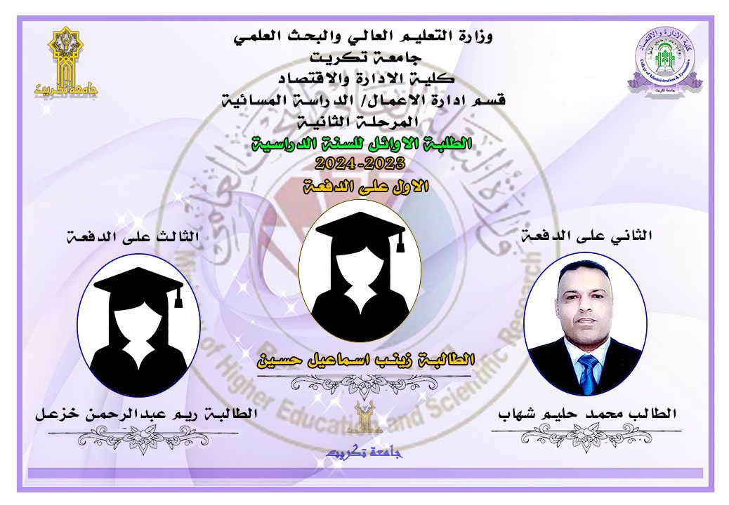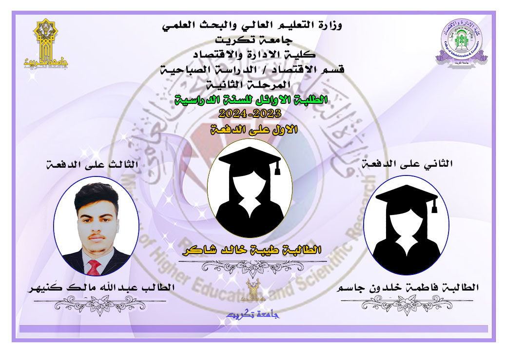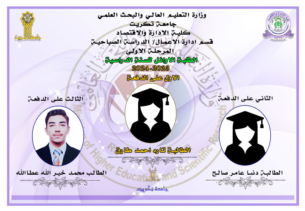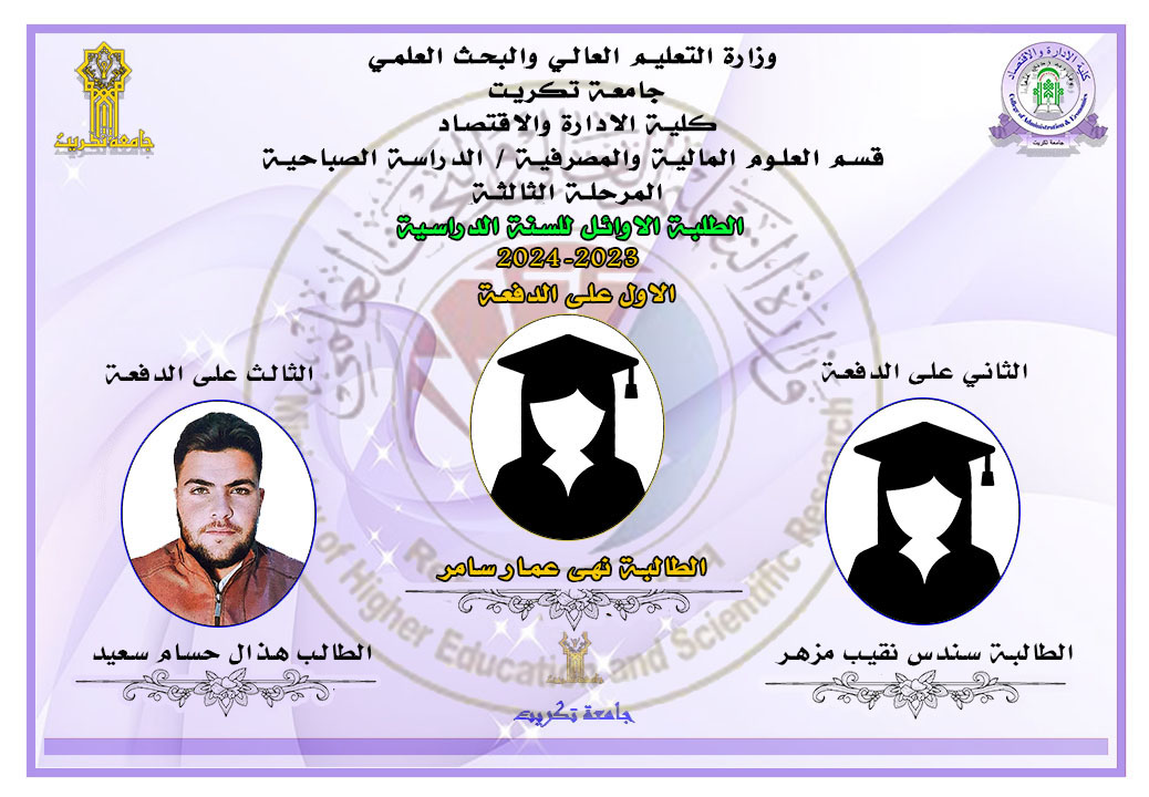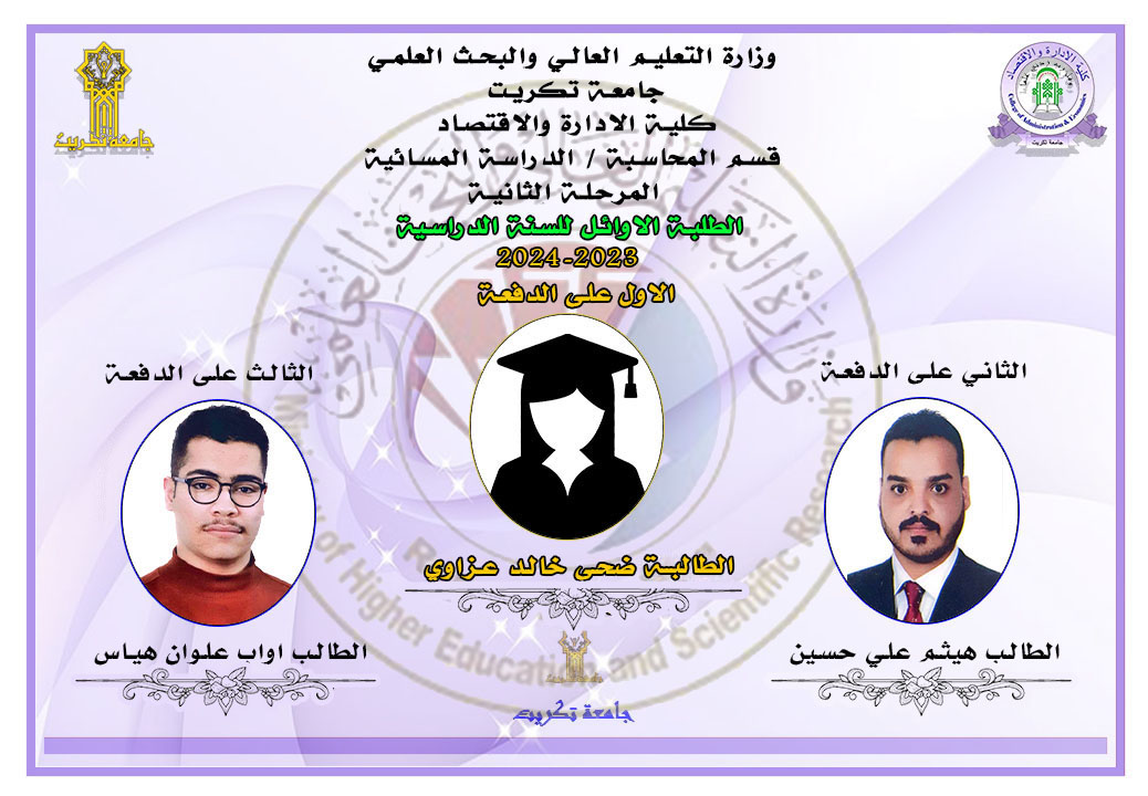 تعلن عمادة كلية الإدارة والاقتصاد / جامعة تكريت عن المباشرة بنشر أسماء الطلبة الثلاثة الأوائل على المراحل الاولى والثانية والثالثة للدراستين (الصباحية والمسائية) للعام الدراسي 2023-2024. وجاء هذا الإعلان تكريماً للجهود الكبيرة التي بذلها الطلبة طوال العام الدراسي وتقديراً لإنجازاتهم الأكاديمية المميزة.