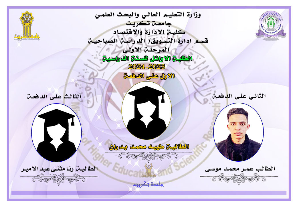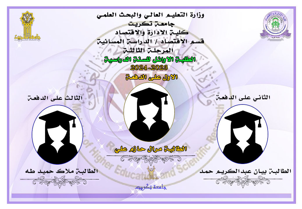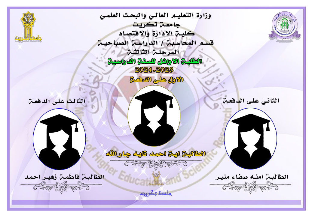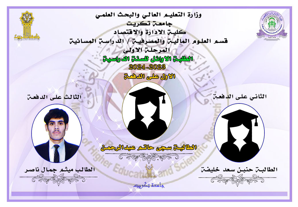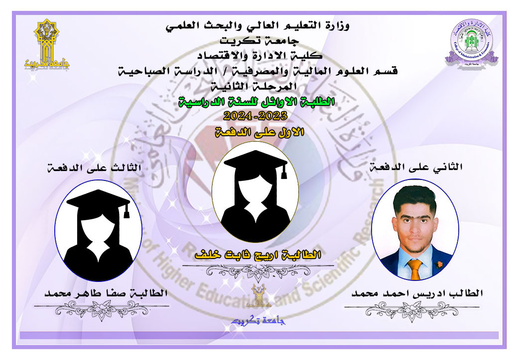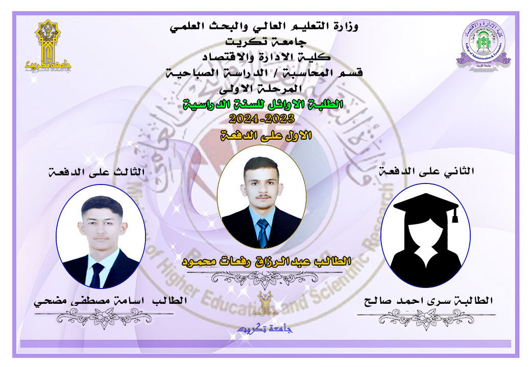 تعلن عمادة كلية الإدارة والاقتصاد / جامعة تكريت عن المباشرة بنشر أسماء الطلبة الثلاثة الأوائل على المراحل الاولى والثانية والثالثة للدراستين (الصباحية والمسائية) للعام الدراسي 2023-2024. وجاء هذا الإعلان تكريماً للجهود الكبيرة التي بذلها الطلبة طوال العام الدراسي وتقديراً لإنجازاتهم الأكاديمية المميزة.