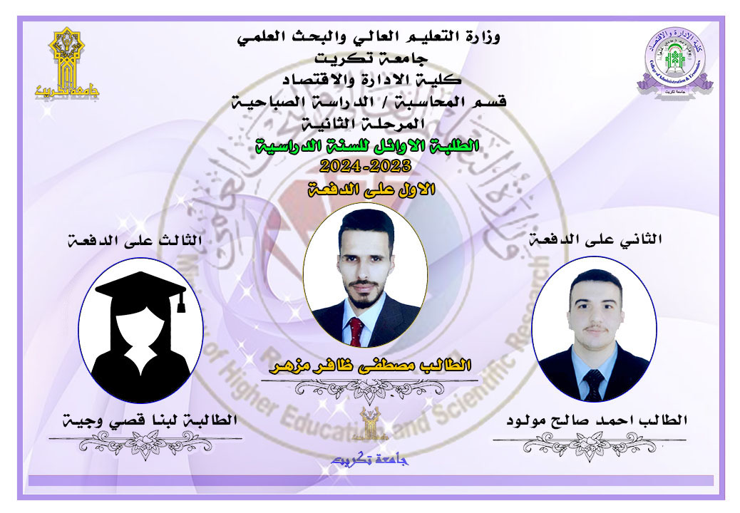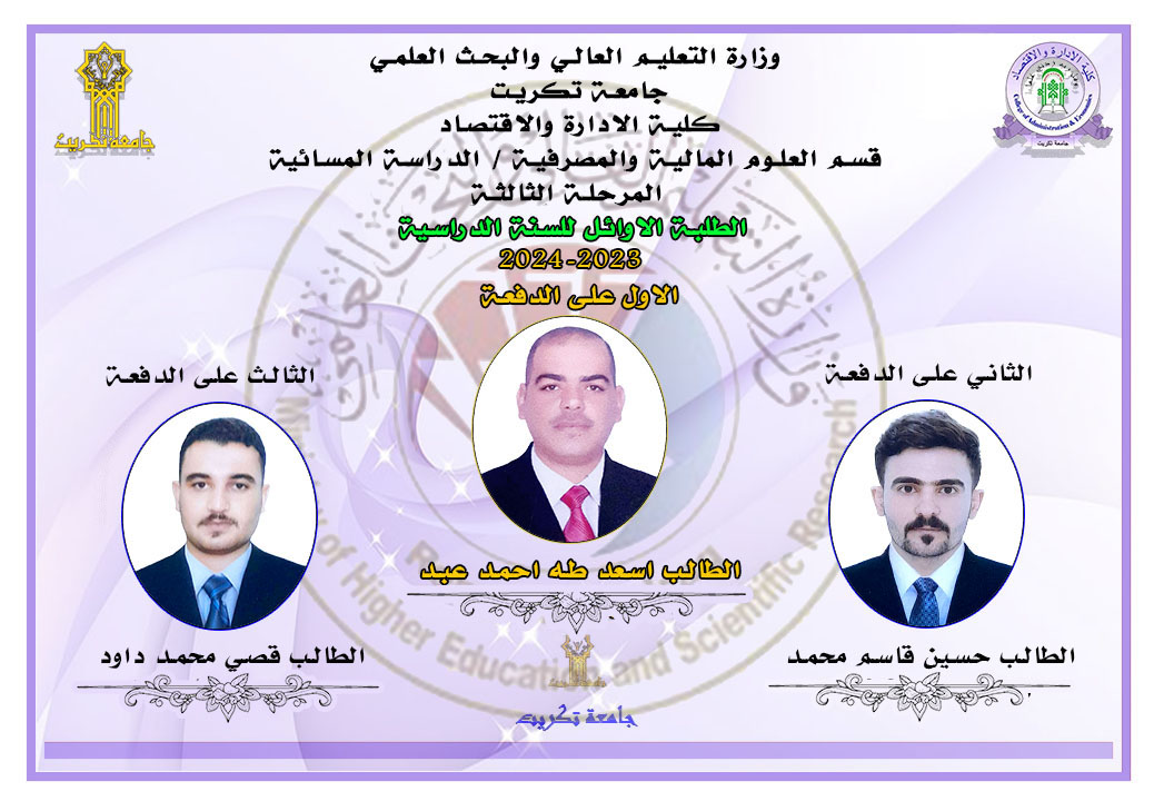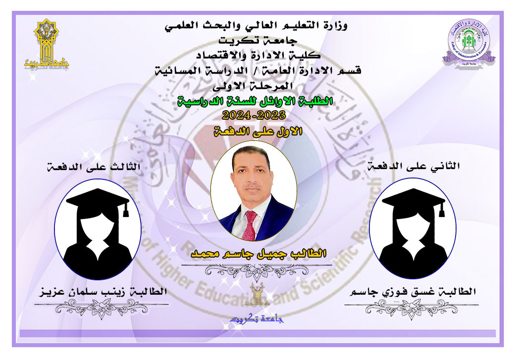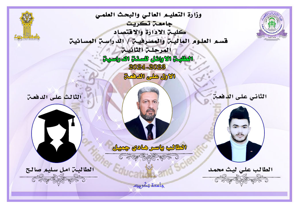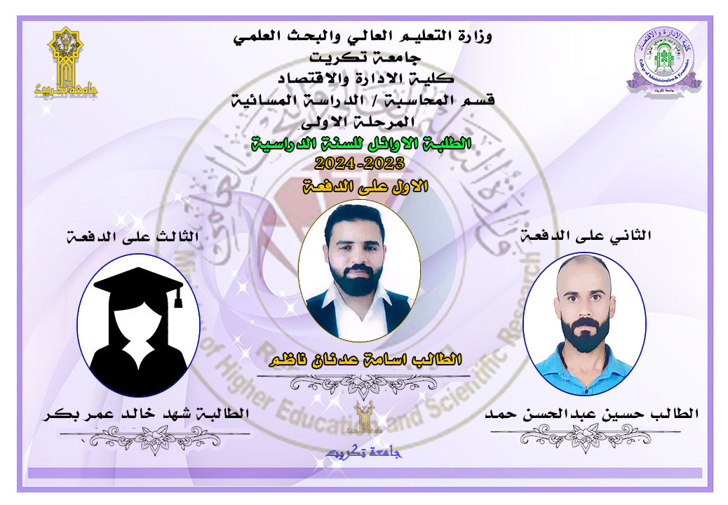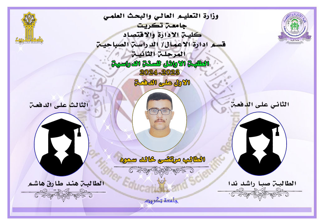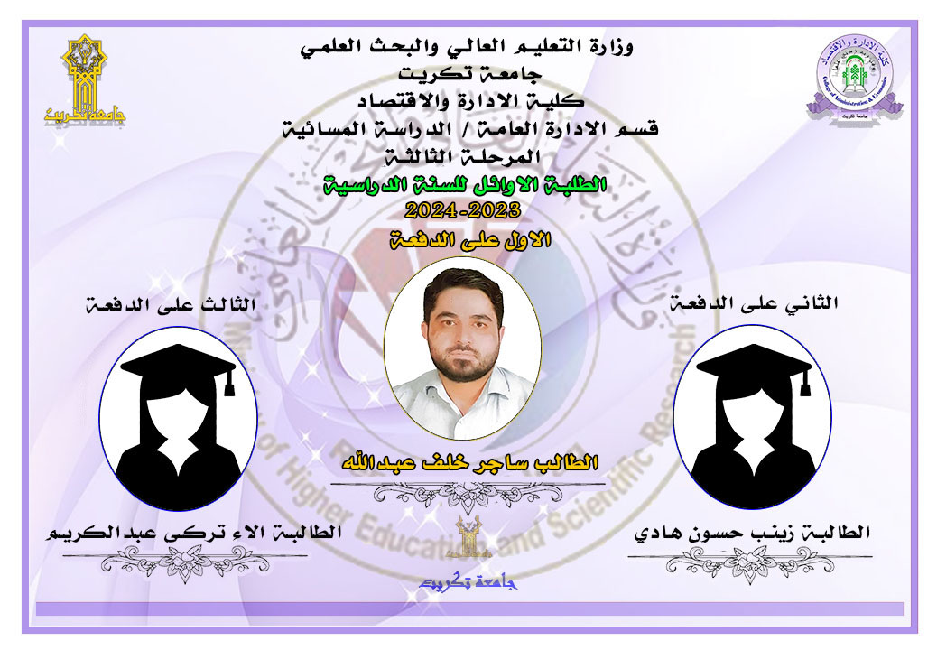 تعلن عمادة كلية الإدارة والاقتصاد / جامعة تكريت عن المباشرة بنشر أسماء الطلبة الثلاثة الأوائل على المراحل الاولى والثانية والثالثة للدراستين (الصباحية والمسائية) للعام الدراسي 2023-2024. وجاء هذا الإعلان تكريماً للجهود الكبيرة التي بذلها الطلبة طوال العام الدراسي وتقديراً لإنجازاتهم الأكاديمية المميزة.