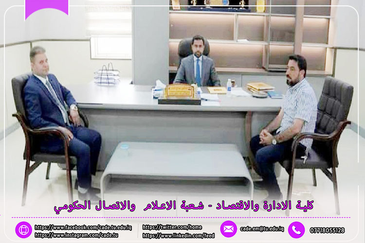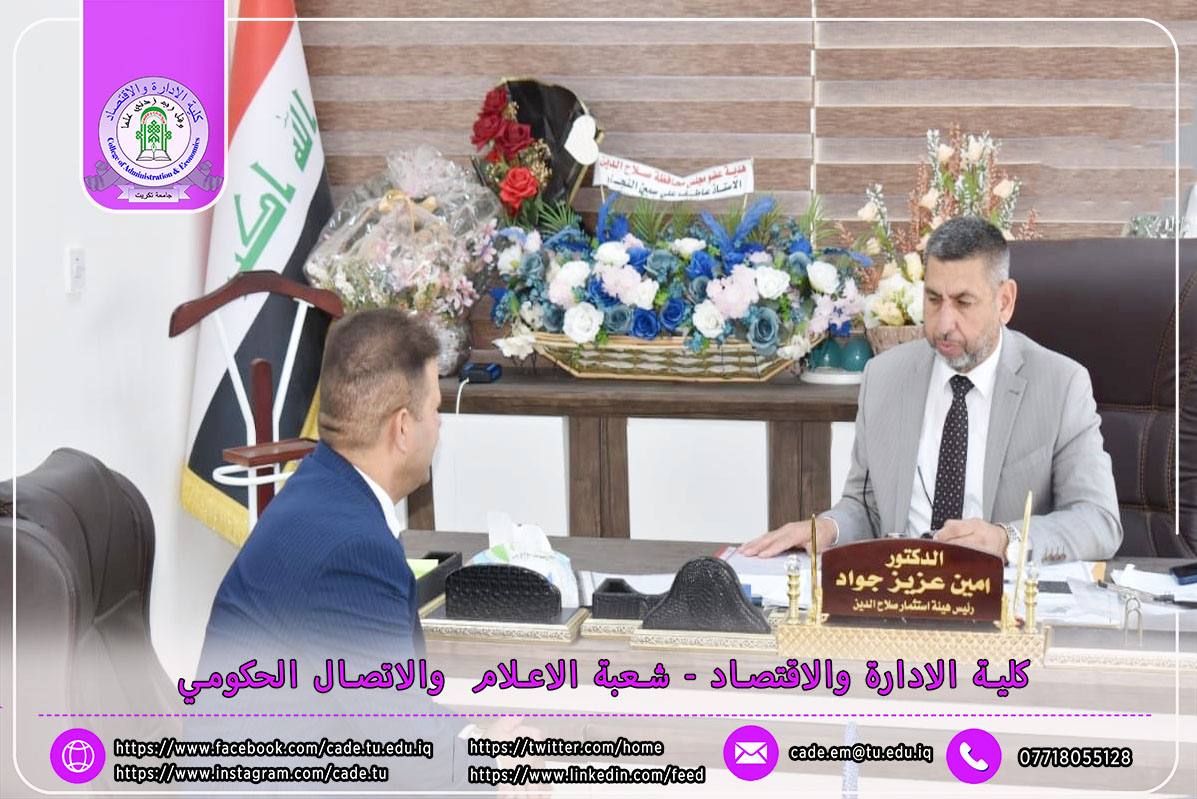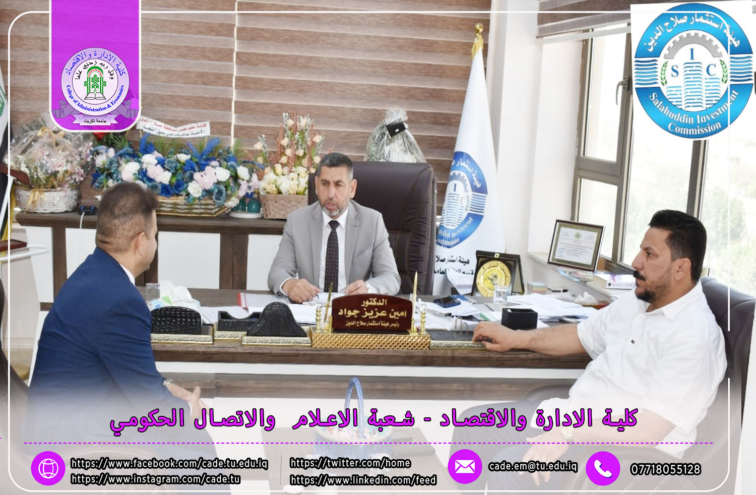 في إطار البرنامج التسويقي للخدمات التي يقدمها المكتب الاستشاري التابع لكلية الإدارة والاقتصاد/ جامعة تكريت، وضمن جهود تعزيز التعاون المشترك مع دوائر محافظة صلاح الدين، قام رئيس المكتب الاستشاري، أ.م.د فراس فرحان جدي، بزيارة هيئة استثمار صلاح الدين لعرض خدمات المكتب وبحث فرص الشراكة المستقبلية.
