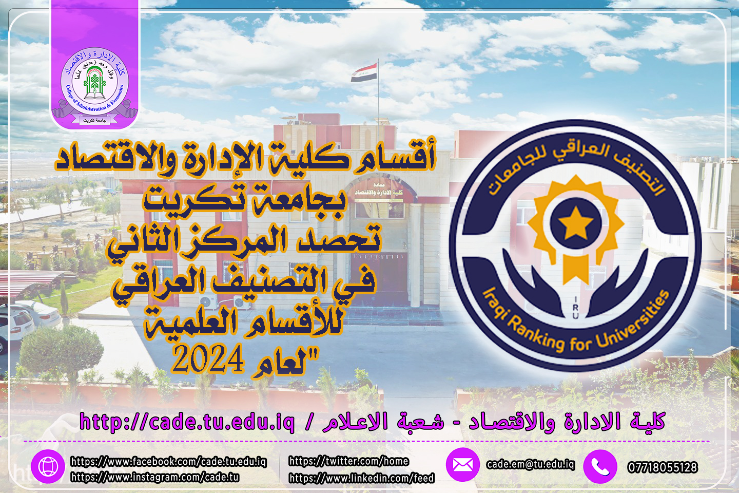 حققت أقسام كلية الإدارة والاقتصاد في جامعة تكريت إنجازًا علمياً مرموقًا ضمن نتائج التصنيف العراقي للأقسام العلمية لعام 2024، حيث حصلت أقسام (الاقتصاد، إدارة الأعمال، المحاسبة، والإدارة العامة) على المركز الثاني إضافة على حصول قسم العلوم المالية والمصرفية على المركز الرابع على مستوى كليات الإدارة والاقتصاد في العراق.