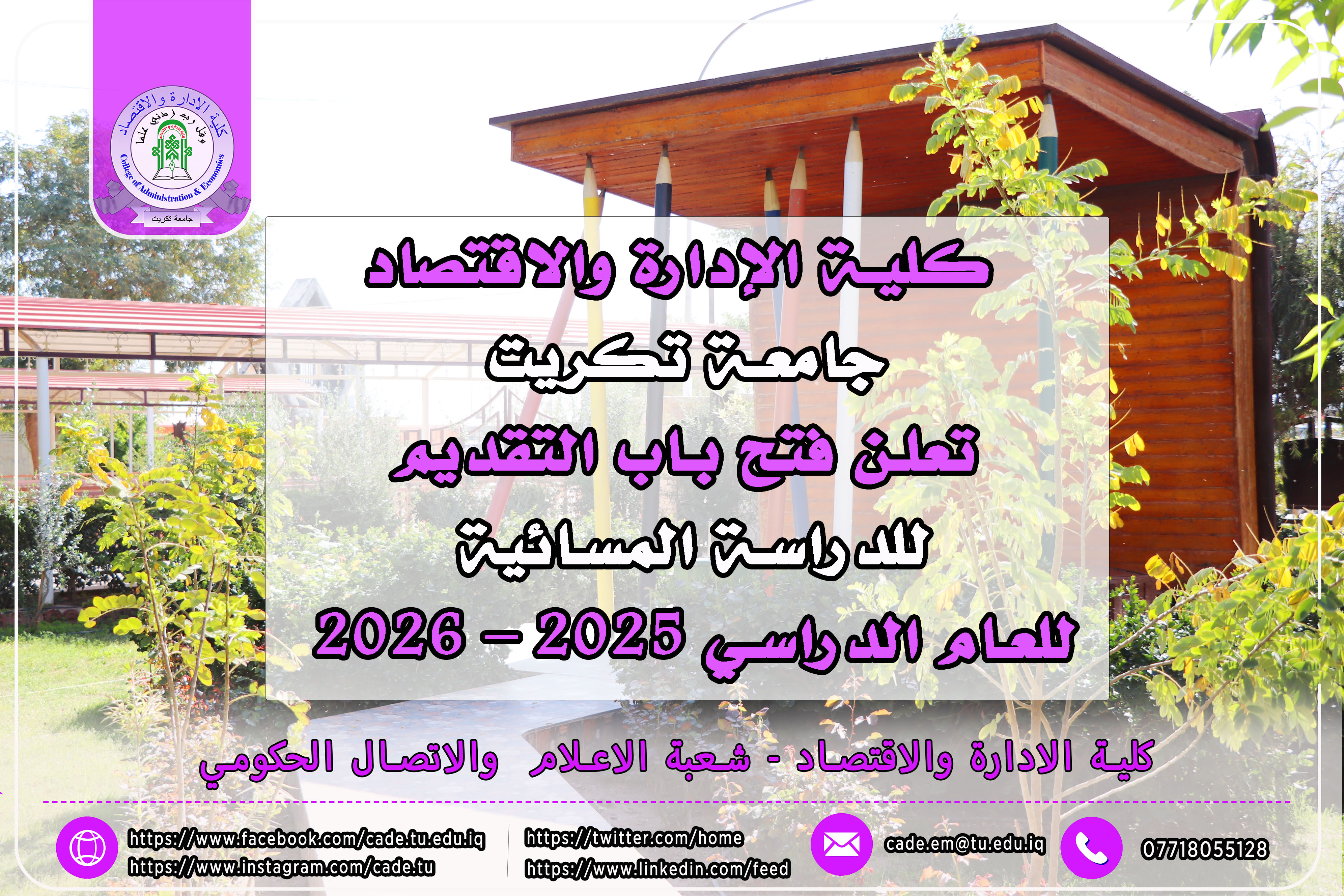 تعلن عمادة كلية الإدارة والاقتصاد في جامعة تكريت عن فتح باب التقديم للقبول في الدراسة المسائية للعام الدراسي (2025 – 2026)، وذلك للطلبة من خريجي الفروع: العلمي، الأدبي، الفرع التجاري ، على أن لا يقل معدل القبول عن (60%).