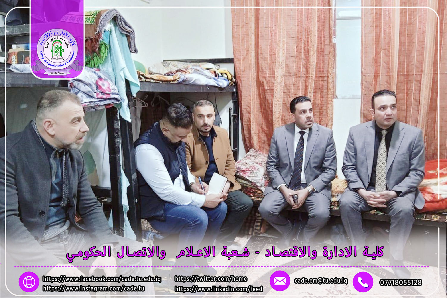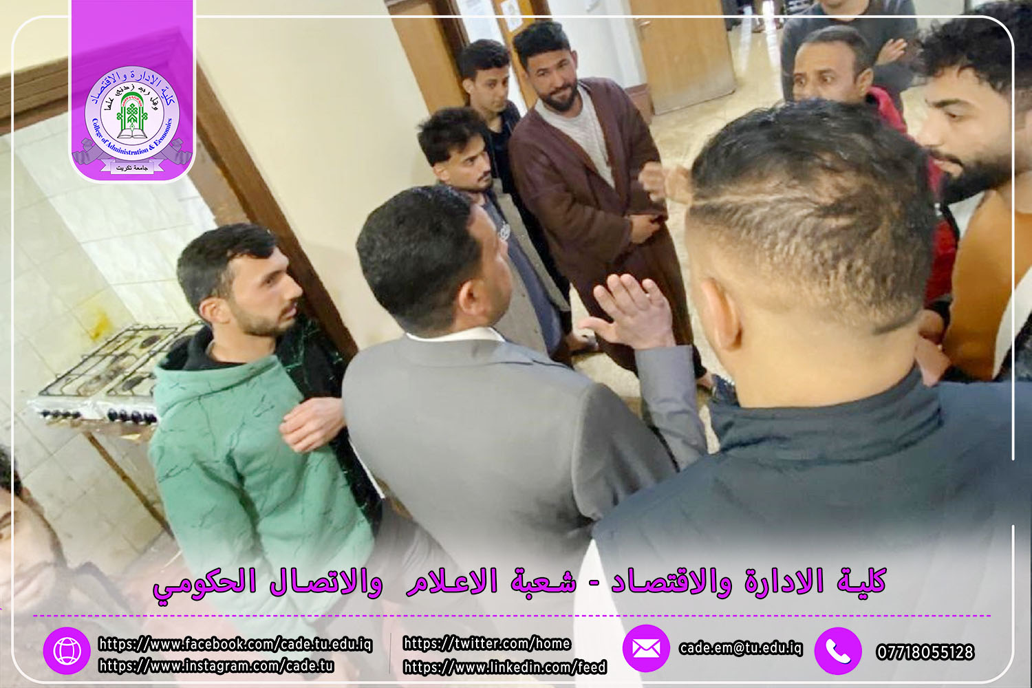 في إطار حرص عمادة كلية الإدارة والاقتصاد على متابعة أوضاع الطلبة في الأقسام الداخلية، وبمناسبة حلول شهر رمضان المبارك، قامت لجنة الإشراف على طلبة الدراسات العليا والأولية بزيارة ميدانية للأقسام الداخلية، وذلك لتفقد الخدمات المقدمة للطلبة والاطلاع على احتياجاتهم.