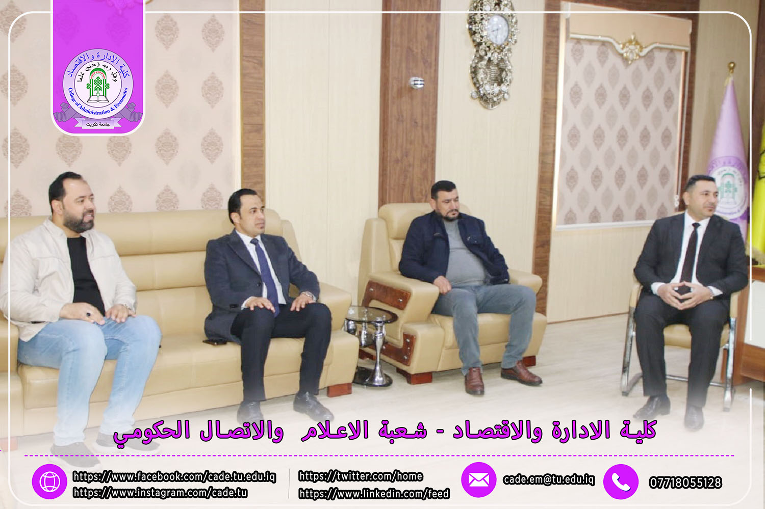 في أجواء تسودها روح التعاون والتقدير، استقبلت عمادة كلية الإدارة والاقتصاد بجامعة تكريت، يوم الأحد الموافق 9 /3/ 2025، مجموعة من الشخصيات الأكاديمية الذين قدموا لتهنئة السيد عميد الكلية أ.م.د. فؤاد فرحان حسين بمناسبة تسنمه مهام منصبه الجديد.