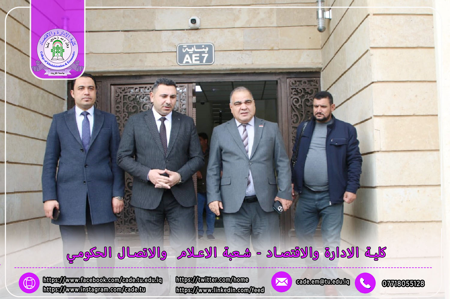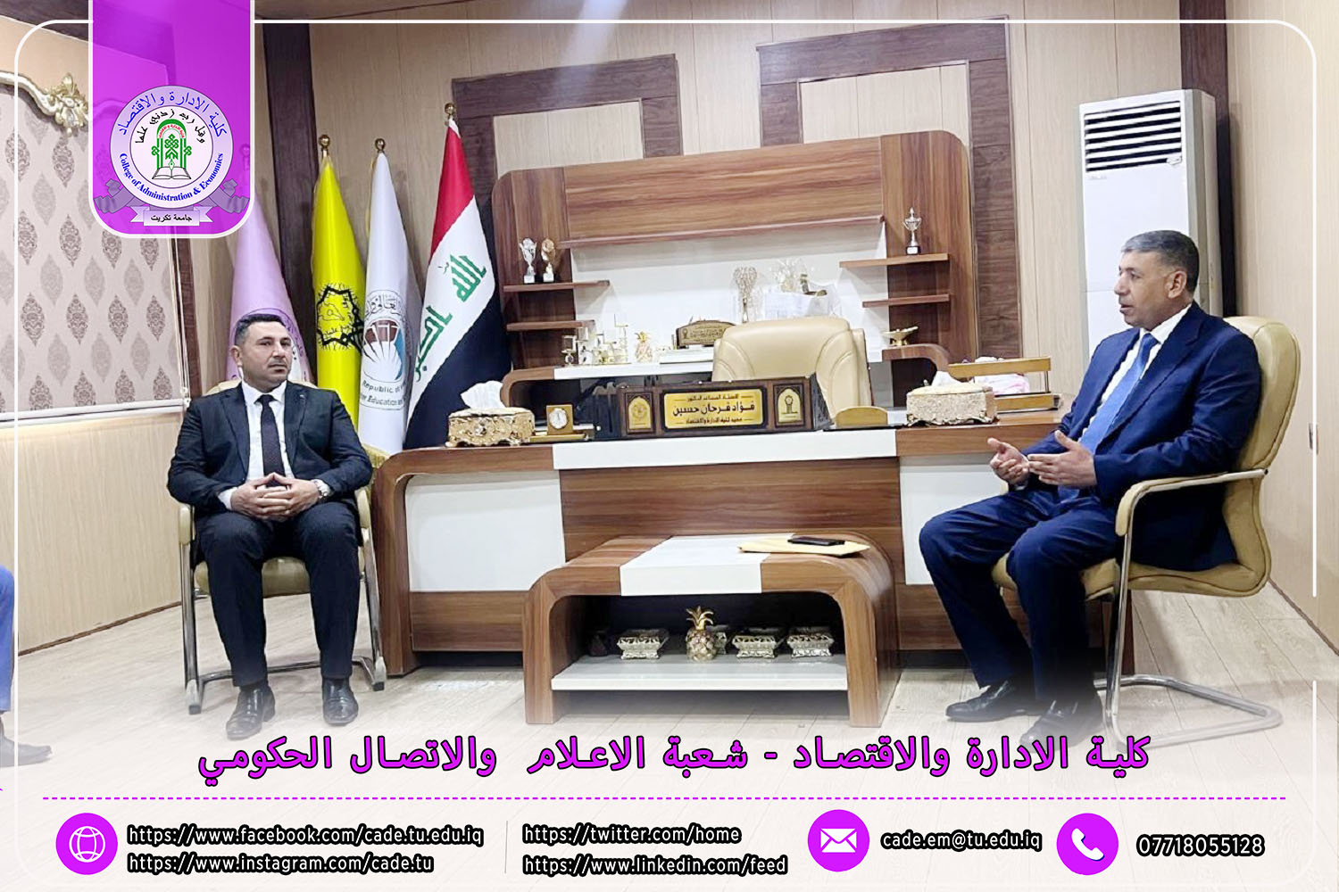 حيث زار السيد الأستاذ الدكتور حسن حسين إبراهيم، مساعد رئيس الجامعة للشؤون العلمية، والأستاذ الدكتور حامد محمد صالح، عميد كلية التربية الأساسية في الشرقاط، والأستاذ الدكتور نجلاء عبد الحسين عليوي، عميدة كلية التربية للبنات، عمادة كلية الإدارة والاقتصاد في جامعة تكريت لتقديم التهاني والتبريكات للسيد العميد أ.م.د. فؤاد فرحان حسين بمناسبة توليه منصبه الجديد.