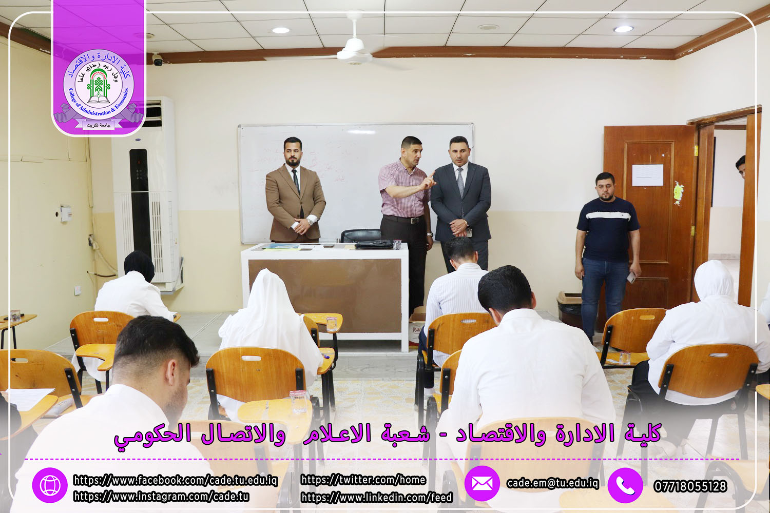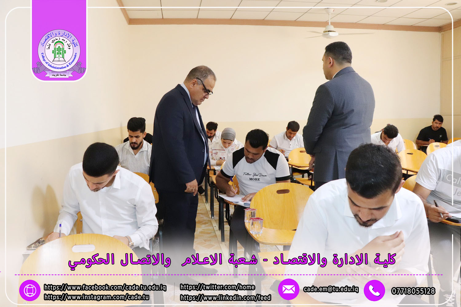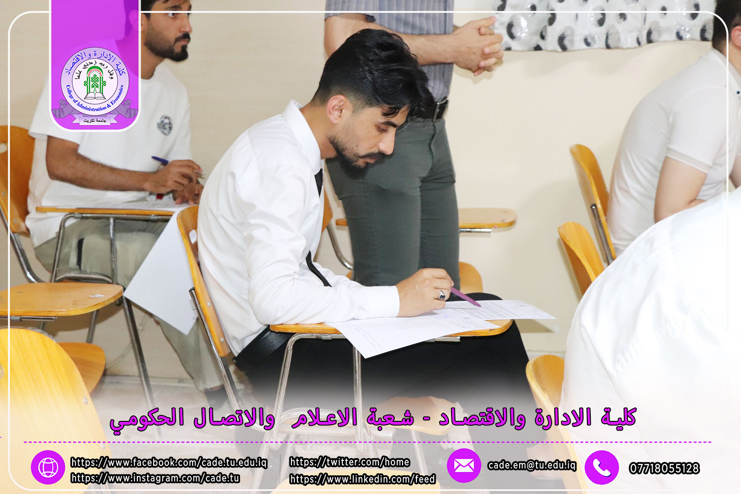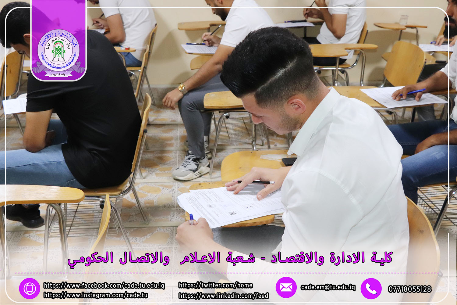شهدت كلية الإدارة والاقتصاد في جامعة تكريت، يوم السبت الموافق 10 /5/ 2025، انطلاق الامتحان التقويمي (الوزاري) لطلبة المرحلتين الثالثة والرابعة في الدراستين الصباحية والمسائية لقسمي إدارة الأعمال والمحاسبة، للفصل الدراسي الثاني / الدور الاول للعام الدراسي 2024-2025، وذلك تنفيذًا لتوجيهات وزارة التعليم العالي والبحث العلمي بشأن تطبيق الامتحانات التقويمية المركزية.
