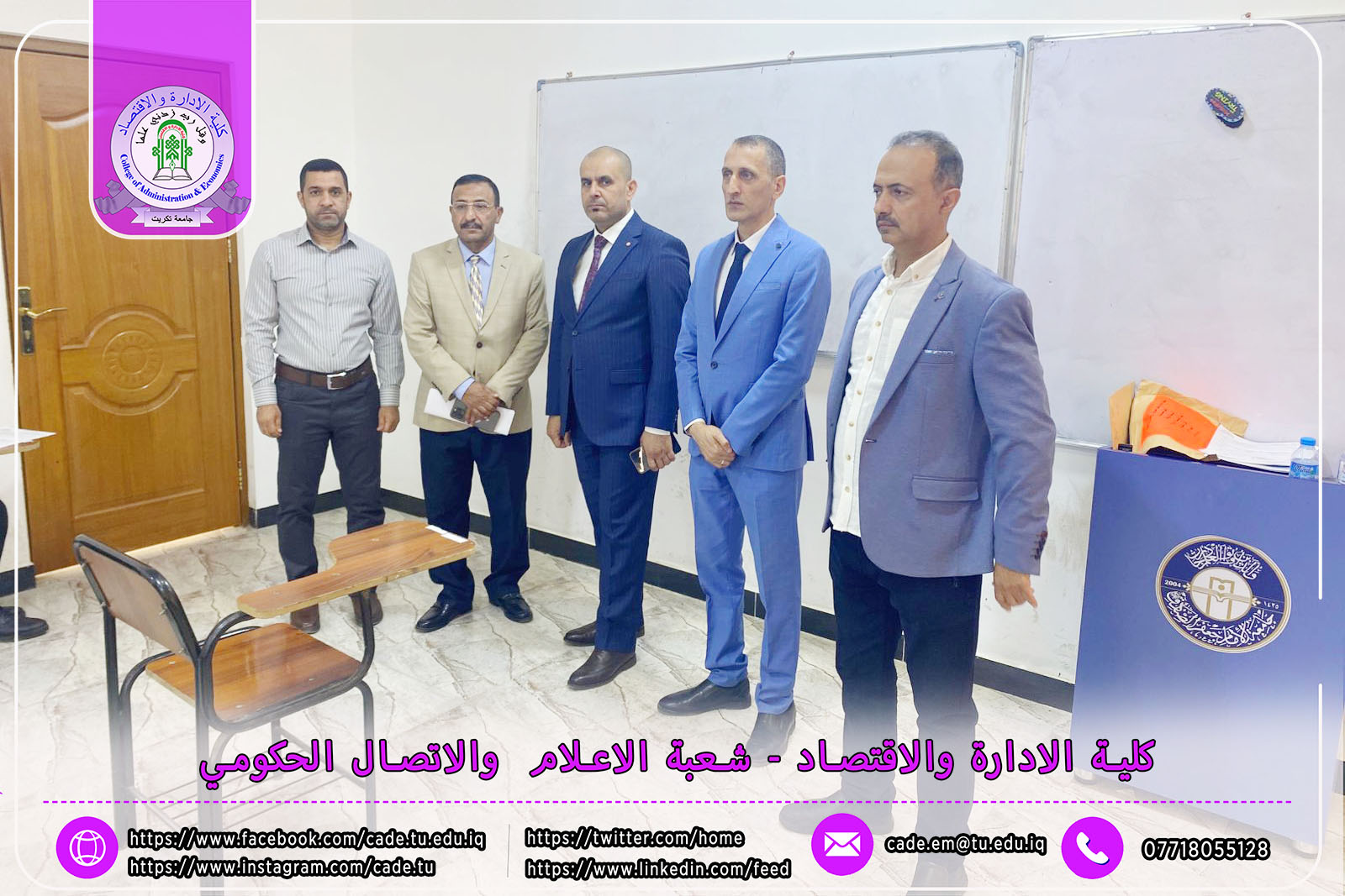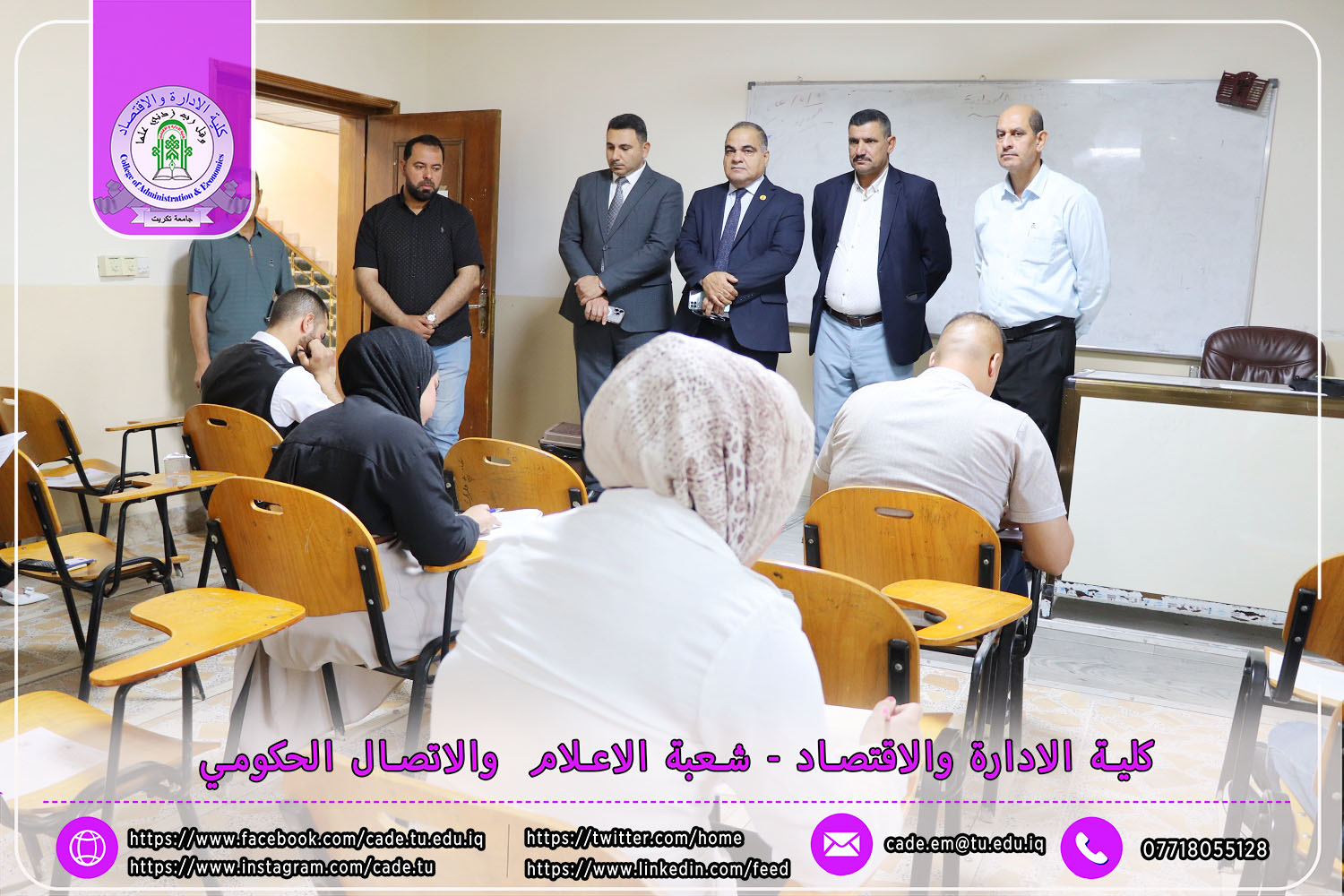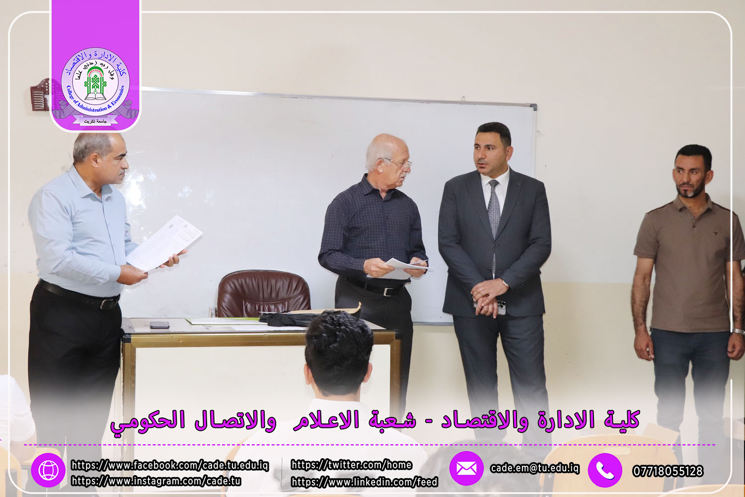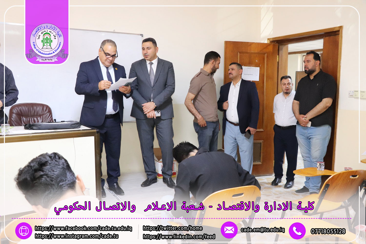 وفي هذا السياق، أجرى السيد عميد الكلية، الأستاذ المساعد الدكتور فؤاد فرحان حسين، يرافقه معاون العميد للشؤون الإدارية والمالية، المدرس أحمد عايد مخلف، جولة تفقدية شملت عددًا من القاعات الامتحانية للاطلاع على مجريات الامتحان، ومدى التزام الطلبة بالتعليمات والضوابط الامتحانية المعتمدة. وقد أثنى السيد العميد على جهود الكوادر التدريسية والفنية التي ساهمت في تنظيم الامتحان وتهيئة بيئة مناسبة لأدائه بسلاسة وانتظام.