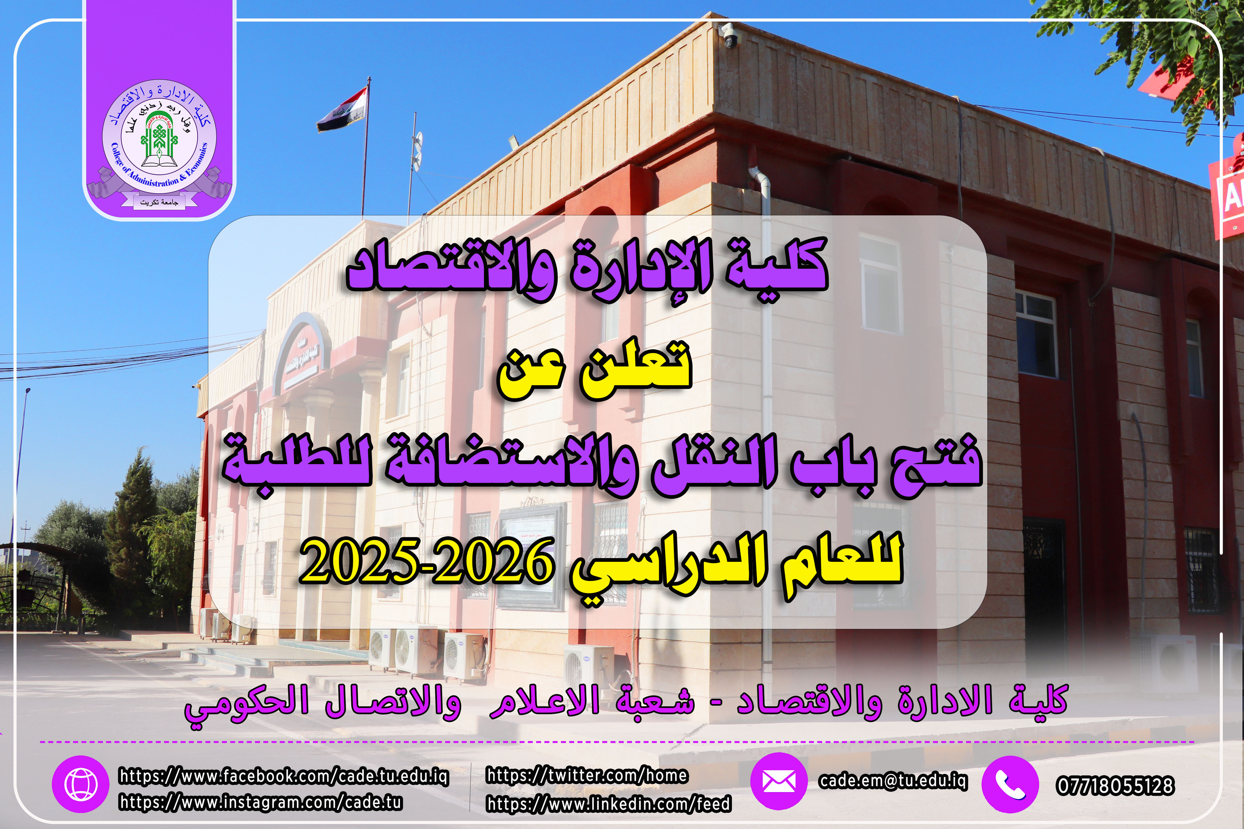 تعلن كلية الإدارة والاقتصاد في جامعة تكريت عن فتح باب التقديم للنقل والاستضافة لطلبة الدراسات الأولية للدراستين ( الصباحية والمسائية) للعام الدراسي 2025-2026، وذلك استناداً كتاب وزارة التعليم العالي والبحث العلمي / دائرة الدراسات والتخطيط والمتابعة / القبول المركزي ذي العدد ت م 5 / 8059 بتاريخ 2025/7/10.