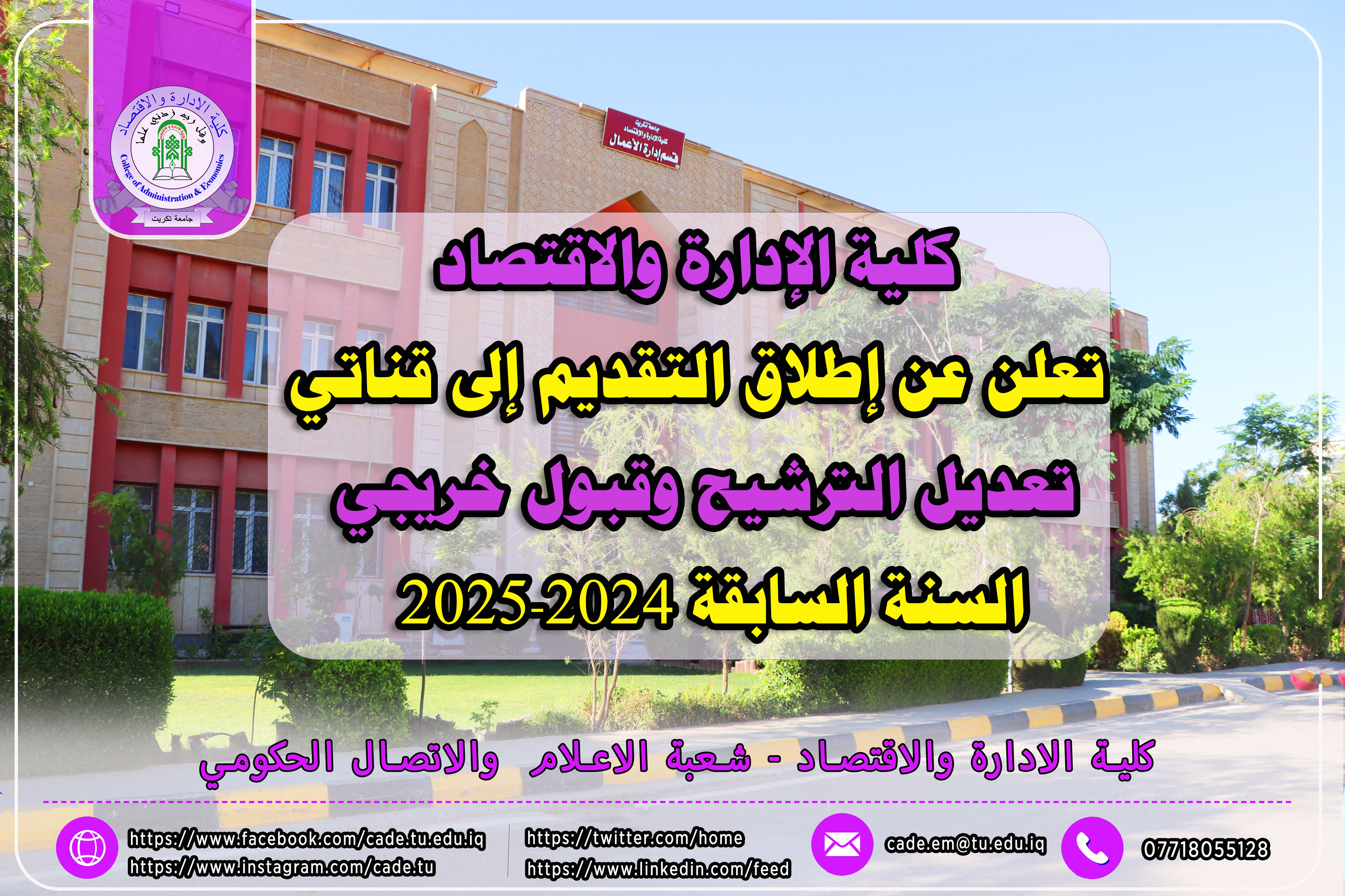 تعلن كلية الإدارة والاقتصاد – جامعة تكريت إلى طلبتها الأعزاء، بأن وزارة التعليم العالي والبحث العلمي قد أطلقت نافذة التقديم الإلكتروني إلى استمارتي قناة تعديل الترشيح وقبول خريجي السنة السابقة (2023–2024)، ويشمل ذلك القناتين العامة وذوي الشهداء.