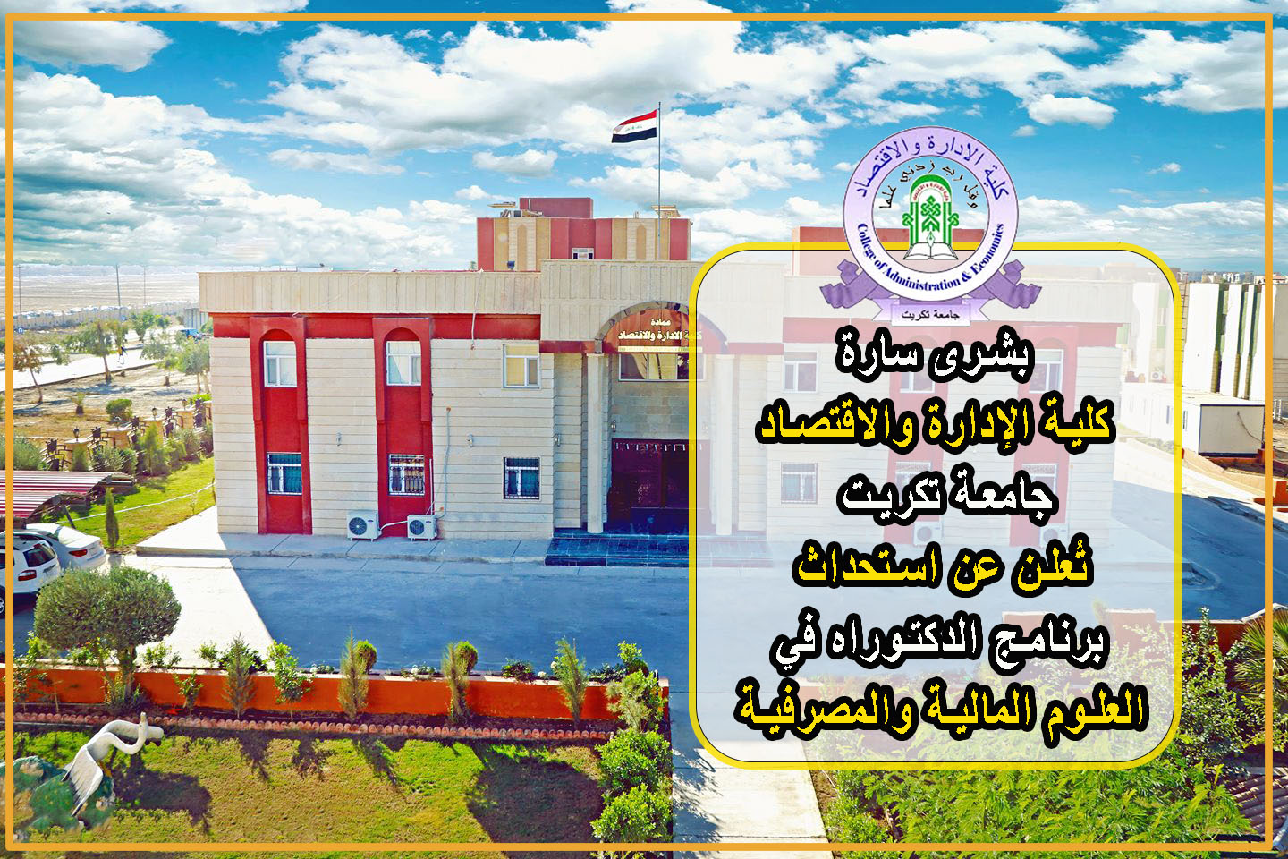 بكل فخر وسرور، تزف عمادة كلية الإدارة والاقتصاد – جامعة تكريت إلى طلبة الدراسات العليا خبر استحداث برنامج الدكتوراه في تخصص (العلوم المالية والمصرفية) / قسم العلوم المالية والمصرفية، وذلك استناداً إلى مصادقة وزارة التعليم العالي والبحث العلمي / دائرة البحث والتطوير / قسم الدراسات العليا، بموجب كتابها ذي العدد (ب ت 5 / 3807) بتاريخ 26/3/2025، والذي تضمن الموافقة الرسمية على استحداث هذا البرنامج الأكاديمي.