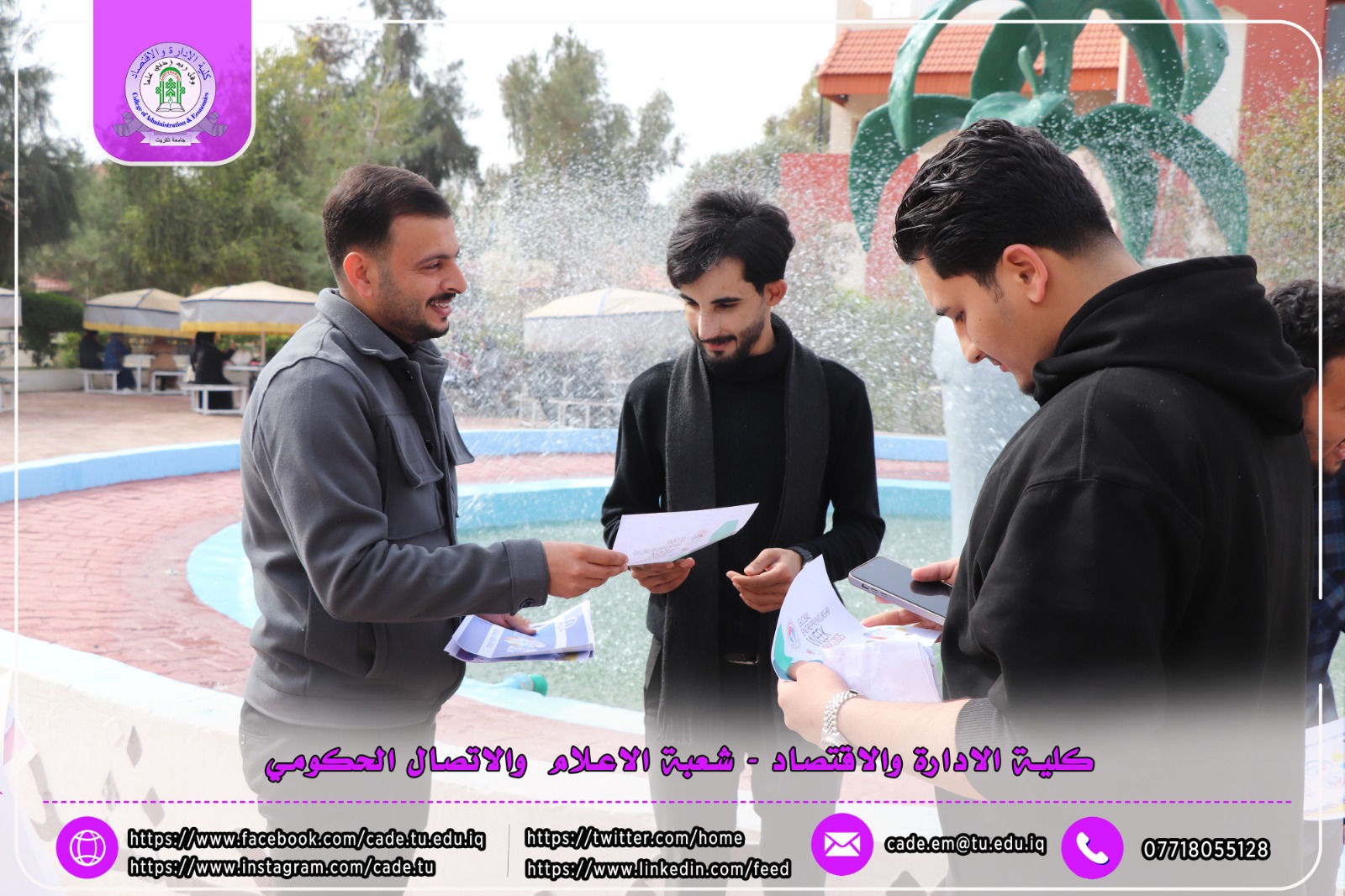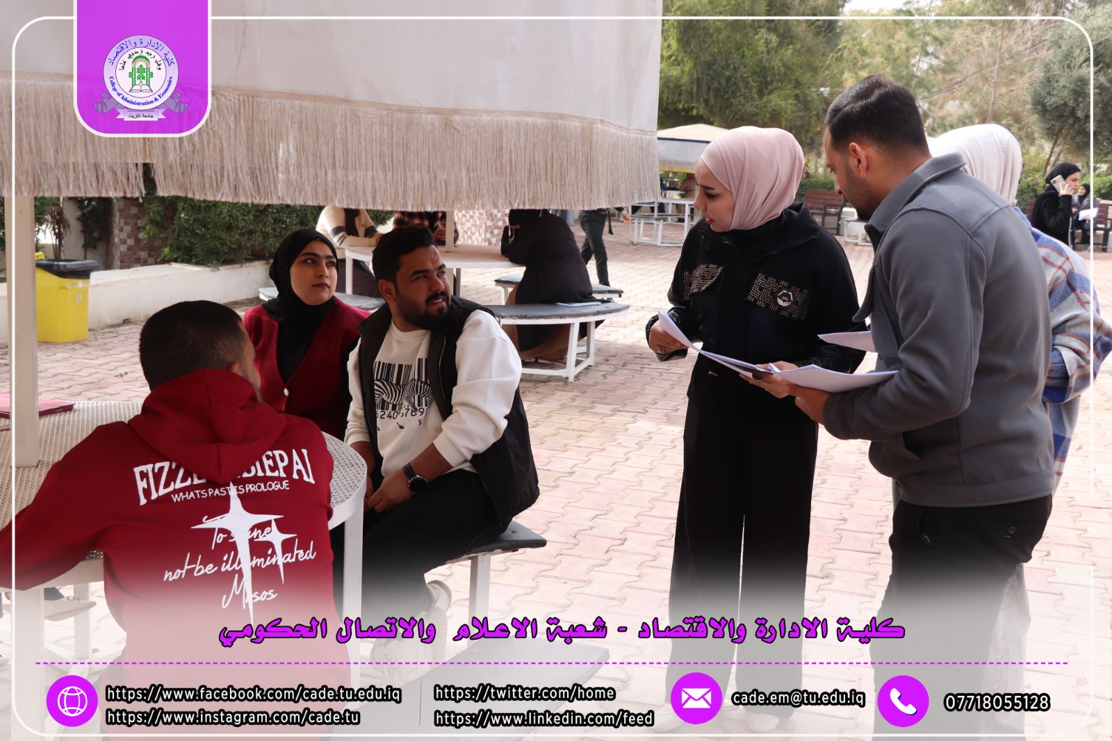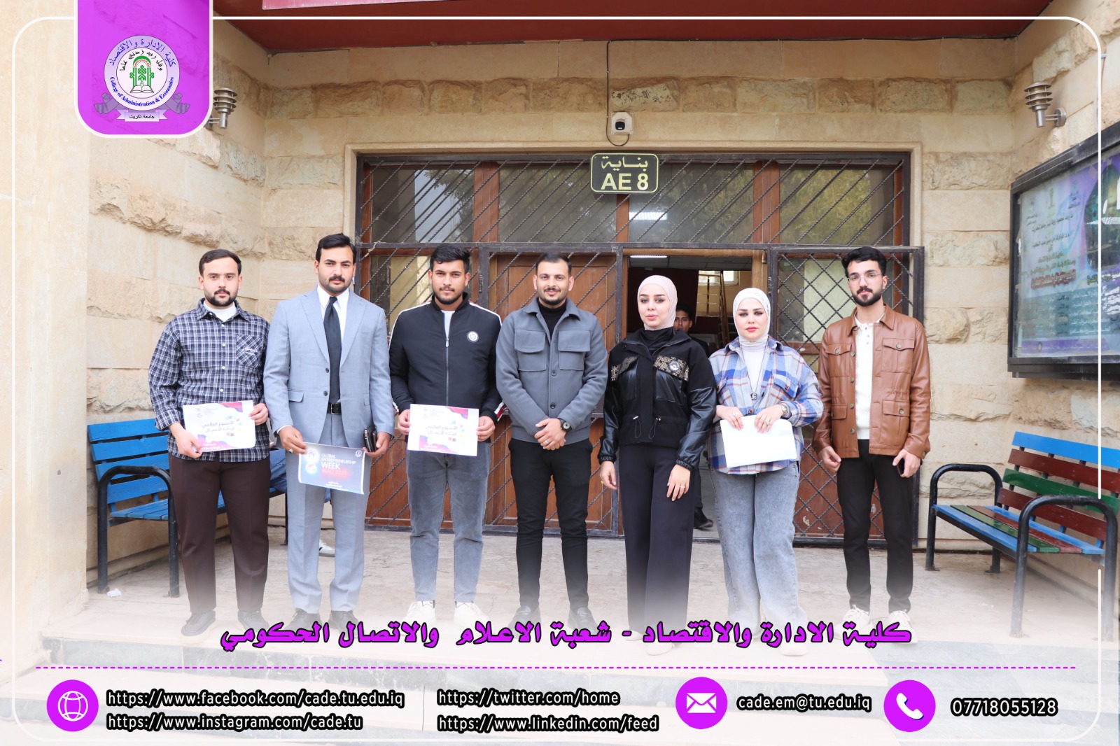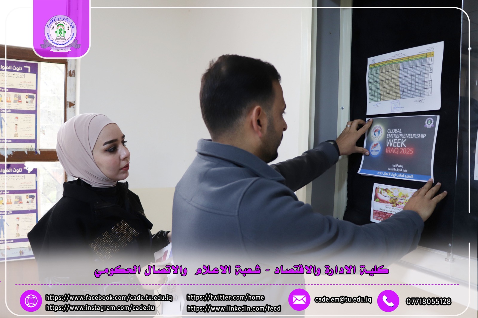 ضمن فعاليات الأسبوع العالمي لريادة الأعمال، نظّمت شعبة الشؤون العلمية في كلية الإدارة والاقتصاد وبالتعاون مع شعبة الإعلام والاتصال الحكومي حملة توعوية داخل أروقة الكلية، تمثّلت في نشر وتوزيع بوسترات تعريفية وتثقيفية بين الطلبة تهدف إلى تعزيز ثقافة ريادة الأعمال وتشجيع المبادرات الطلابية الإبداعية.