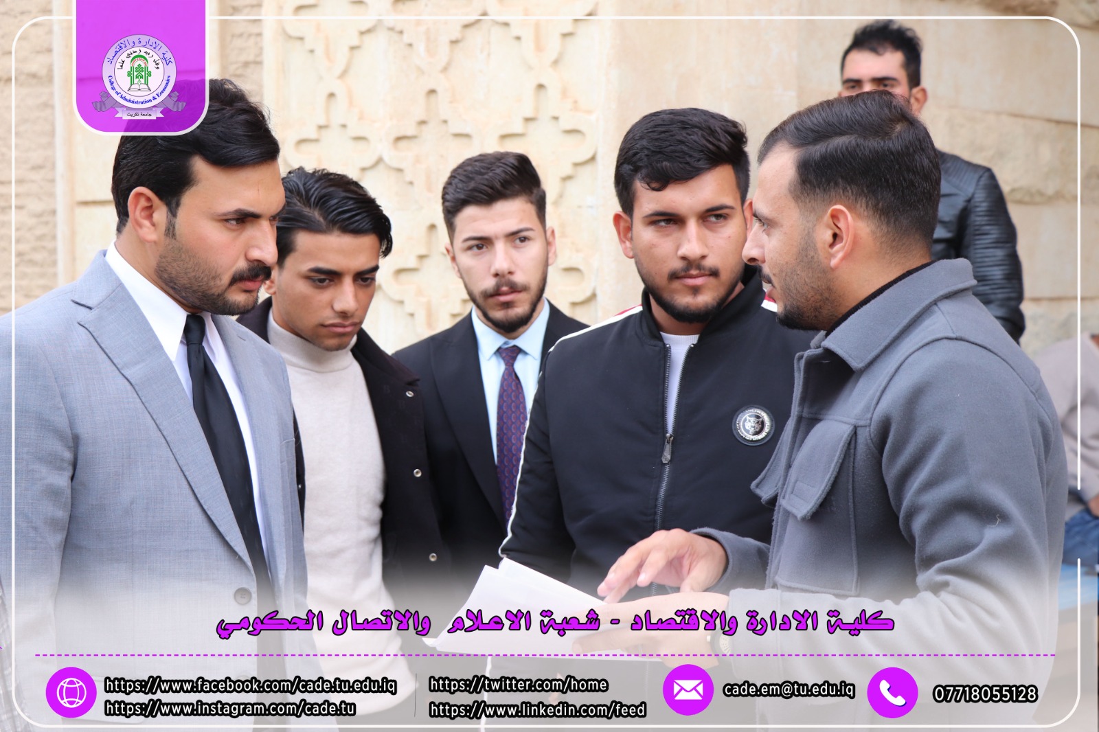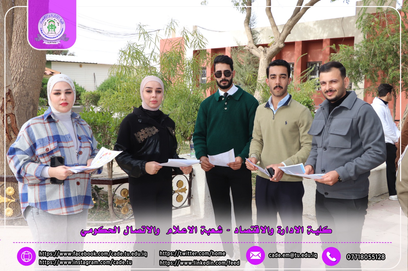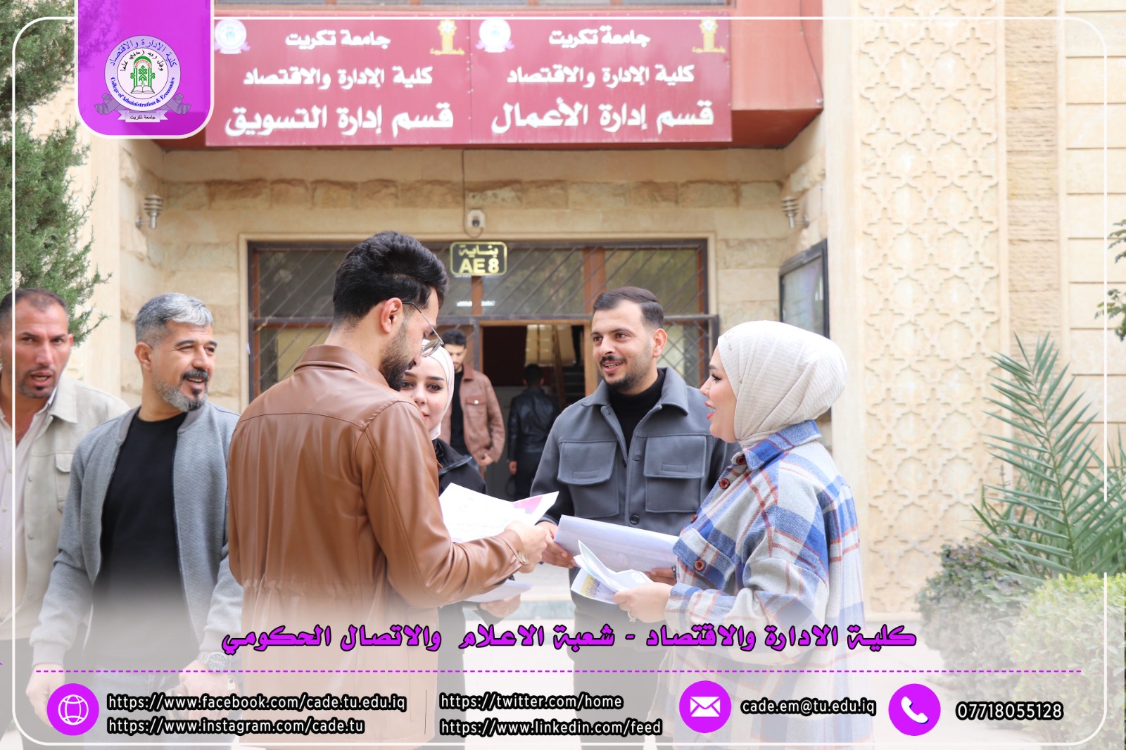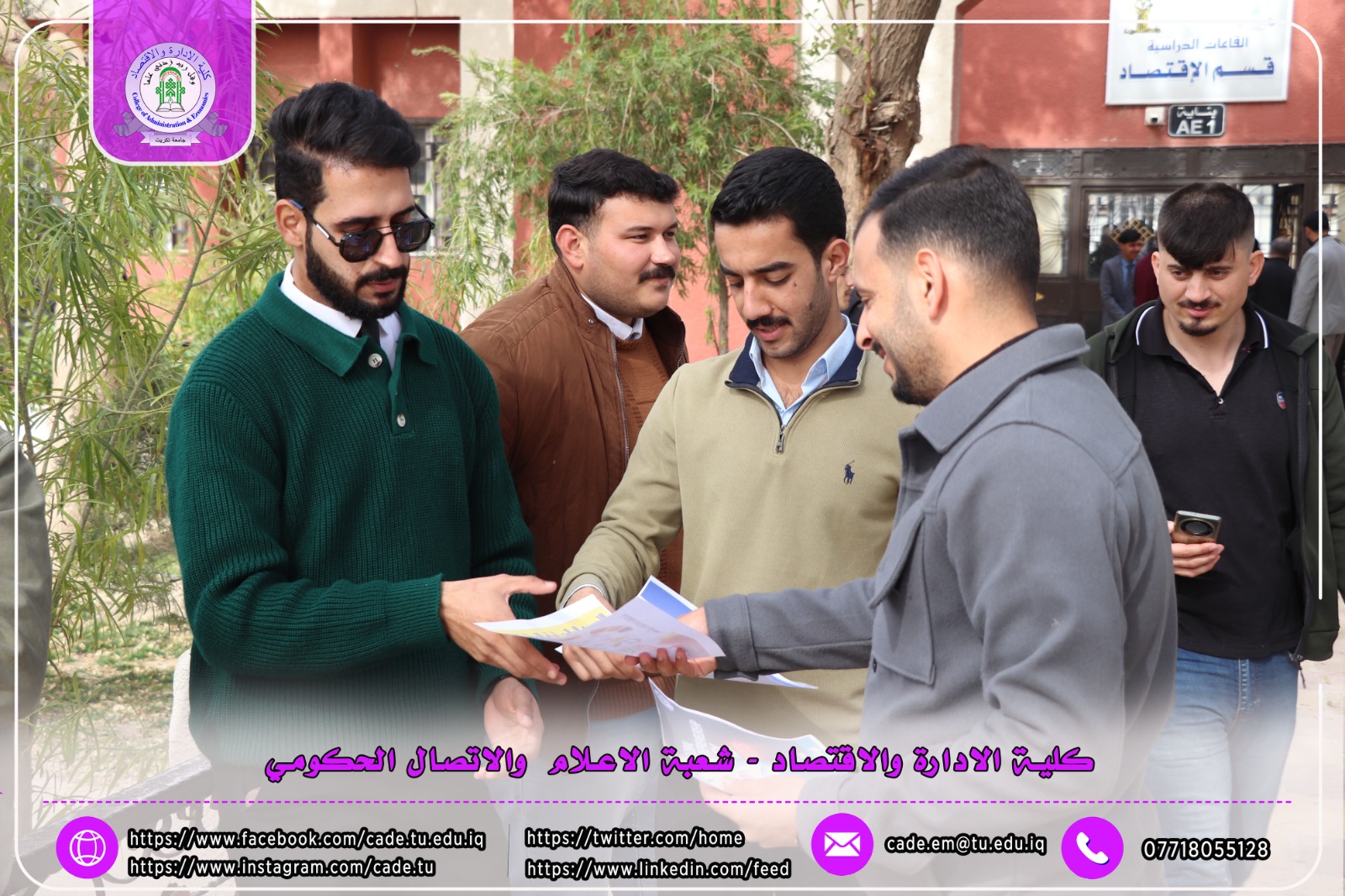 ضمن فعاليات الأسبوع العالمي لريادة الأعمال، نظّمت شعبة الشؤون العلمية في كلية الإدارة والاقتصاد وبالتعاون مع شعبة الإعلام والاتصال الحكومي حملة توعوية داخل أروقة الكلية، تمثّلت في نشر وتوزيع بوسترات تعريفية وتثقيفية بين الطلبة تهدف إلى تعزيز ثقافة ريادة الأعمال وتشجيع المبادرات الطلابية الإبداعية.