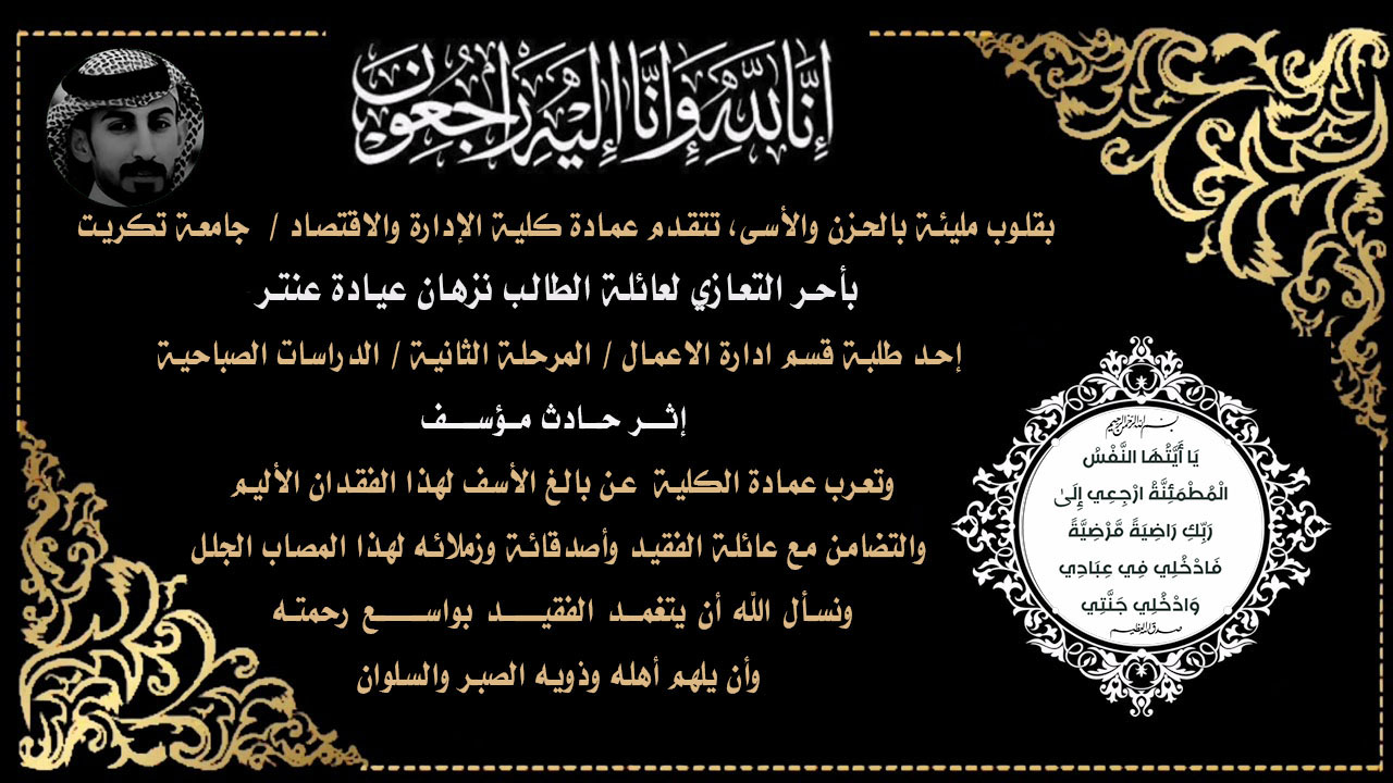 بقلوب مليئة بالحزن والأسى، تتقدم عمادة كلية الإدارة والاقتصاد / جامعة تكريت بأحر التعازي لعائلة الطالب نزهان عيادة عنتر