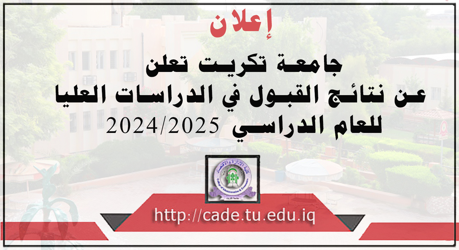 حسب توجيهات وزارة التعليم العالي والبحث العلمي وتوجيهات السيد رئيس الجامعة المحترم أ.د. وعد محمود رؤوف أعلنت جامعة تكريت عن نتائج القبول في الدراسات العليا للعام الدراسي 2024/2025 وعلى الرابط التالي: