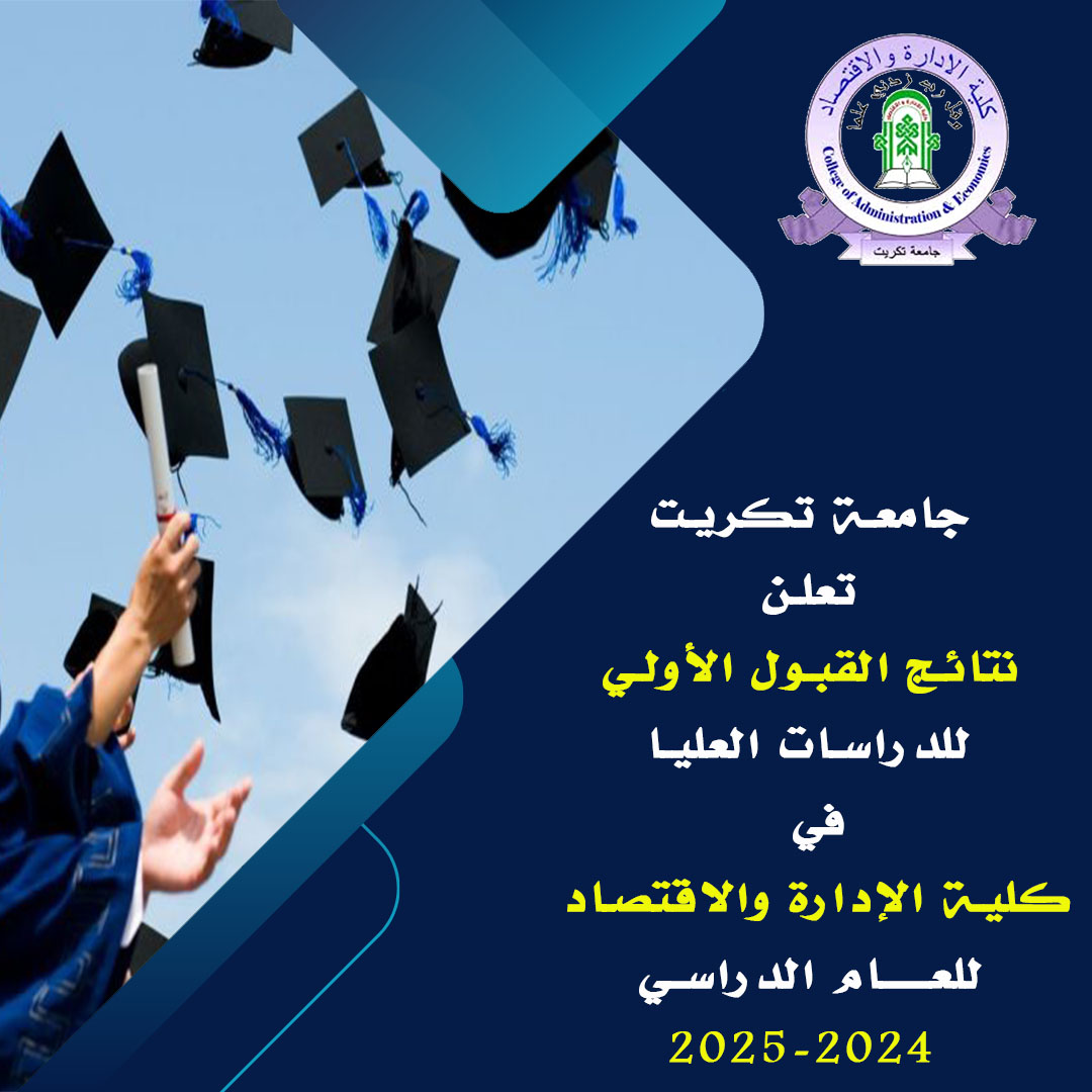 تعلن كلية الإدارة والاقتصاد في جامعة تكريت عن نتائج القبول الأولي للدراسات العليا للعام الدراسي 2024-2025، وذلك استناداً إلى ضوابط التقديم والقبول في الدراسات العليا داخل العراق الصادرة من قبل وزارة التعليم العالي والبحث العلمي / دائرة البحث والتطوير / قسم الدراسات العليا / الفقرة (خامسا / 4).