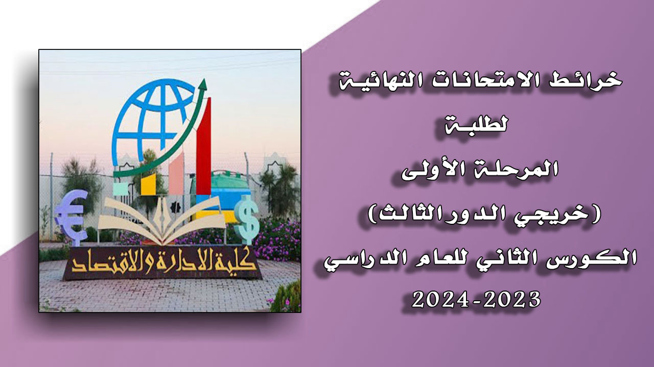 تعلن عمادة كلية الإدارة والاقتصاد / جامعة تكريت عن نشر خرائط الامتحانات النهائية لطلبة المرحلة الأولى من خريجي الدور الثالث للكورس الثاني / الدور الاول الدراسة المسائية للعام الدراسي 2023-2024.